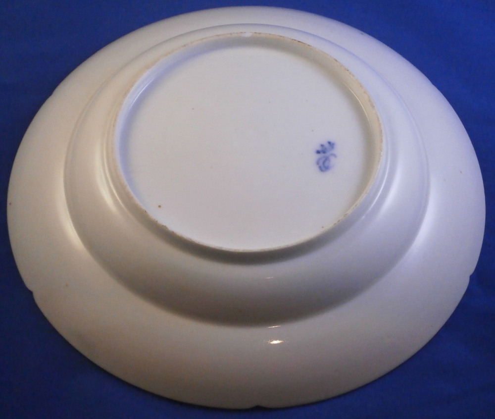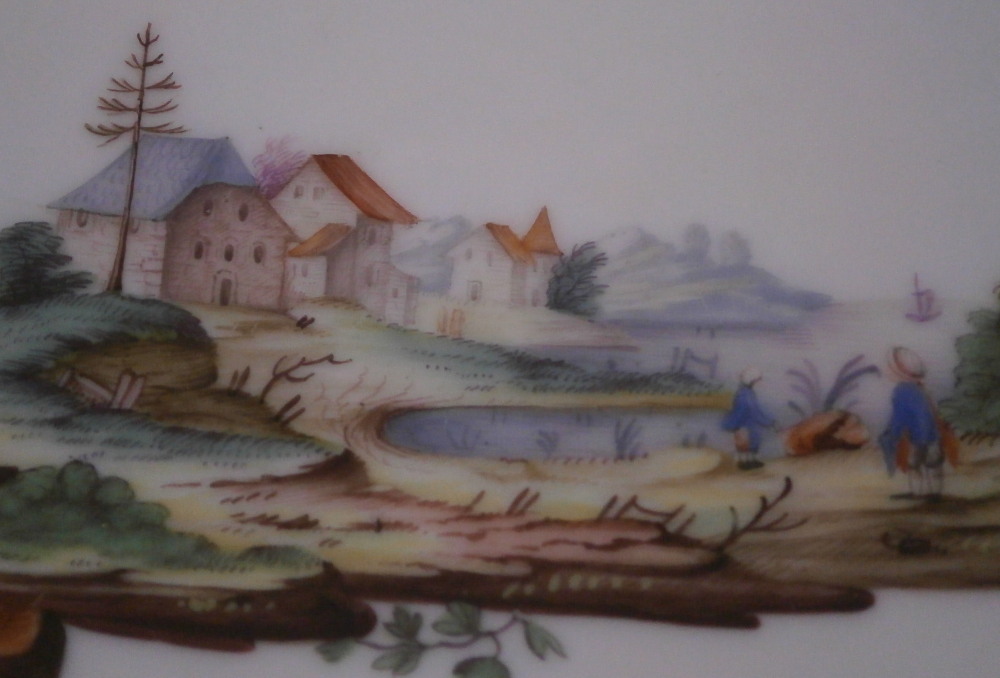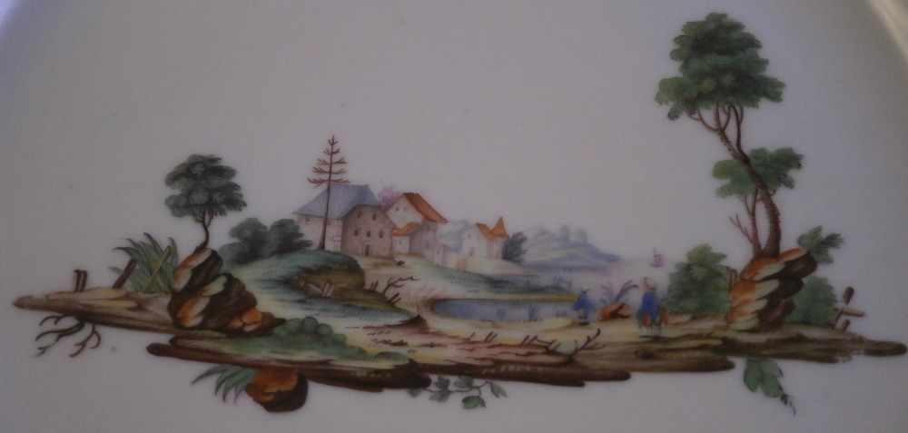 This is a superb and fairly early scenic plate made by Niderviller around 1775. It is hand painted with a superb scene in the center of two people standing by a body of water with a little ship on it in the background and a couple of buildings along its shores. All in a landscape surrounding including two larger trees and some nice rocks. I think the colors of their scenes are among the nicest in the porcelain world and the quality is superb! The rim has three single flowers to it and the edge has since indentations to it to give it that extra flair. The plate is marked with their under glaze blue CC mark under a crown for the Count Custine period I believe was from 1770 until 1784. There is also an incised mark as shown. The piece is 1.75 inches tall and 9.75 inches in diameter. The plate is in great condition with some minor manufacturing flaws in the form of black firing spots most of which were turned into tiny birds along the rim to hide them. A minor chip to the foot ring as shown. It displays perfectly! Please email me for more information or other pictures.
