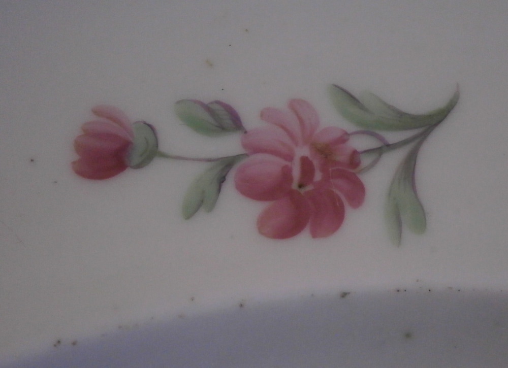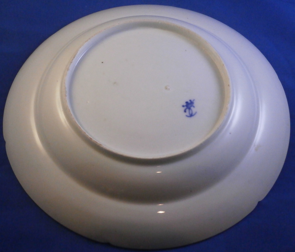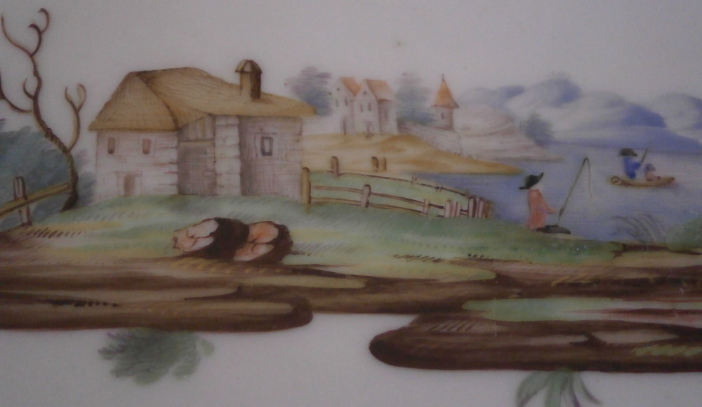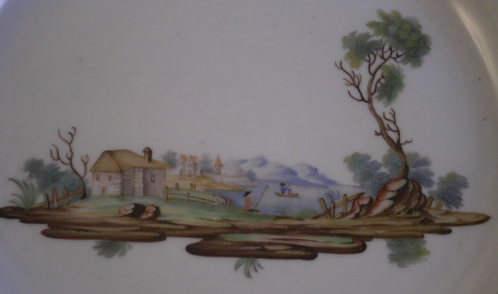 This is a superb and fairly early scenic plate made by Niderviller around 1775. It is hand painted with a superb scene in the center of a gentleman sitting neat a lake fishing with another in a boat on the lake in a landscape surrounding. There is a house with a fence as well as some building in the background and a large tree. I think the colors of their scenes are among the nicest in the porcelain world and the quality is superb! The rim has three single flowers to it and the edge has since indentations to it to give it that extra flair. The plate is marked with their under glaze blue CC mark under a crown for the Count Custine period I believe was from 1770 until 1784. There is also an incised mark as shown. The piece is 1.625 inches tall and 9.5 inches in diameter. The plate is in great condition with some manufacturing flaws near the edge, the largest looks to be a popped glaze bubble or impurity that fired away during the firing process as shown. It displays nicely and these things happen on early porcelain, they are not considered damage but manufacturing flaws. Please email me for more information or other pictures.