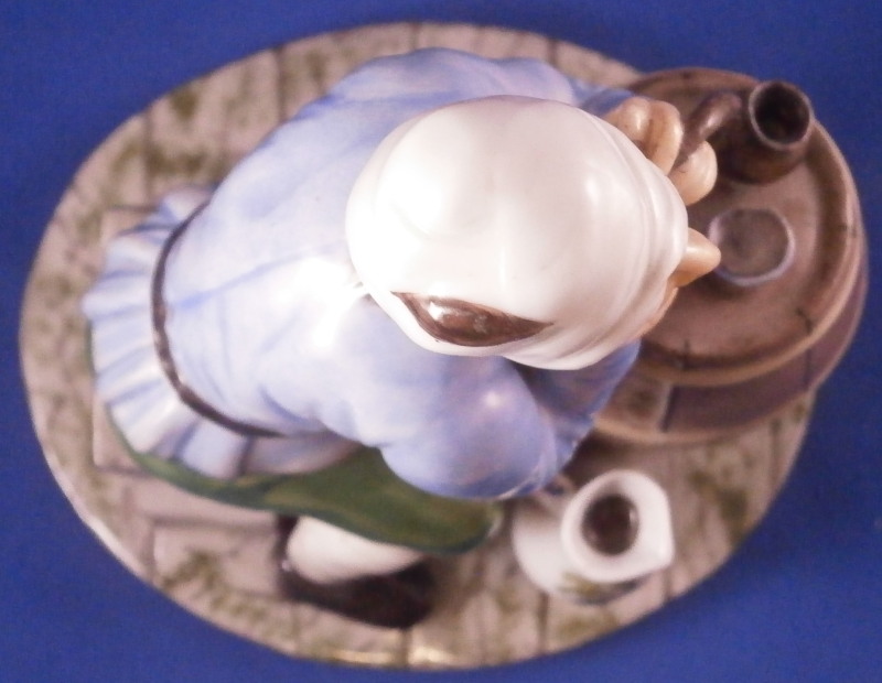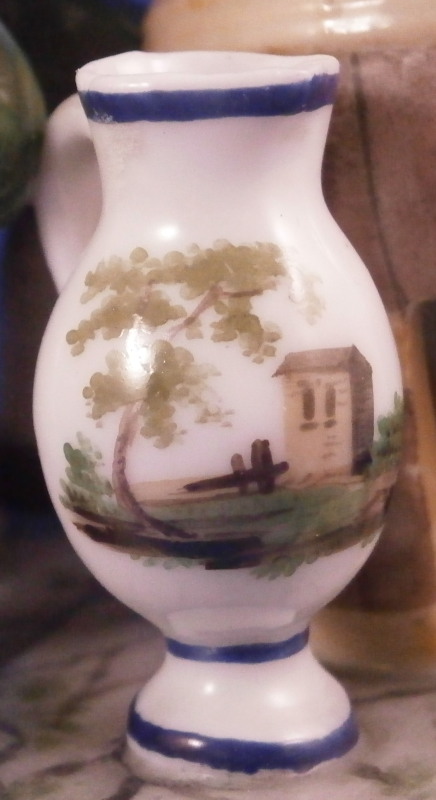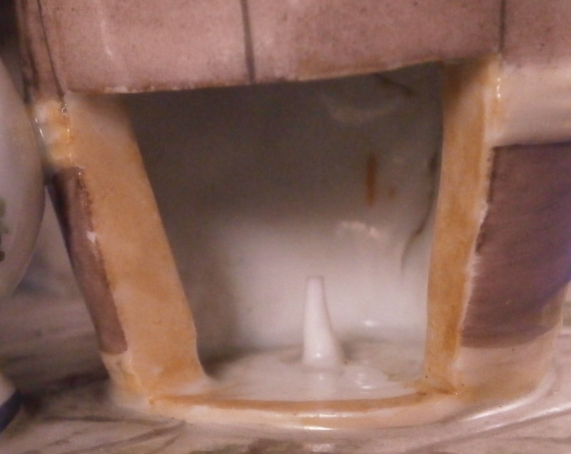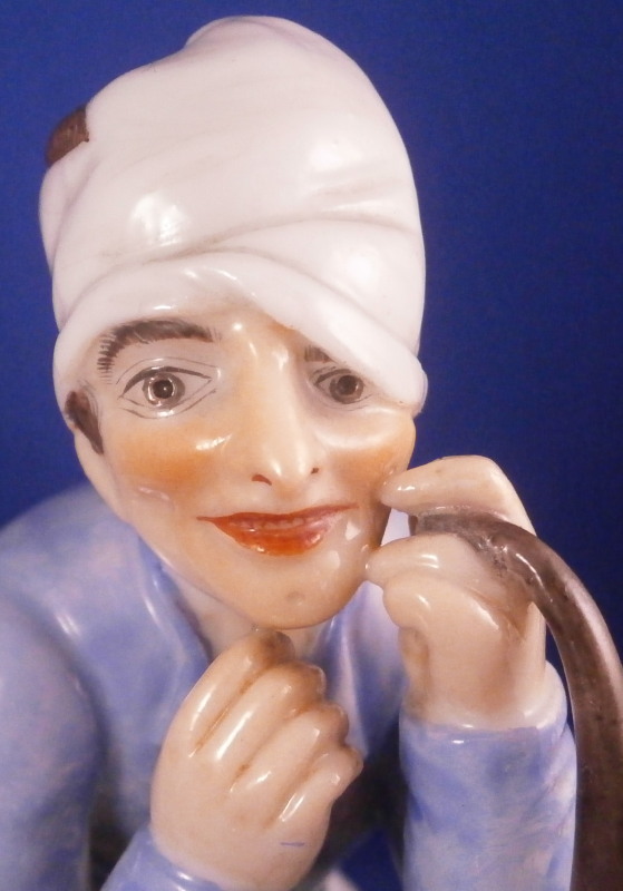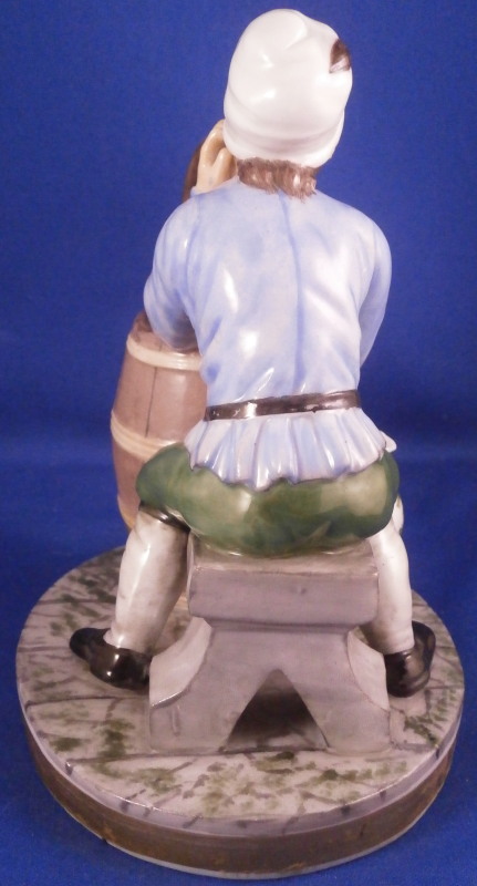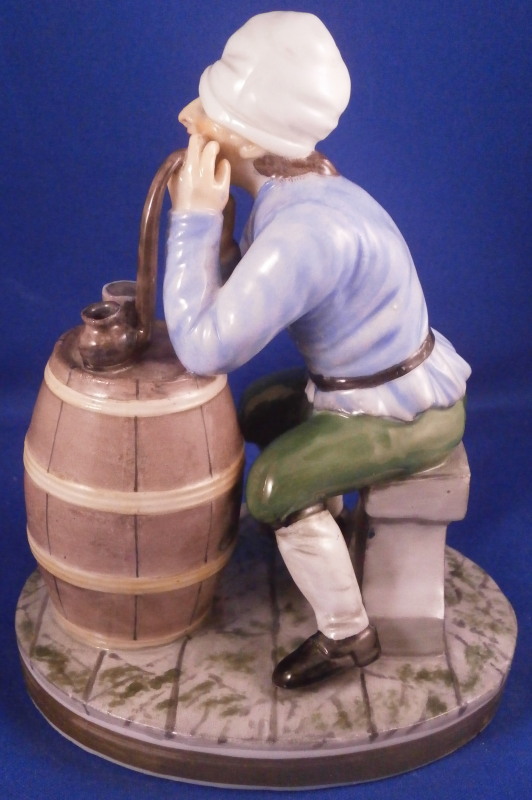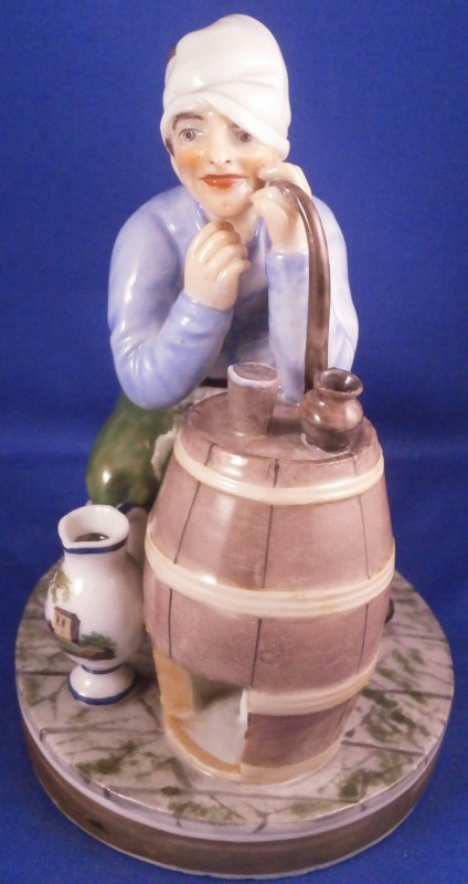 This is a really fun figural pastille or incense burner made by Niderviller around 1800. The figure is of a gentleman having his relaxing afternoon smoke while sitting on a stool and leaning on a barrel which has an opening for the incense to go into and the smoke would come out of the pipe bowl on top. A cup sits on the barrel filled with a drink from the pitcher sitting on the ground. The pitcher is hand painted with a scene typical of Paris porcelain of this period which is awesome. Nice base quite typical of this maker. Not sure about the white cap on top of the gentleman's head - maybe he got hurt? These types of incense burners were used around this time since houses and places often smelled quite badly and the incense was used to cover it up a bit. It is rare to find a figural one and I had never seen one by this maker until I bought a pair a while ago and now this one here. Really quite nice! The piece is in great condition with the pipe going from the bowl to his mouth having been pefectly repaired and the jug has a tiny chip to the side top edge repaired as well. The piece displays perfectly and is just a fun to have around. Will try it out one of these days, too. As is the case with most of their figurines the piece is unmarked except for a red number 1. inside the barrel as shown. The figurine is 6 inches tall, 4.625 inches wide and 3.75 inches deep. Please email me for more information or other pictures.