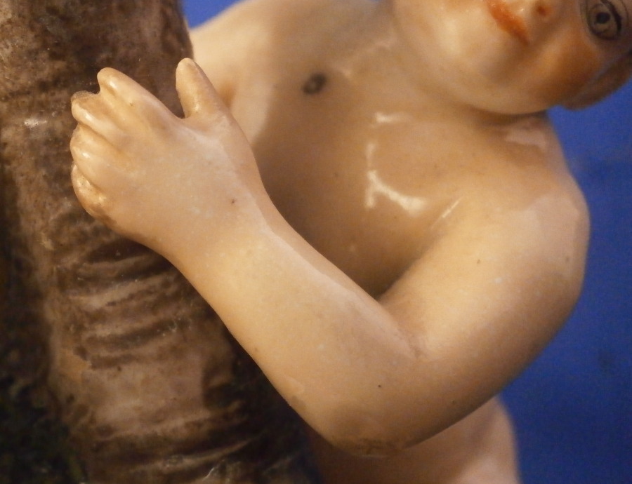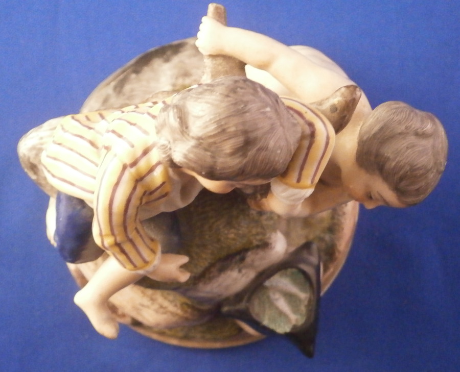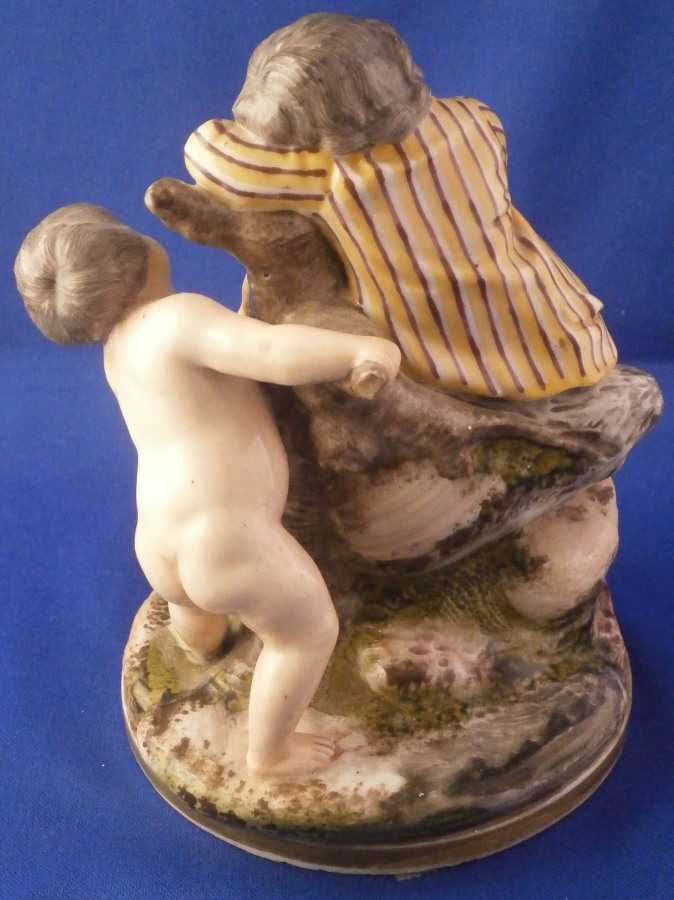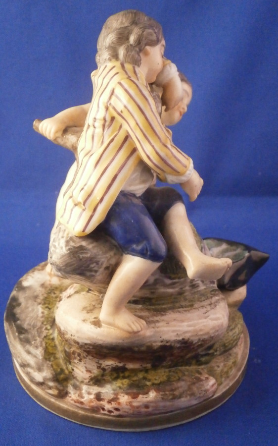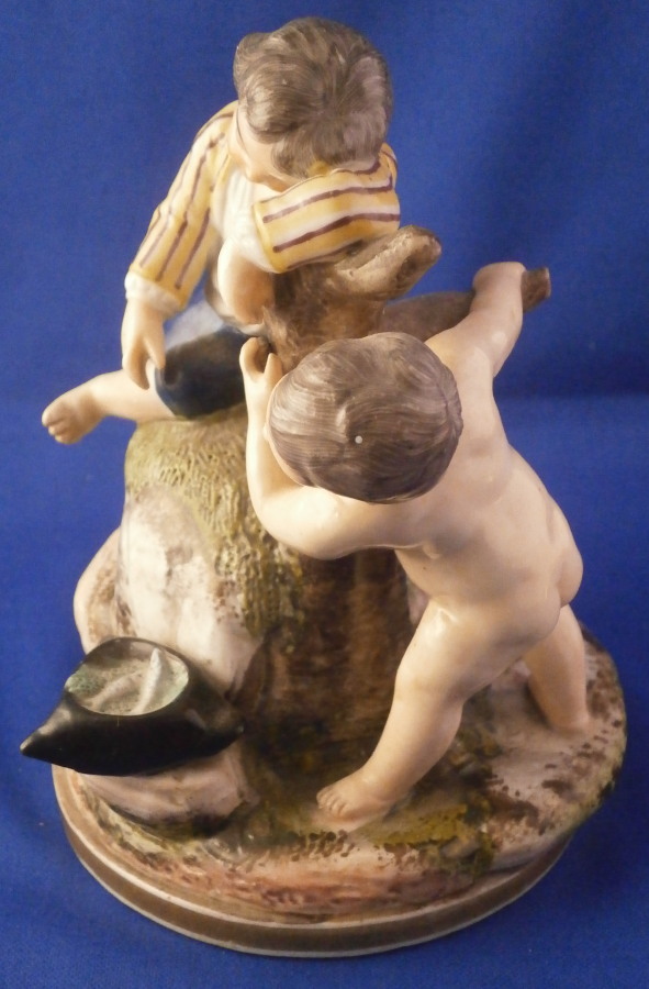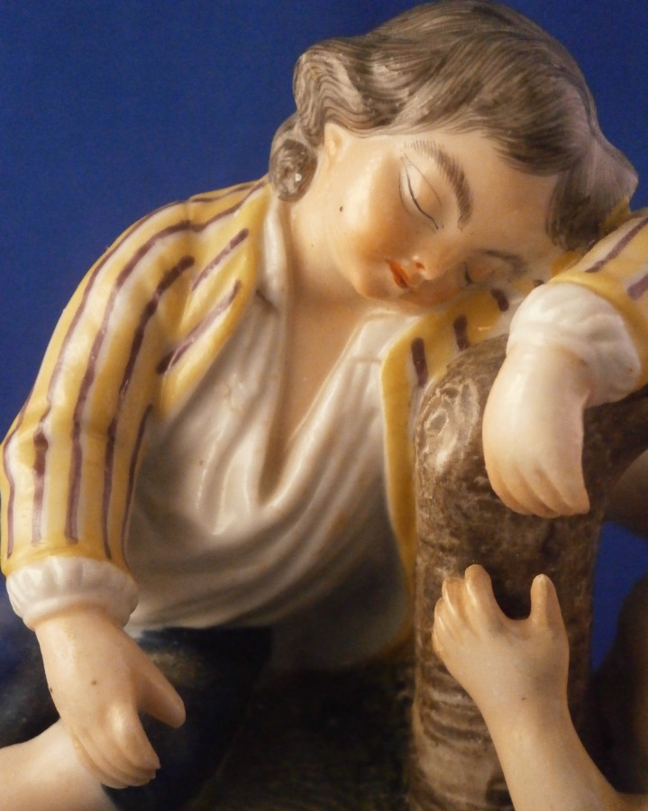 This is a cute figurine of a sleeping gentleman and a nude putto made by Niderviller around 1800. The putto or nude boy is standing next to a tree trunk with the older boy leaning on the tree trunk and taking a nap. A hat filled with two fish is sitting on the rocks in front of them. The figurine is very detailed and painted nicely. There is the typical rock work as the base with the gold trim around the bottom. The piece is extremely solid and heavy being made of one solid piece of porcelain. The figure displays nicely with the top foot of the older boy and the left arm of the child having been nearly invisibly restored. A small chip to the underside edge. It is marked underneath with an incised No 58 and is 5 inches tall and 3.75 inches in diameter on the bottom base. Please email me for more information or other pictures.