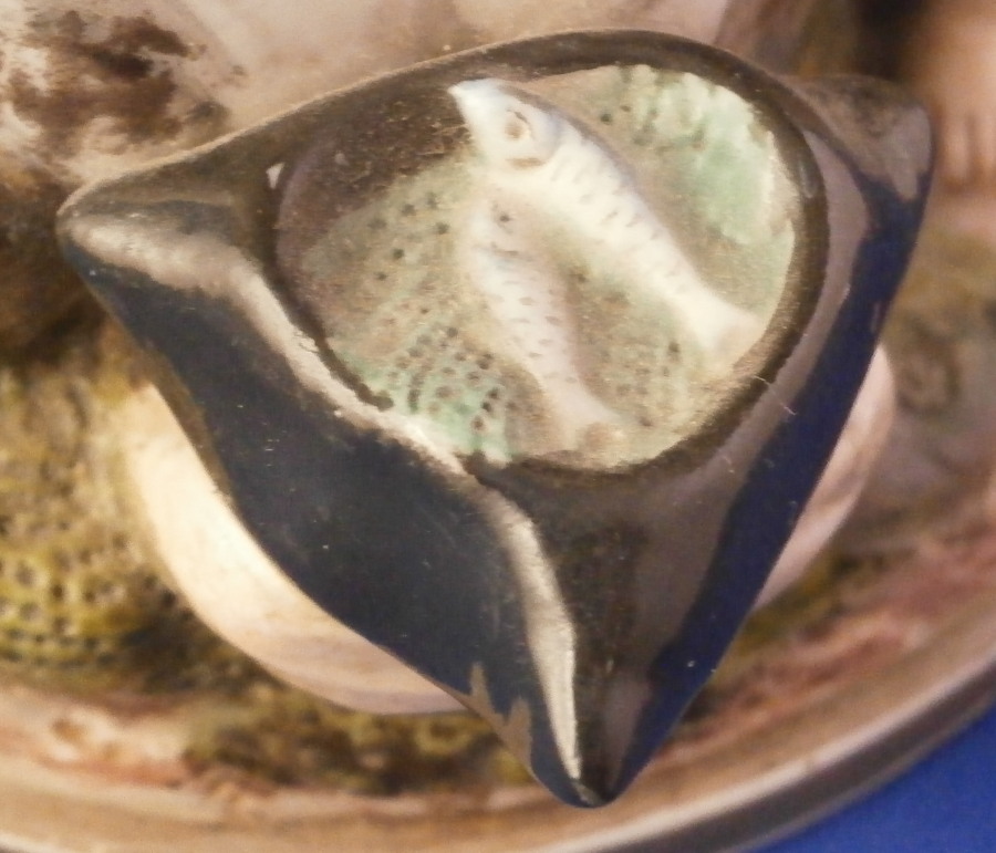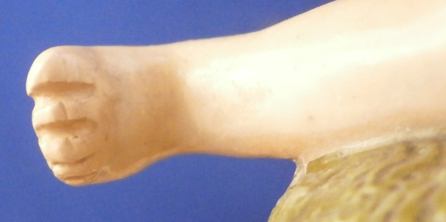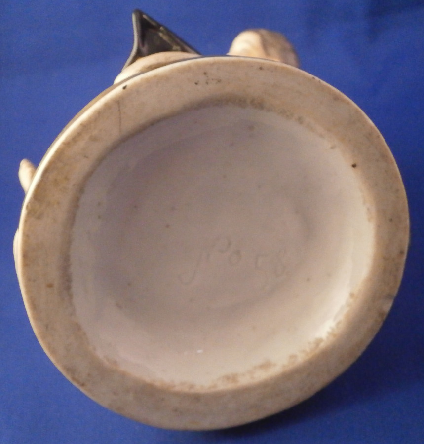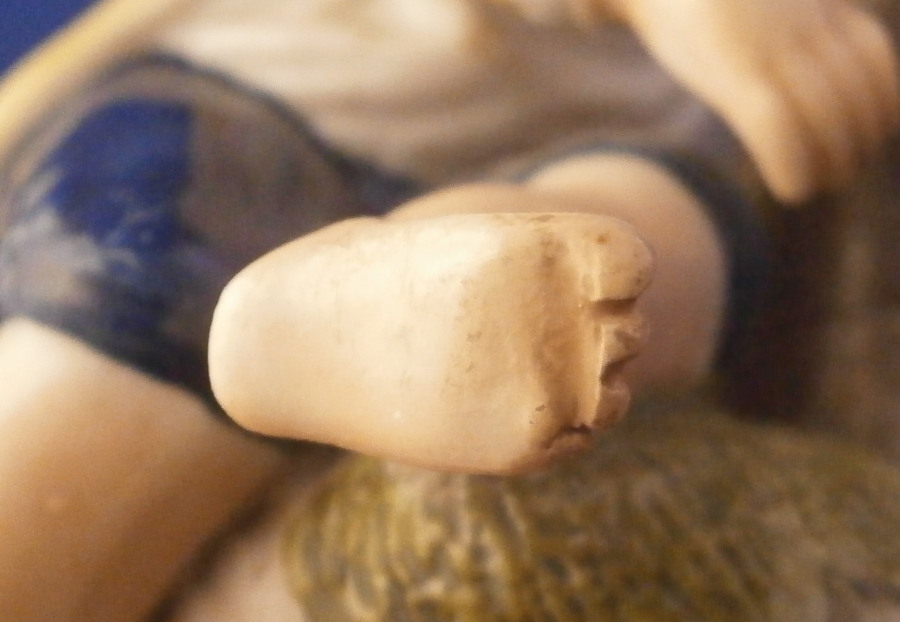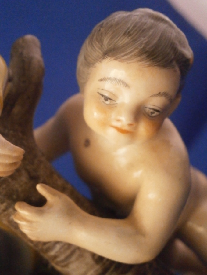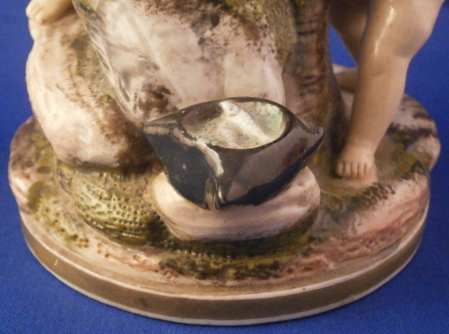 This is a cute figurine of a sleeping gentleman and a nude putto made by Niderviller around 1800. The putto or nude boy is standing next to a tree trunk with the older boy leaning on the tree trunk and taking a nap. A hat filled with two fish is sitting on the rocks in front of them. The figurine is very detailed and painted nicely. There is the typical rock work as the base with the gold trim around the bottom. The piece is extremely solid and heavy being made of one solid piece of porcelain. The figure displays nicely with the top foot of the older boy and the left arm of the child having been nearly invisibly restored. A small chip to the underside edge. It is marked underneath with an incised No 58 and is 5 inches tall and 3.75 inches in diameter on the bottom base. Please email me for more information or other pictures.