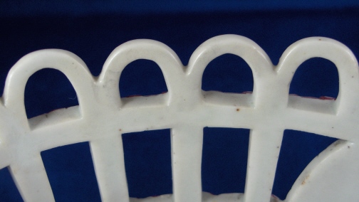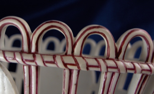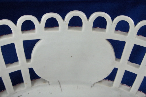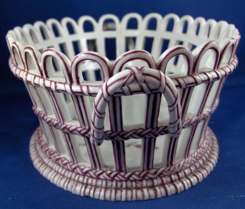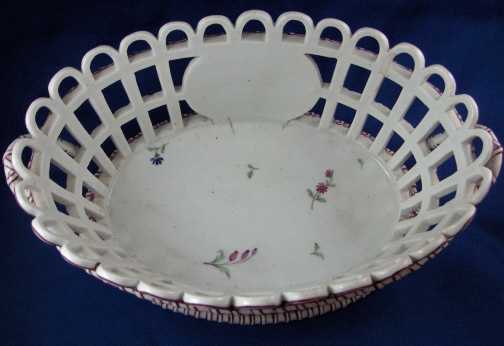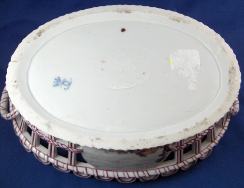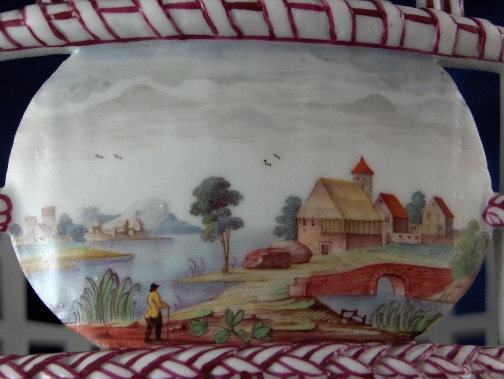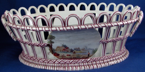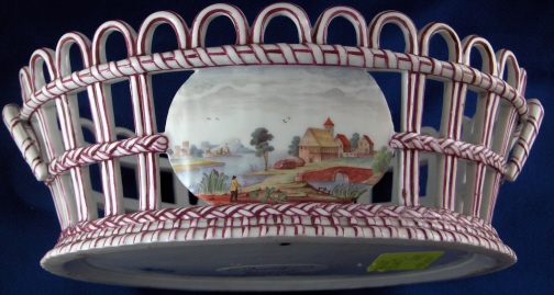 This is a rare reticulated basket made by Niderviller in the 18th century. It is handpainted with two superb scenic medallions - on on either side and has a nice puce trim to the reticulation that makes it looks like a woven basket. Great colors and the scenes are top notch! The basket is marked with a CC under a crown mark one does not see too often on their goodies. The basket is 3.25 inches tall, 9.25 inches wide and 6 inches deep. It is in superb condition with two of the top arches having some work done on them though it is close to impossible to spot and I would guess it was small chips rather than anything major. Perfect work! There are some firing cracks from the making common on items like this and of little importance. The inside of the basket has some scattered flowers and leaves on the bottom. Please email me for more information or other pictures.