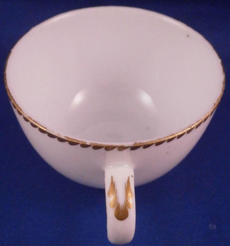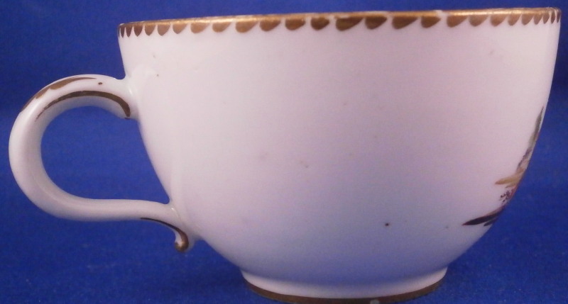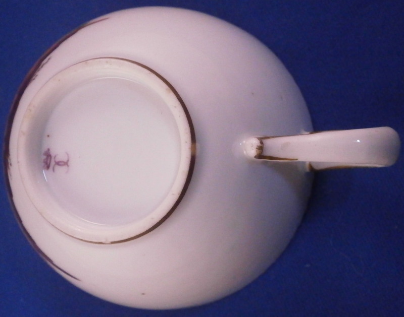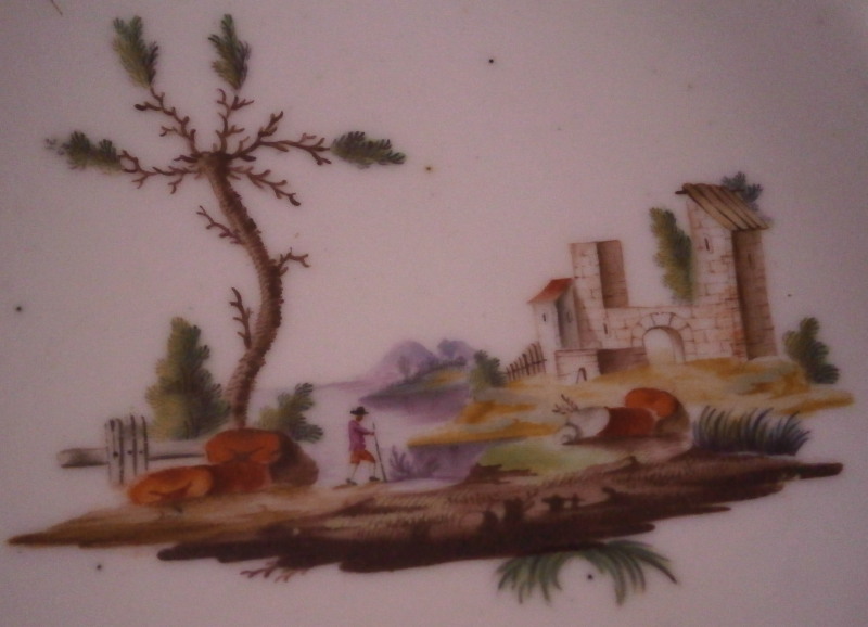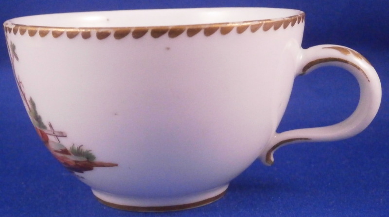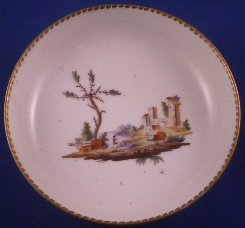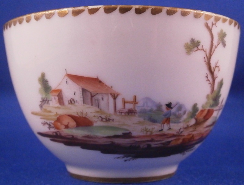 This is a superb cup and saucer made by Niderviller in the 18th century during the Count Custine period. Both pieces are hand painted with a superb landscape scene with lots of detail in their typical colors and a gold trim to the edges and the handle. The details of the scenes are really nice and they include a building, some rocks, a person and some greenery. The cup is marked with their interlaced CC mark in over glaze puce under a crown while the saucer just has an incised mark underneath. The cup is 2.875 inches tall and 35 inches in diameter and the saucer is 1.25 inches tall and 5.25 inches in diameter. Both pieces are in superb condition with a touch of gold wear and the usual tiny firing imperfections in the form of black specs. Please email me for more information or other pictures.