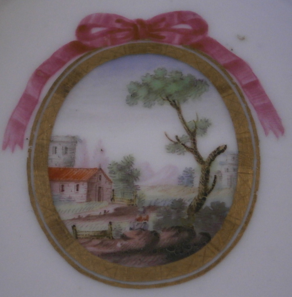 This is a superb saucer made by Niderviller around in the late 18th century. It is hand painted with a well known design by them of a central medallion including a scene surrounded by a gold trim with a pink bow to the top. Three small floral arrangements to the rim and a gold trim to the edge. Even though this is a well known design for them this is the first time I have onwed pieces with it. The dish is marked underneath witht he letter N in script as well as a number 171 and an incised mark. It is 1.125 inches tall and 4.875 inches in diameter. The piece is in great condition with just a very minor touch of wear and some minor manufacturing flaws from when it was made. It displays perfectly! Please email me for more information or other pictures.