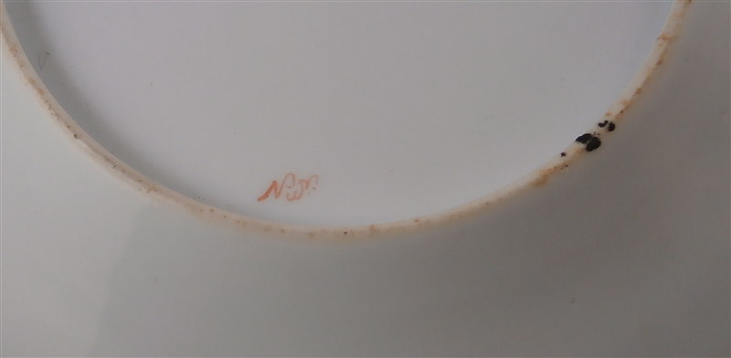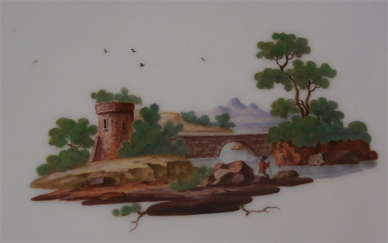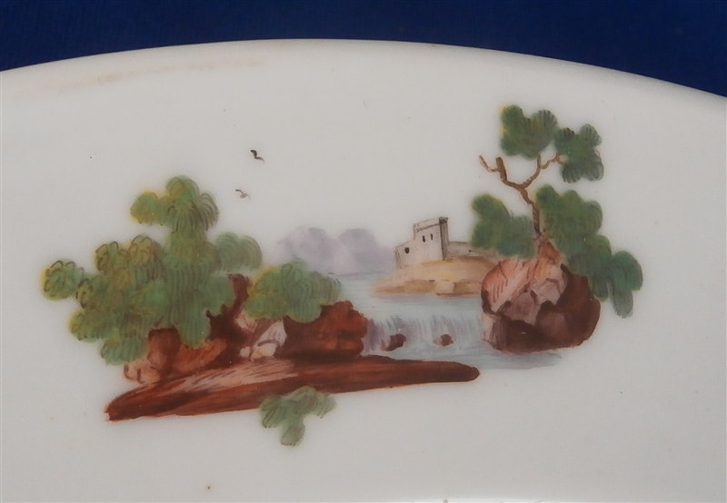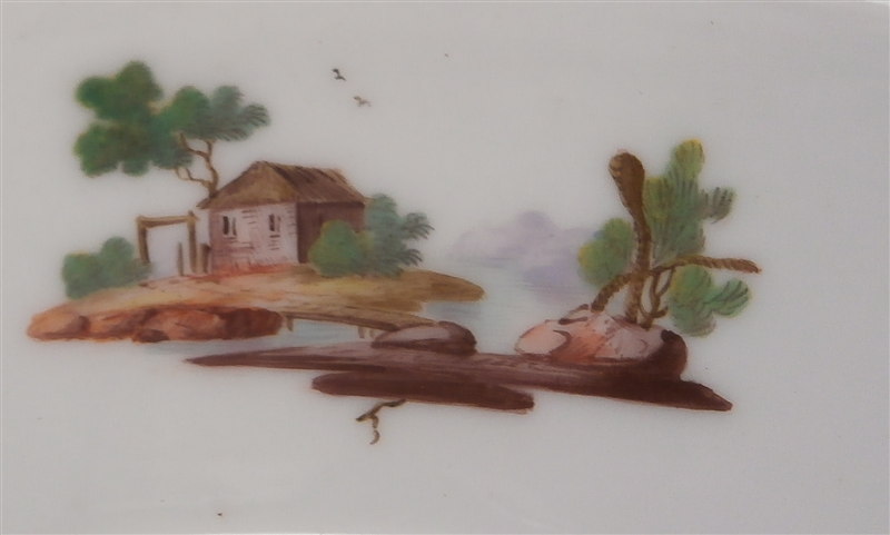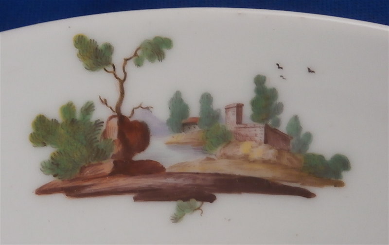 This is a superb scenic plate made by Niderviller around in the late 18th century. It is handpainted with a superb scene in the center of a guy by a stream that is going under a bridge in a landscape backdrop including a tower and some trees and even mountains in the background. The rim has three miniature scenes on it that are very nice and detailed as well. The plate is marked with a red Nidv as shown. It is 1.125 inches tall and 9.625 inches in diameter. The plate is in perfect condition with some manufacturing flaws here and there from the making common to this maker. Please email me for more information or other pictures.
