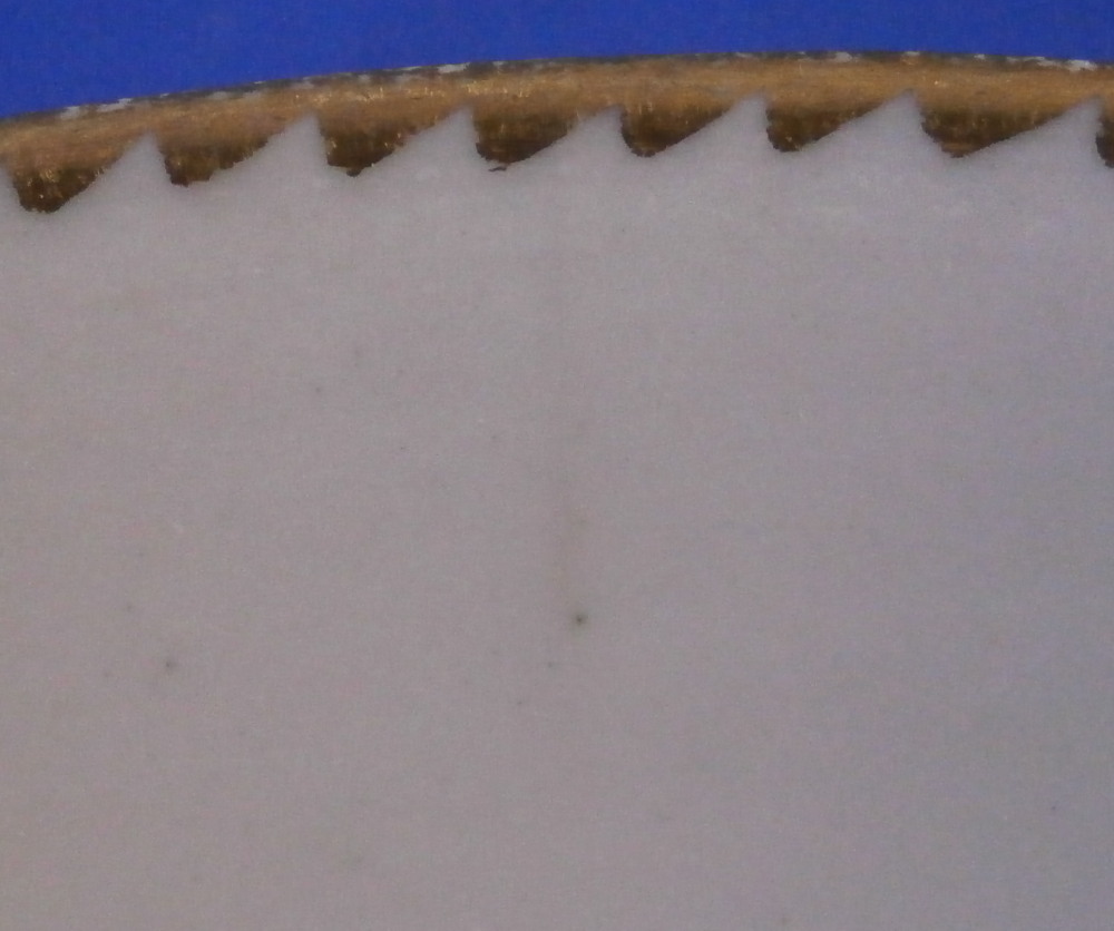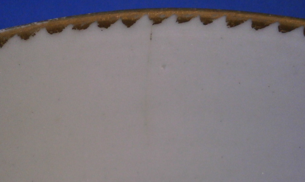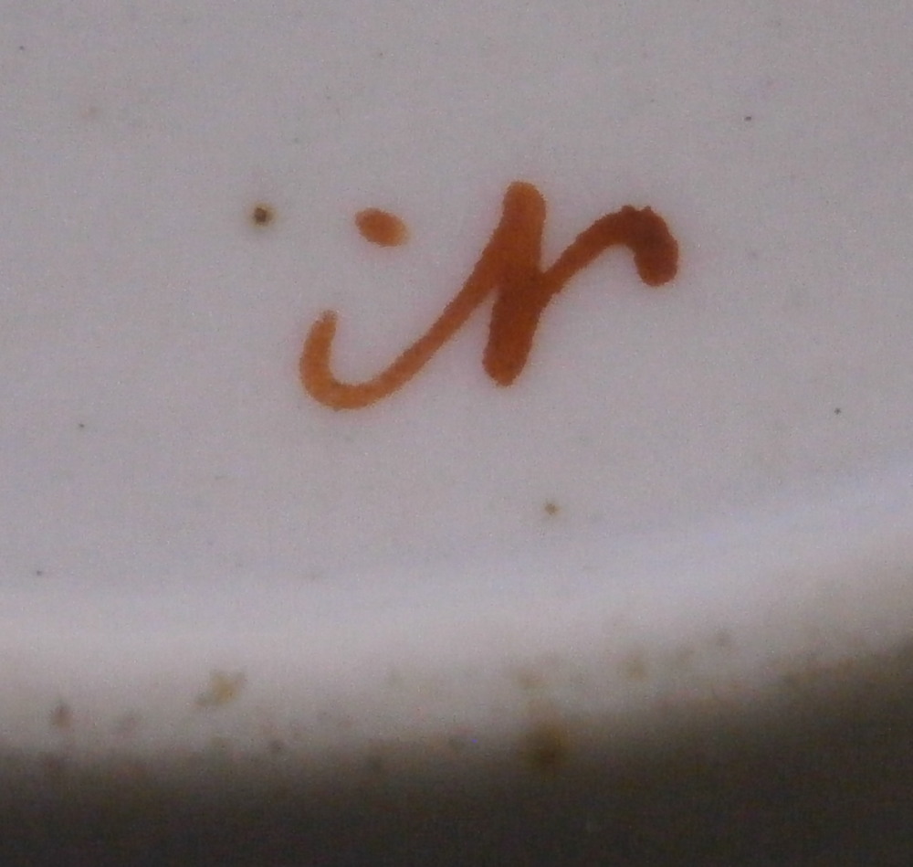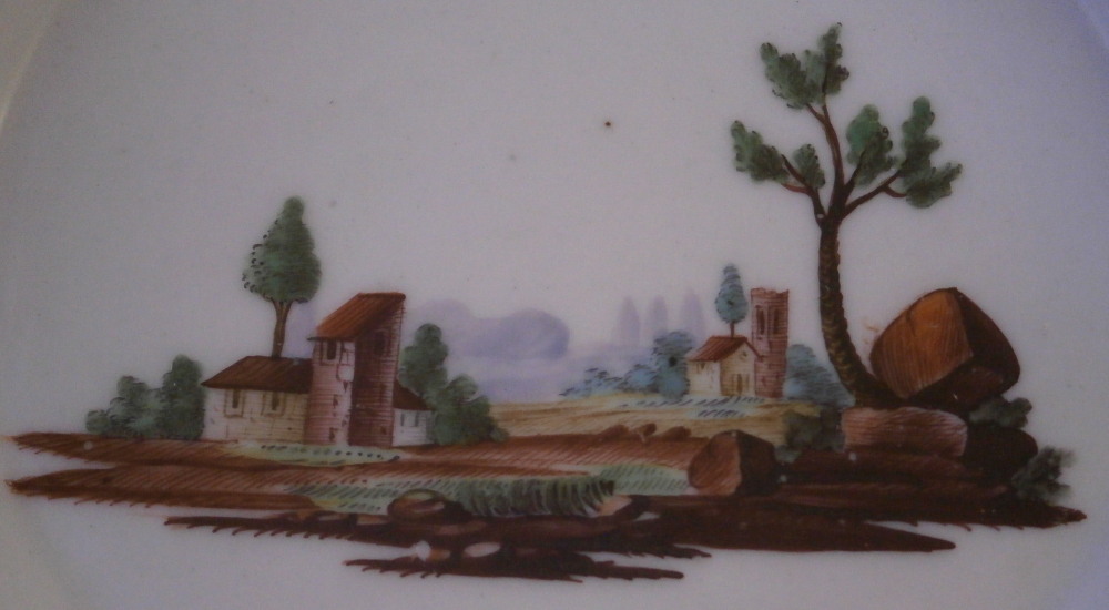 This is a superb saucer made by Niderviller in the 18th century during the Count Custine period. The piece is hand painted with a superb landscape scene in the center with lots of detail in their typical colors and a gold trim to the edge. The details of the scene is really nice and it includesa buildings, some rocks, trees and other greenery. The saucer is marked with their script N. mark in red as well as an incised mark as shown. It is 1.25 inches tall and 5.375 inches in diameter. The saucer displays perfectly but upon clsoe inspection one finds to very tight faint hairlines to the rim as shown. They are stable and won't go anywhere. Otherwise it's in amazing shape with a couple of firing spots normal to these early peices. Please email me for more information or other pictures.