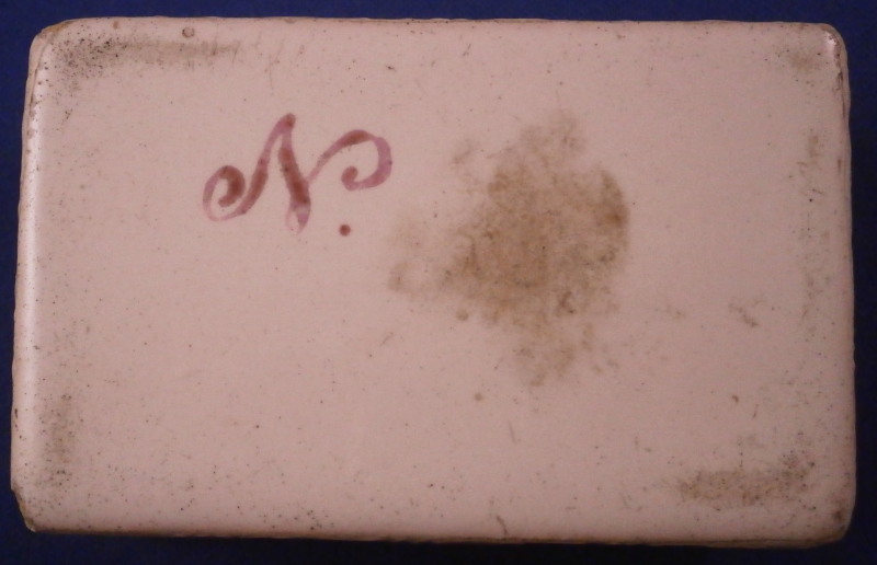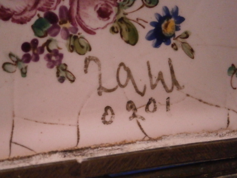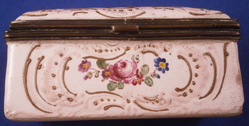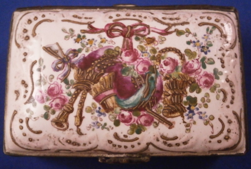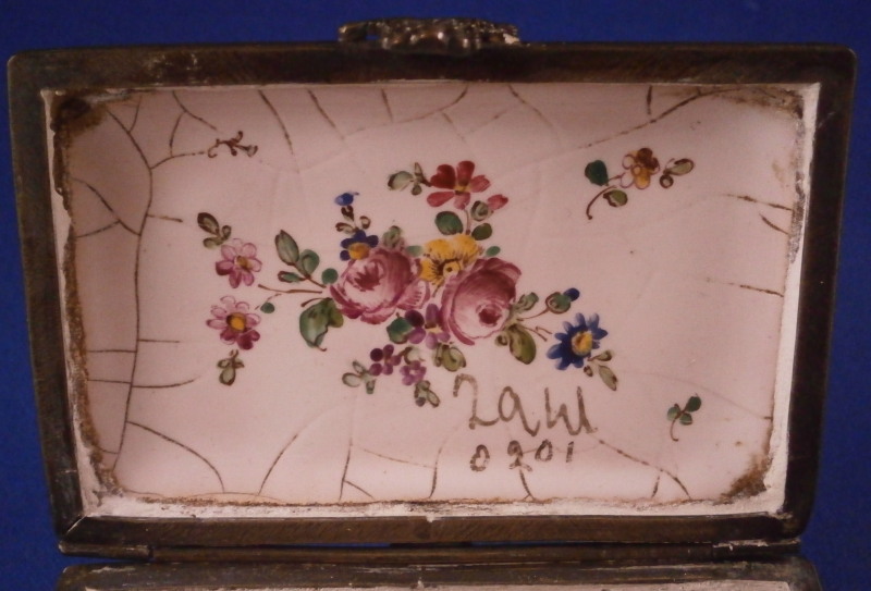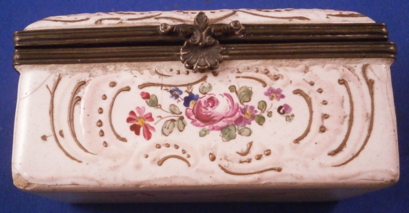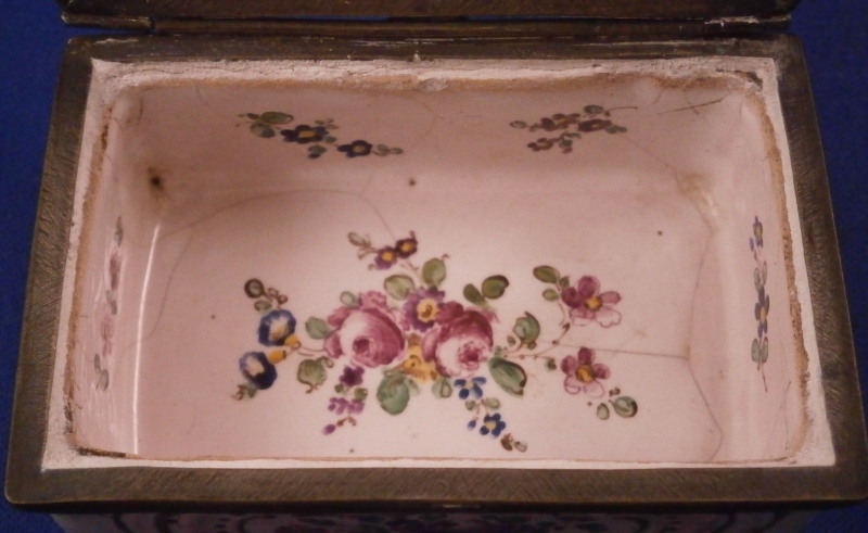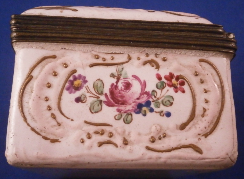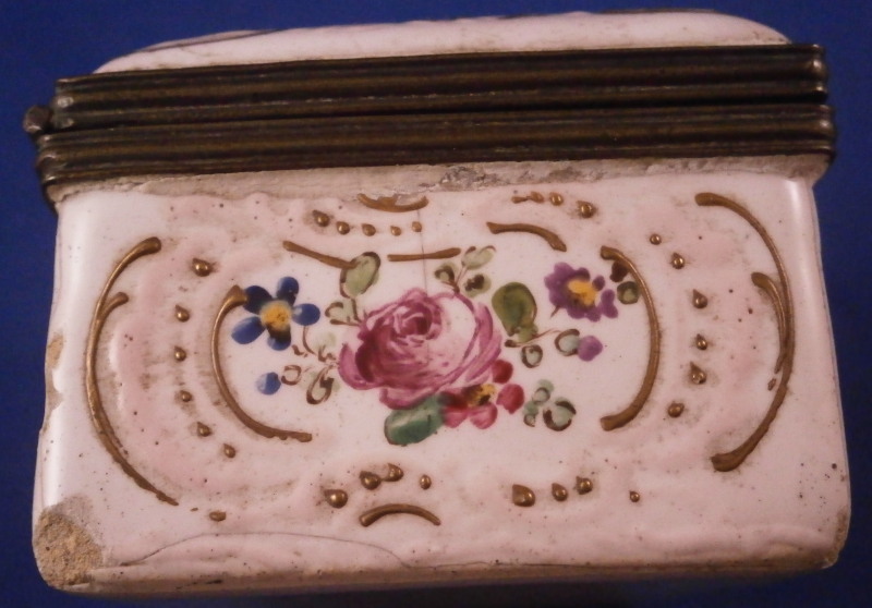This is a fun faience box that looks to have been made by Niderviller in the late 18th or early 19th century. Faience is not something I am too familiar with but this is a really nice box hand painted with a fun design to the top of the lid including a bagpipe, a shepherd's staff and a basket with lots of flowers around and a raised trim around the edge. Each side has a floral arrangement to it with the same trim and the inside top and bottom have a larger floral arrangement to it with some small single flowers scattered about. The mounts appear to be brass and have darkened with age. The bottom of the piece is marked with a script N. in puce - typical mark for this maker. I ahve not seen a box made by them but I am sure they exist. The piece is 1.625 inches tall, 3.25 inches wide and 2 inches deep. It is in great condition with a little wear to the outside - mainly to the bottom from age and lots of cracks to the glaze on the inside mainly from shrinkage it appears. A few cracks to the outside but none that distract and a couple of spots where the glaze has chipped off - two corners and on one edge. All in all a really nice piece!. There is some old writing on the inside lid - I left it but it does come off. Please email me for more information or other pictures.