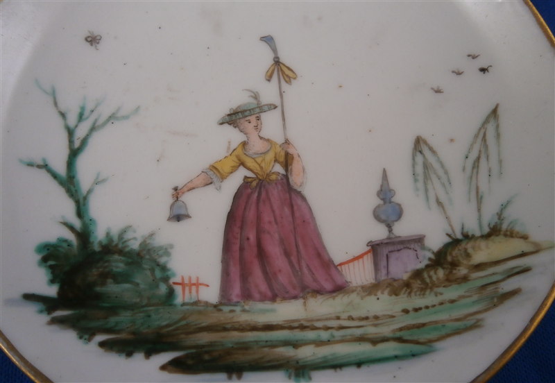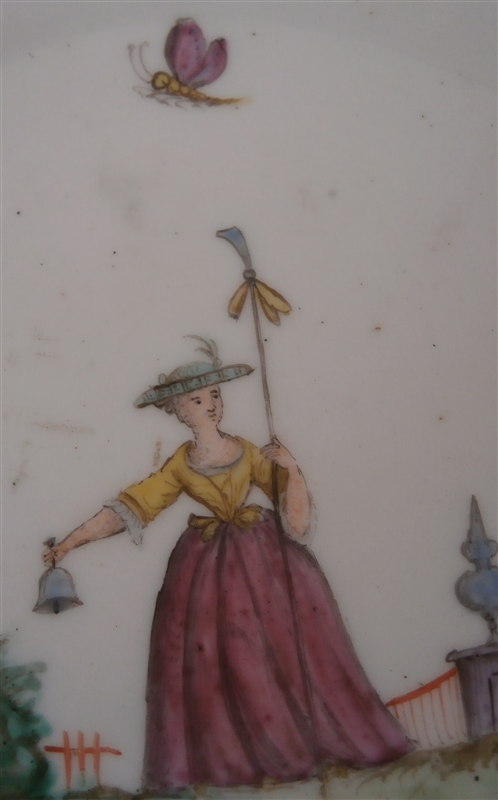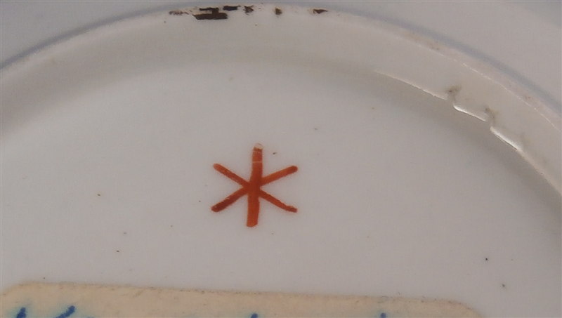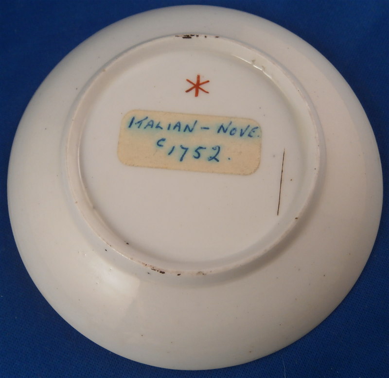 This is a great little saucer made by Cozzi in the 18th century. I know it says Nove underneath and this mark is generally attributed to Doccia or LeNove but I have seen and owned pieces by COzzi marked with the red star as well and even have two saucers of the same design and same maker where one has the red anchor Cozzi mark adn the other the red star. So we need to add the star to their marks for sure! So back to this saucer - It is handpainted with a nice scene on the front of a lady in a landscape surrounding with a fence type structure behind her. A nice butterfly above! The edge ahs a gold trim to it. The saucer is in great condition with a little bit of wear but not bad at all! The saucer is 0.75 inches tall and 4.5 inches in diameter. It is marked underneath with the red star mark as shown. Please email me for more information or other pictures.