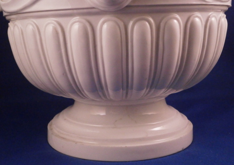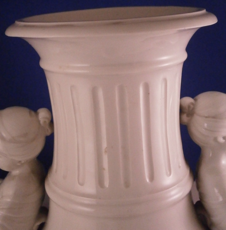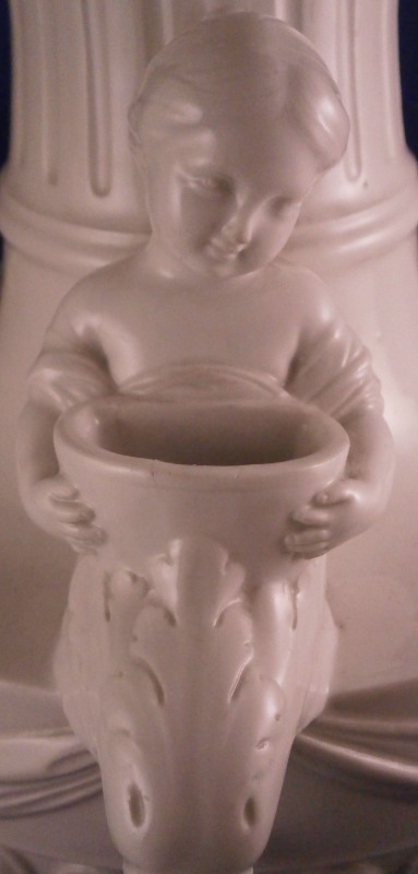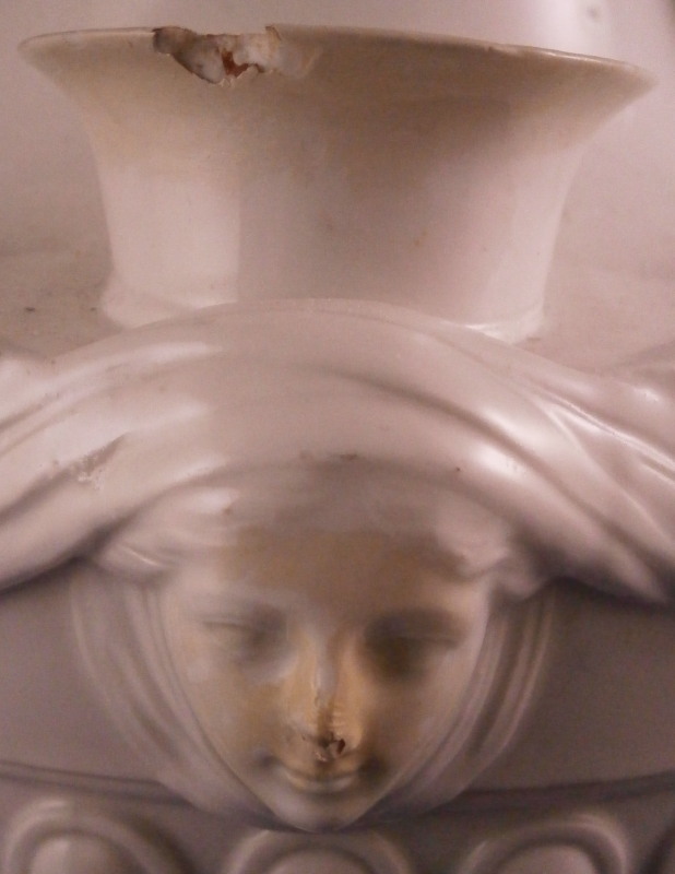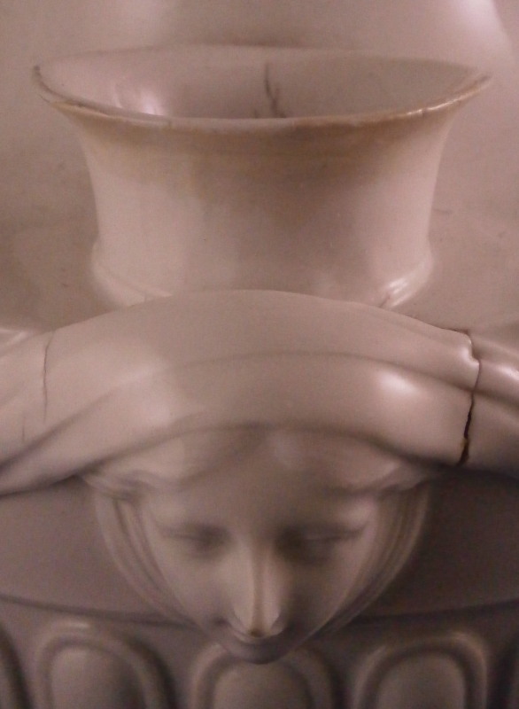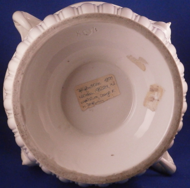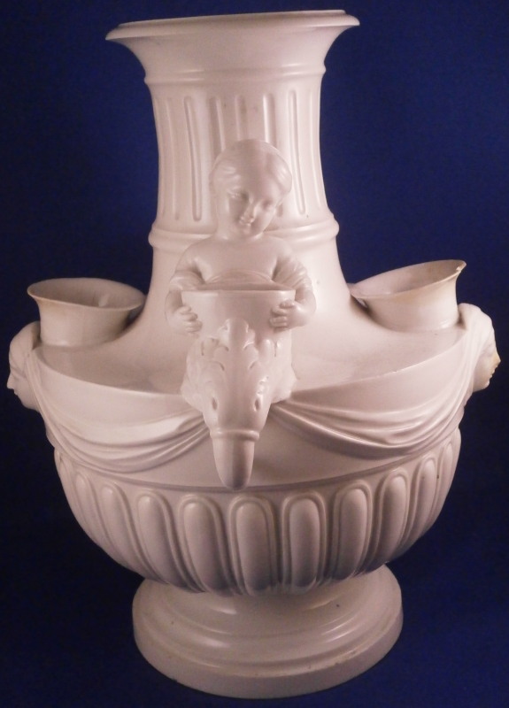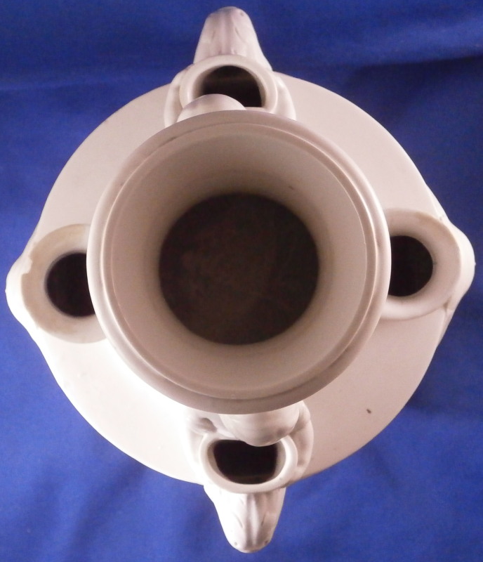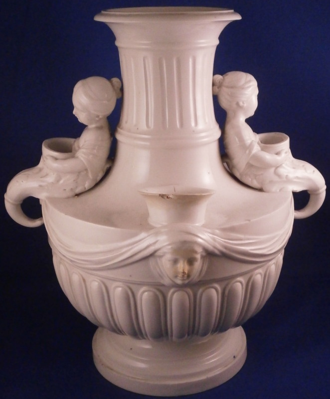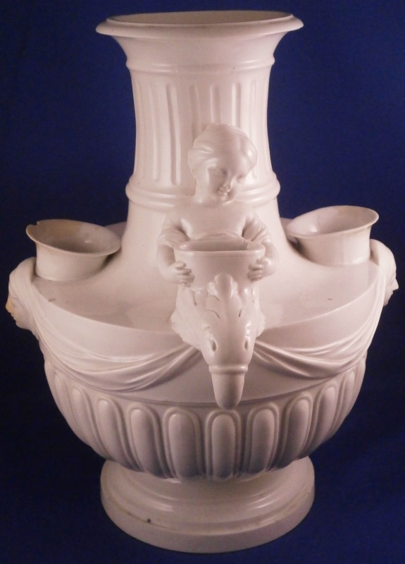 This is a rare tulip vase made by Nymphenburg in the very early 19th century around 1803. A fun shape and left in the white which would have looked amazing with those crazy tulips from the tulip craze of this period! The piece is modeled with a amphora shaped neck with a relief design to it. That part of the vase is only about as deep as the neck is long and then it is separated inside from the bottom part. The middle section of the vase has four openings, two are in the shape of a little girl growing out of a horn of plenty type thing and holding a basket which is the opening of the vase and two are simple openings but have a nice relief face t the edge under them. The bottom part has more relief designs to it. It is a stunning piece and not something you will come across agai anytime soon. Put some colorful flowers in it and you won't find things that will look much nicer! The underside is marked with the impressed shield mark, a letter K incised and a letter I with two dots impressed next to it. Typical mark of this period. The piece is great condition for the age with some firing cracks to the insides of the openings mostly and along the sides of one face relief, yellowed restorations to chips along the edges of the simple openings as well as the nose of a relief face, a chip to one of the simple openings and the nose of the face below it and a tiny chip to the edge of the center section. Nothing bad really and it would be a simple fix if need be. It displays beautifully! The entire piece is is 9.5 inches tall, 8.75 inches wide and 7.5 inches deep. Please email me for more information or other pictures.