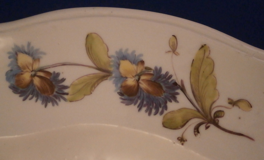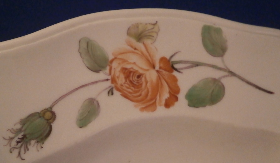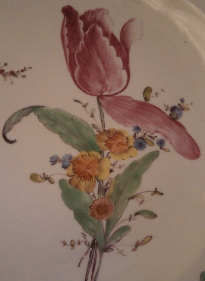 This is a really nice early plate made by Nymphenburg in the 18th century. It is hand painted with a large floral arrangement in the center with two smaller ones next to it as well as four larger and four smaller flowers along the rim. A bit of a relief design to the nicely shaped edge. A very nice looking and quite rare plate in the typical Nymphenburg style they still use today! The plate is marked with the impressed shield mark as well as an impressed number as shown. It is in super condition for the age with just a touch of wear (mainly to one small flower from stacking) and a firing flaw to the back that does not affect the front. A really nice example from one of the rarer makers of the 18th century. The plate is 1.25 inches tall and 9.375 inches in diameter. Please email me for more information or other pictures.
