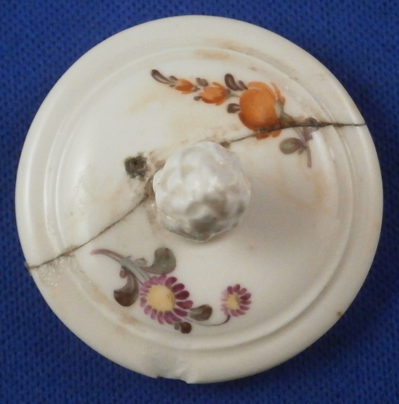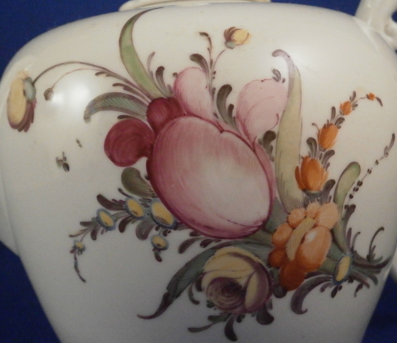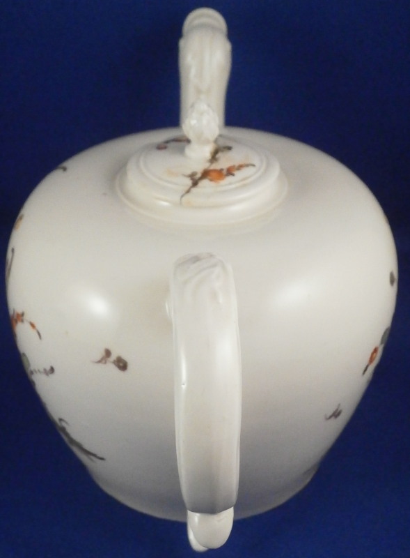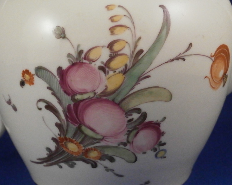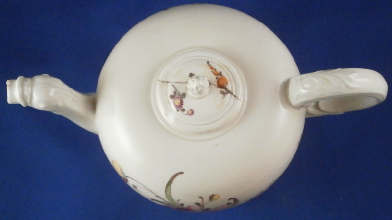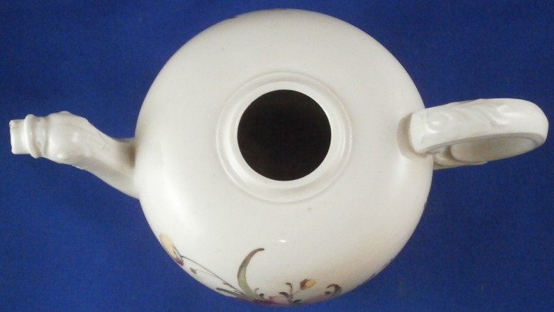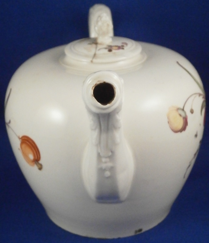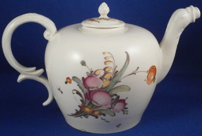 This is a superb teapot with its original lid made by Nymphenburg in the 18th century. Quite rare to find a tea pot and I was excited to ahve a lid even though it is not perfect. The main body is hand painted with two nice floral arrangements - one to the front and one on the backside as well as three small single flowers. It has a nicely shaped handle with some relief decoration to it and the spout is in the shape of an animal head which is always superb. The lid has a nice finial to it, a relief ring around the edge and two small hand painted flowers on top. The underside of the pot is marked with the impressed shield mark as well as an incised 70 as shown. The teapot is in great condition with a chip to the inside of the spout opening as well as two short stable hairlines to the front top of the spout as shown and a flaw to the bottom edge from when it was made. The lid sadly has been broken in two which was simply glued back together as well as a small rim chip. Could easily be brought back to perfection if one would want and it would not cost much to do so. The pot is 3.8755 inches tall, 6.5 inches from handle to spout and 3.75 inches in diameter. Please email me for more information or other pictures.