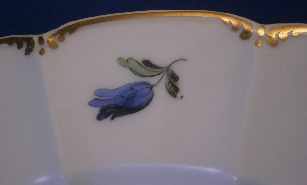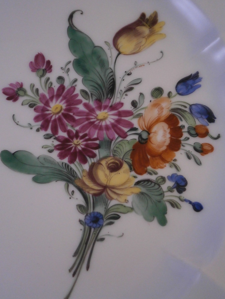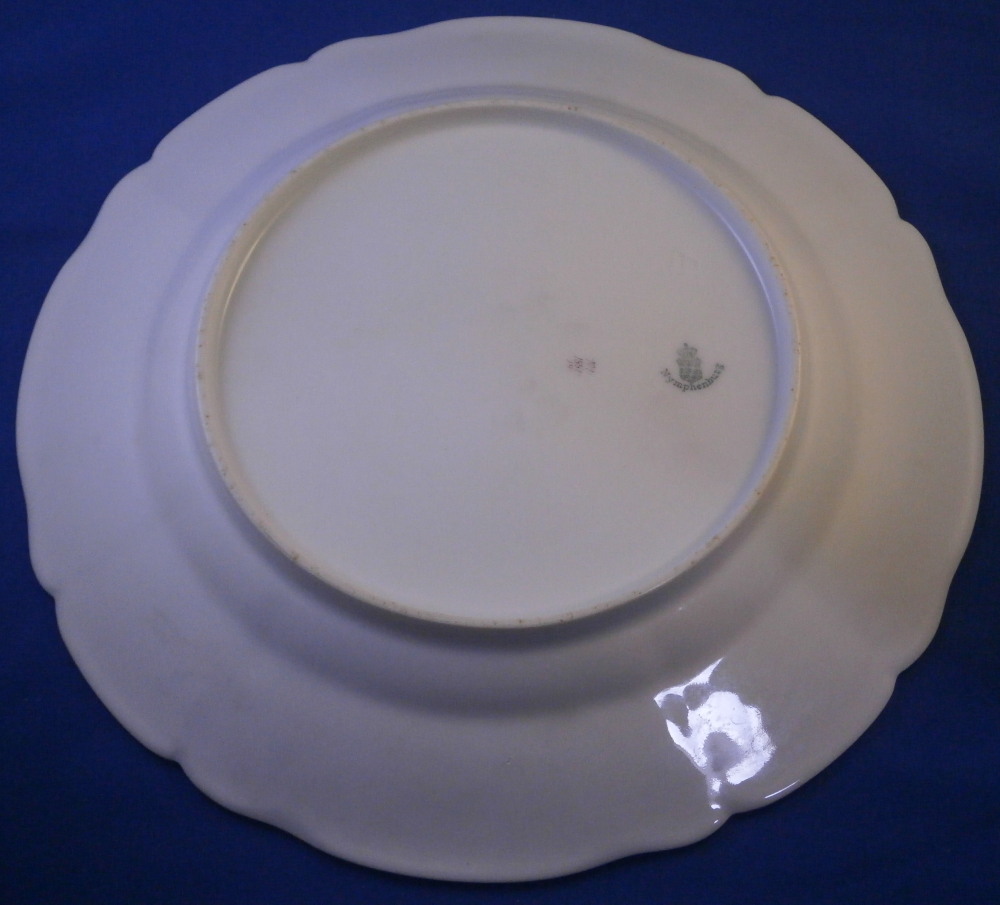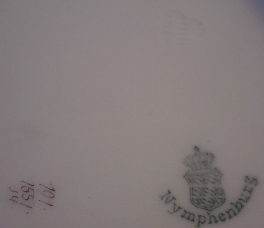 This is a dinner plate made by Nymphenburg in the early 20th century. In terms of design this piece is as typical as you get by them. I have an 18th century piece very similar to this plate so this is a very early design for this maker. The plate is hand painted with a large floral arrangement to one side of the center well with two tiny flowers filling is the rest of the well. The rim has four smaller flowers in the small sections of the rim and four larger flowes filling the larger sections with a gold trim to the nicely shape edge. One tiny lonely flower along the edge of the well possibly hiding a flaw underneath - a common practise back in the day. A stunning looking plate and much cheaper than the 18th century version :) The plate is marked with the impressed shield mark underneath as well as the green shield under the crown mark with Nymphenburg under it and some painted numbers as shown. It is in superb condition with just a flaw in the painting on the large yellow flower - almost looks like they stacked the plate before it was all dry but that can't be. It displays perfectly and looks great! The plate is 1.25 inches tall and 9.875 inches in diameter. Please email me for more information or other pictures.