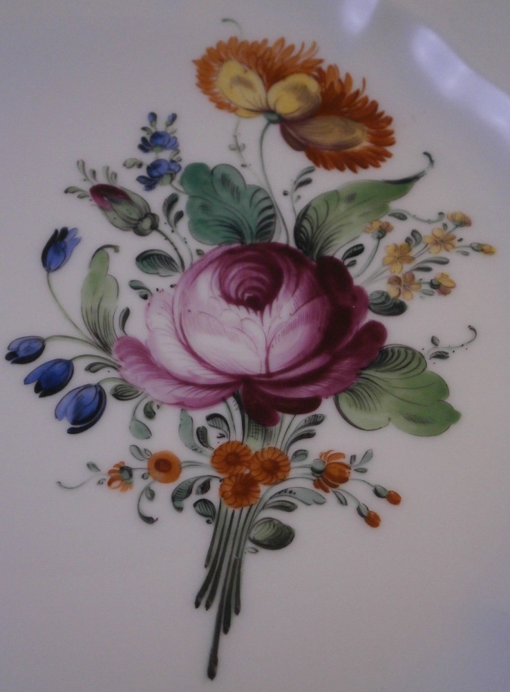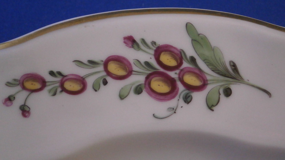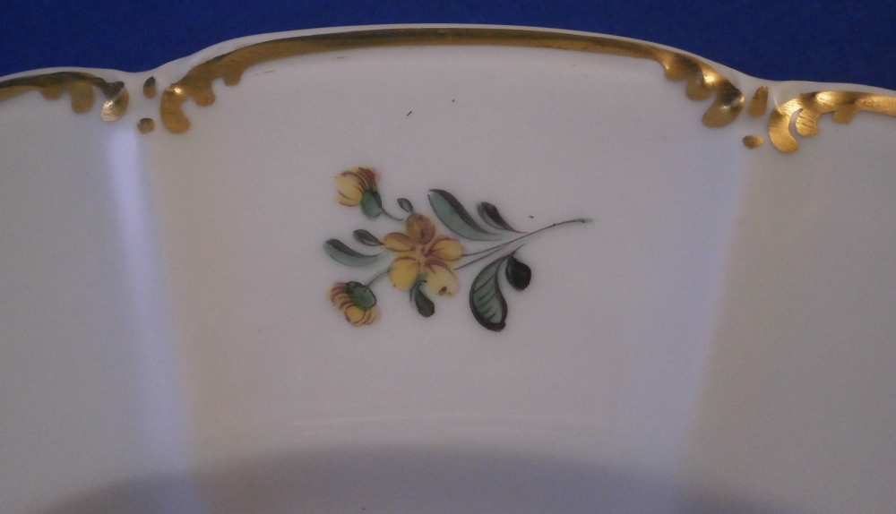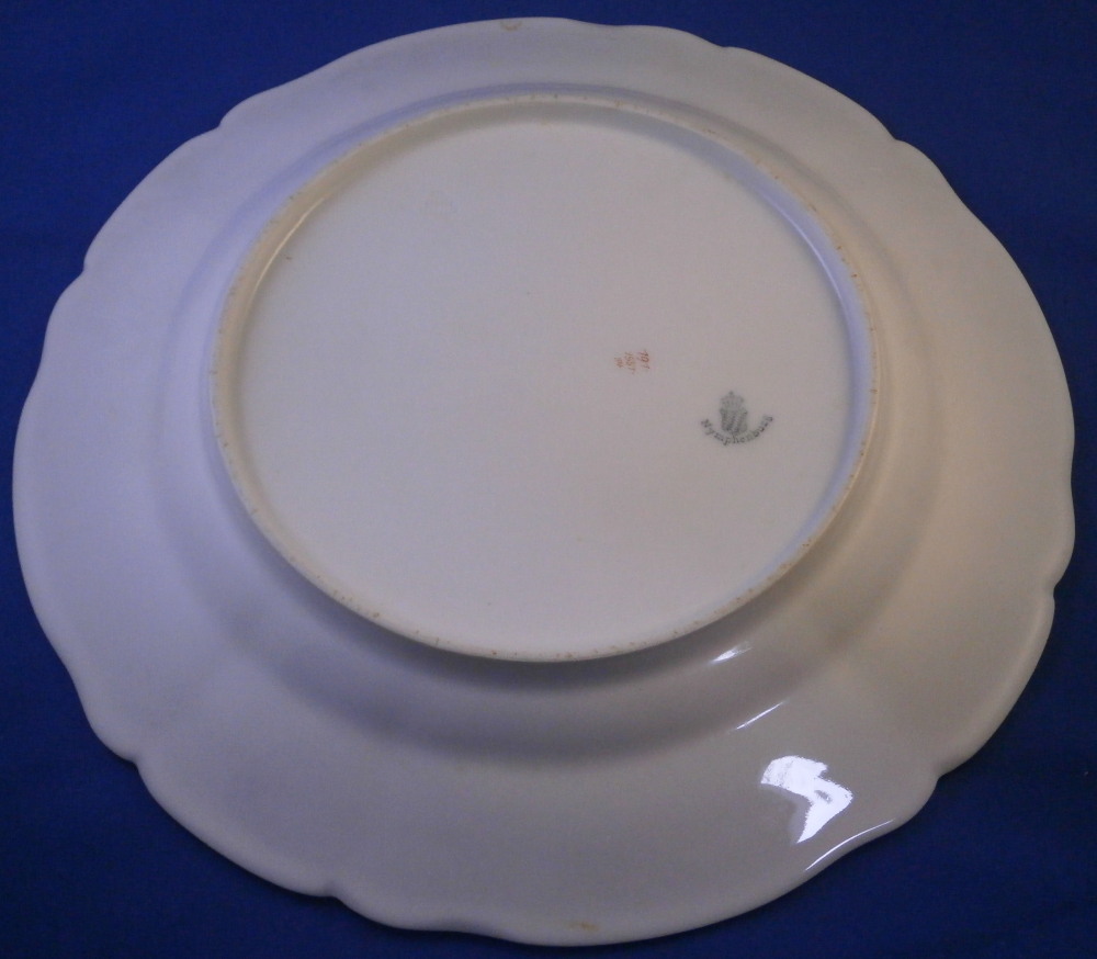 This is a dinner plate made by Nymphenburg in the early 20th century. In terms of design this piece is as typical as you get by them. I have an 18th century piece very similar to this plate so this is a very early design for this maker. The plate is hand painted with a large floral arrangement to one side of the center well with two tiny flowers filling is the rest of the well. The rim has four smaller flowers in the small sections of the rim and four larger flowes filling the larger sections with a gold trim to the nicely shape edge. A stunning looking plate and much cheaper than the 18th century version :) The plate is marked with the impressed shield mark underneath as well as the green shield under the crown mark with Nymphenburg under it and some red numbers as shown. It is in perfect condition! The plate is 1.25 inches tall and 9.875 inches in diameter. Please email me for more information or other pictures.