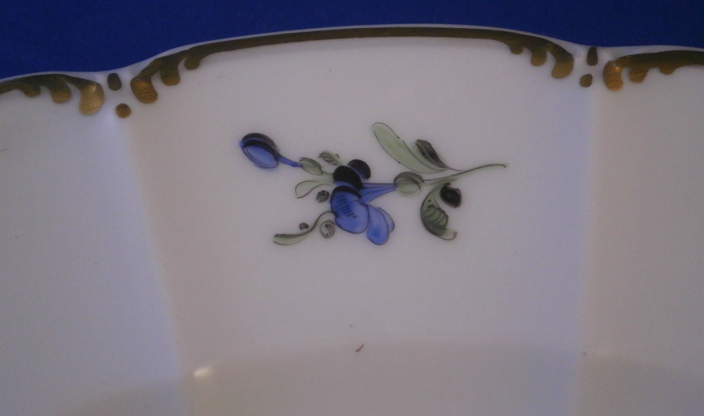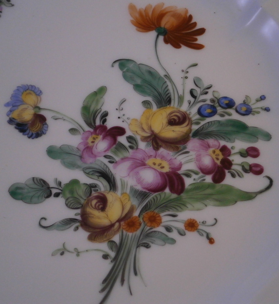 This is a dinner plate made by Nymphenburg in the early 20th century. In terms of design this piece is as typical as you get by them. I have an 18th century piece very similar to this plate so this is a very early design for this maker. The plate is hand painted with a large floral arrangement to one side of the center well with two tiny flowers filling is the rest of the well. The rim has four smaller flowers in the small sections of the rim and four larger flowes filling the larger sections with a gold trim to the nicely shape edge. A stunning looking plate and much cheaper than the 18th century version :) The plate is marked with the impressed shield mark underneath as well as the green shield under the corwn mark with Nymphenburg under it and some red numbers as shown. It is in superb condition with just a small scratch to one leaf of the flower arrangement. it displays perfectly and looks great! The plate is 1.25 inches tall and 10 inches in diameter. Please email me for more information or other pictures.