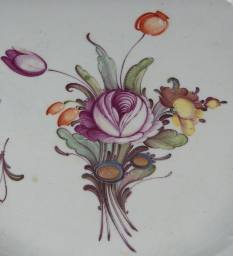 This is a soup bowl or plate made by Nymphenburg in the 18th century. It is handpainted with a floral arrangement in the center and lots of smaller flowers all around in the typical Nymphenburg style they still use today. The plate is marked with the impressed shield mark as well as an incised number 89. It is in super condition for the age with a bit of wear to the gold trim and a small chip to the footring. The plate is 1.75 inches tall and 10 inches in diameter. Still has an old sticker on the front I forgot to remove before taking the pictures :) Please email me for more information or other pictures.