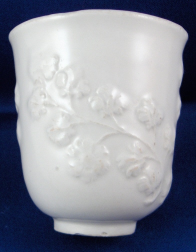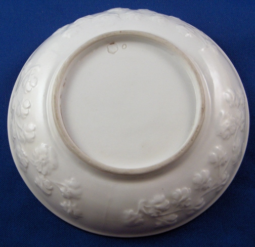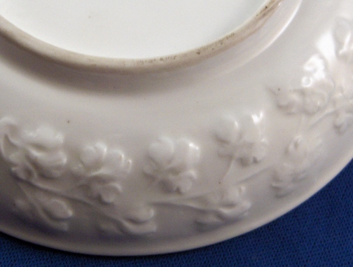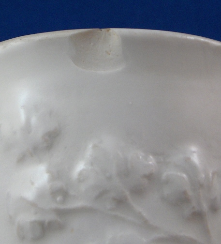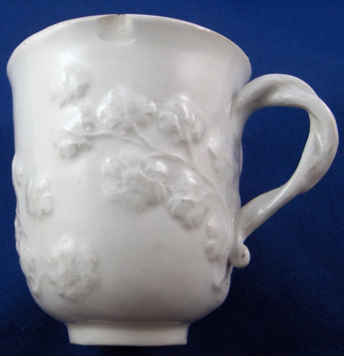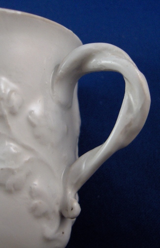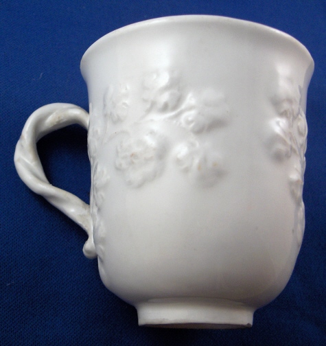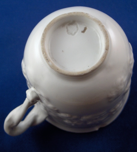 This is a cup and saucer made by Nymphenburg in the 18th century. Both pieces have a neat relief grapeleaf design to the outside / underside which is pretty nice and something I have not seen often by them. Nice twisted branch handle to the cup and otherwise quite simple and elegant. Both pieces have the impressed shield mark as well as an impressed mark right next to it underneath. They are in good condition with a shallow chip to cup outside rim and some light firing spots. The cup is 2.875 inches tall and 2.625 inches in diameter. The saucer is 1 inch tall and 5 inches in diameter. Please email me for more information or other pictures.