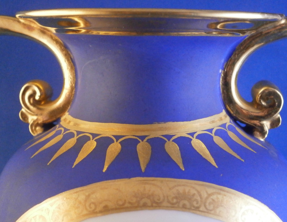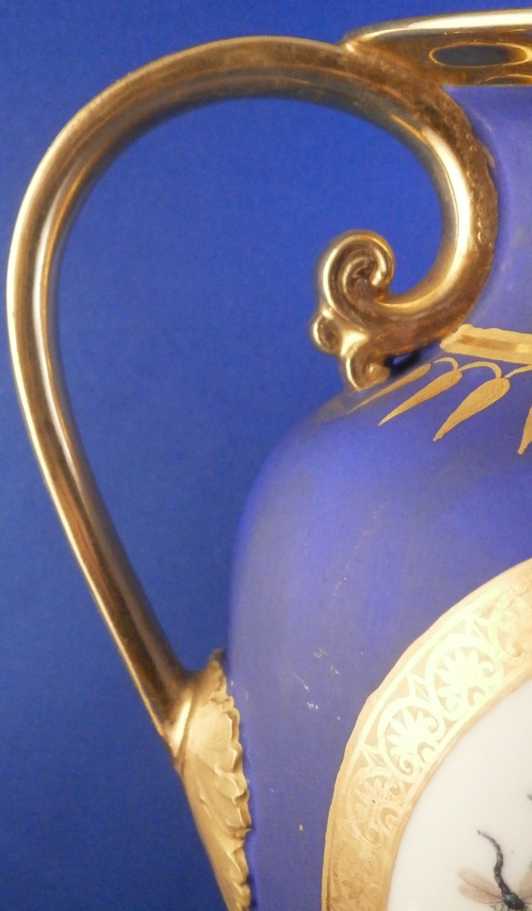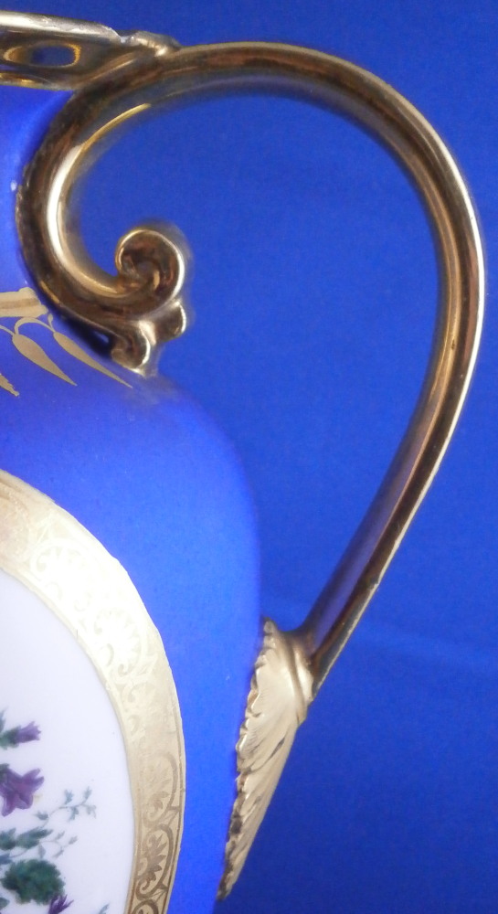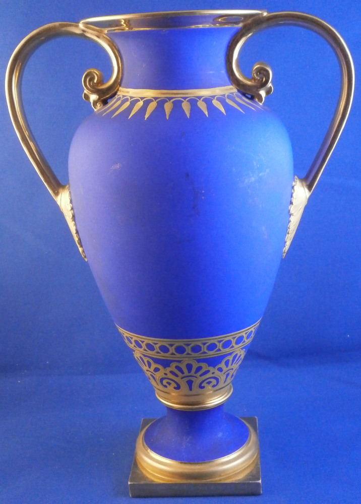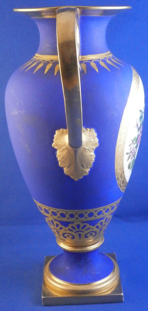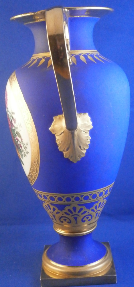 This is a very rare and absolutely stunning Biedermeier vase made by Nymphenburg in the early 19th century around 1810. It has the typical Empire shape to it from this period with my favorite ground color - the matte blue which has a look to it unlike any other color in the world of porcelain. The front has a really nice floral arrangement hand painted on white ground with a tooled gilding border around it. A bit more gold trim like hanging icicles around the neck of the vase and a fancy gold design to the bottom end of the main body. A fully gilded handle to either side and more gilding to the top and around the base. It's an amazing piece that is super elegant and really rare. More in line with French Empire period peice but that was the taste around the early 19th century so they matched it. The underside is marked with the impressed shield mark, a script letter L as well as the 1/5 marking ones finds on pieces from this period though I am unsure of the meaning. The piece is great condition for the age with a flat chip to the top edge as shown which was gilded over to hide it quite well when on display. Some discoloration and marks to the blue ground which is normal since it is not as smooth as glazed pieces. Nothing that takes away from this elegant piece! The entire piece is is 9.375 inches tall, 6.75 inches wide and 4.375 inches deep. I have it's matching mate listed separately if anyone is interested in a pair but it has damage to its handle. Please email me for more information or other pictures.