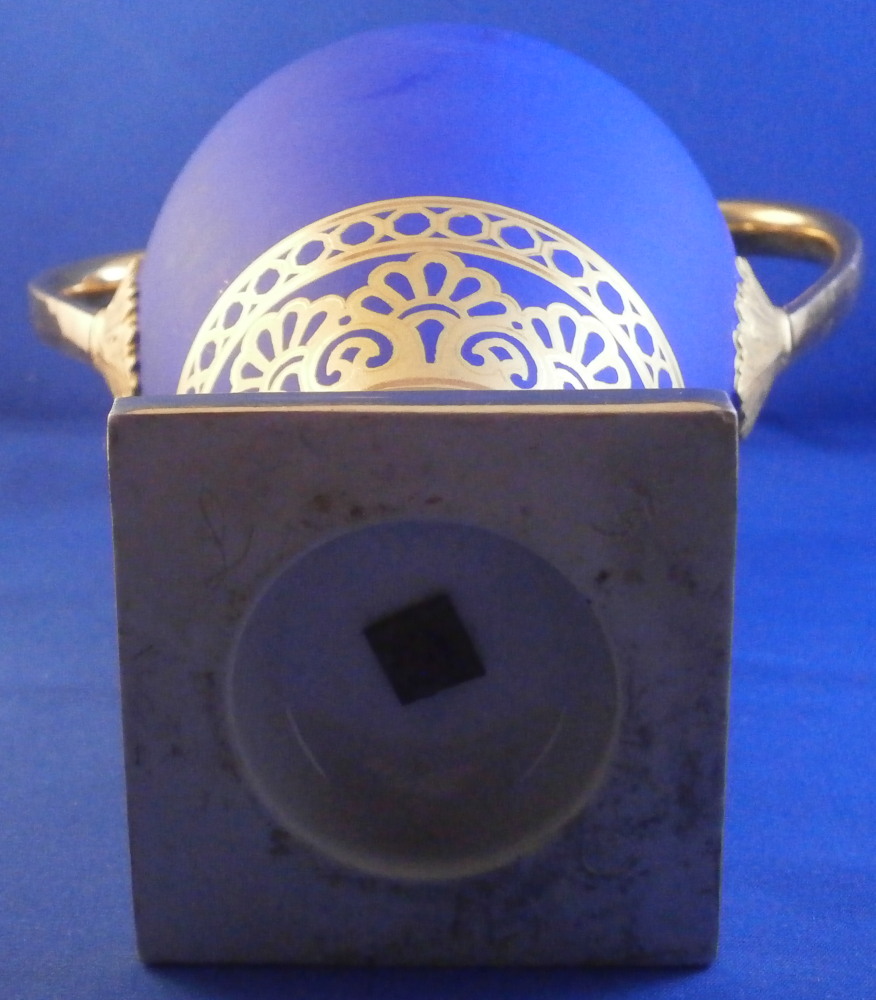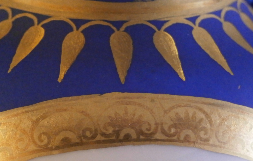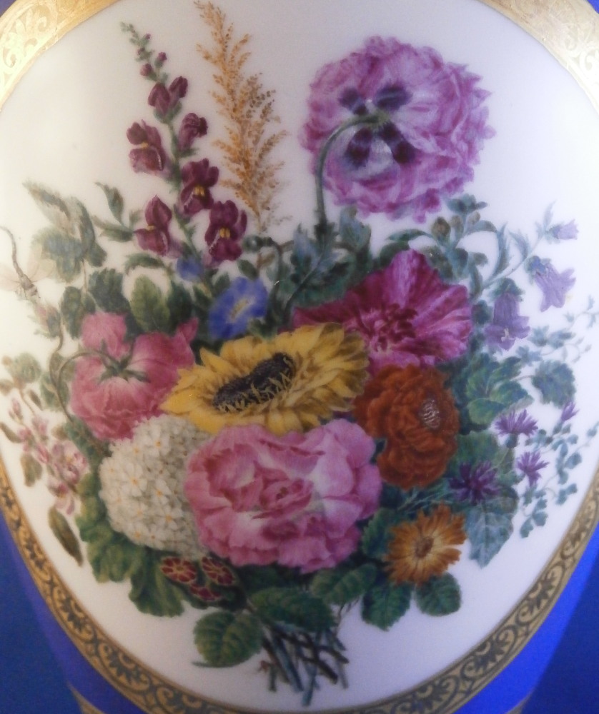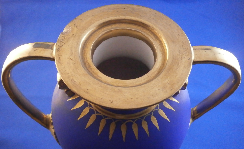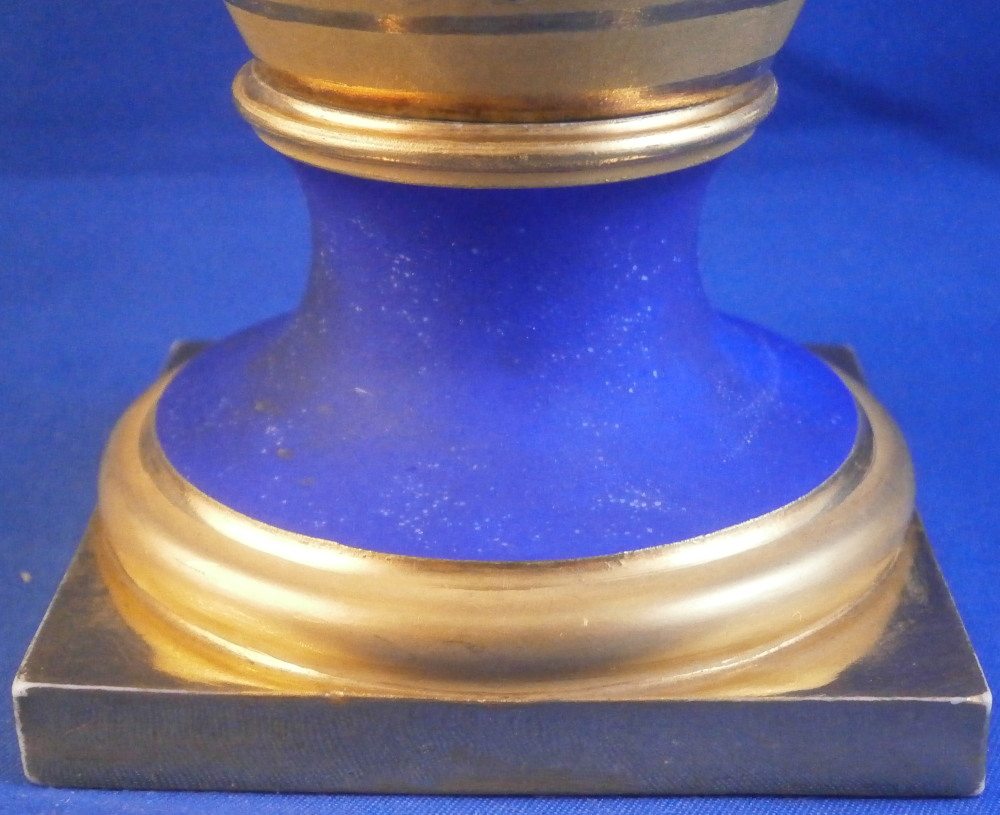 This is a very rare and absolutely stunning Biedermeier vase made by Nymphenburg in the early 19th century around 1810. It has the typical Empire shape to it from this period with my favorite ground color - the matte blue which has a look to it unlike any other color in the world of porcelain. The front has a really nice floral arrangement hand painted on white ground with a tooled gilding border around it. A bit more gold trim like hanging icicles around the neck of the vase and a fancy gold design to the bottom end of the main body. A fully gilded handle to either side and more gilding to the top and around the base. It's an amazing piece that is super elegant and really rare. More in line with French Empire period peice but that was the taste around the early 19th century so they matched it. The underside is marked with the impressed shield mark, a script letter L as well as the 1/5 marking ones finds on pieces from this period though I am unsure of the meaning. The piece is great condition for the age with a flat chip to the top edge as shown which was gilded over to hide it quite well when on display. Some discoloration and marks to the blue ground which is normal since it is not as smooth as glazed pieces. Nothing that takes away from this elegant piece! The entire piece is is 9.375 inches tall, 6.75 inches wide and 4.375 inches deep. I have it's matching mate listed separately if anyone is interested in a pair but it has damage to its handle. Please email me for more information or other pictures.