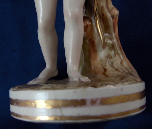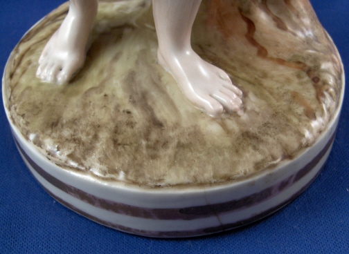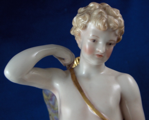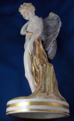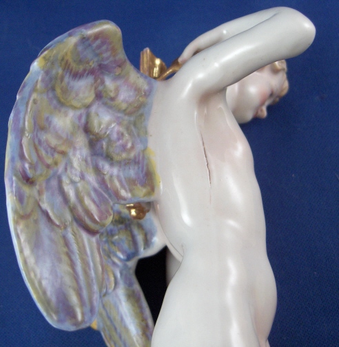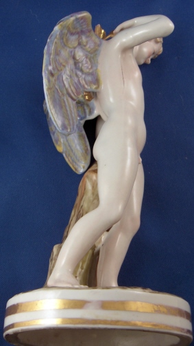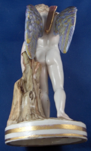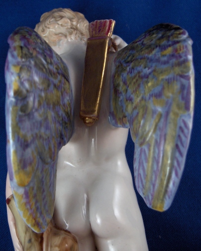 This is a very rare figurine made by Nymphenburg right when he was originally modeled around 1803 by Kirchmayer . Very rare to find original models of Nymphenburg pieces and the ones around 1800 are never really seen anymore. I think this is the first piece I have seen in many years. He is extremely well modeled and painted very elegantly. The wings are a mix of purple, green and ble with a bit of yellow mixed in. He is pulling an arrow from his quiver behind his back and leanign against a tree stump. Correclty modeled up front which is a rare thing as well as most are covered up! He is holding his bow in his left hand. The piece is marked with the impressed shield mark underneath as shown as well as an HD monogram and some other type of y looking mark. Not sure what these stand for. No impressed numbers were used back then. The figurine is 7.75 inches tall with the base having a diameter of about 3.5 inches. The figure is in great condition with a hairline coming from the airhole underneath the base and visible on the front but not up top and the top part of the bow was restored which could have been done better. He displays perfectly and is something special! There is a firing crack along the mold line on his torso under his right armpit. Please email me for more information or other pictures.