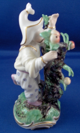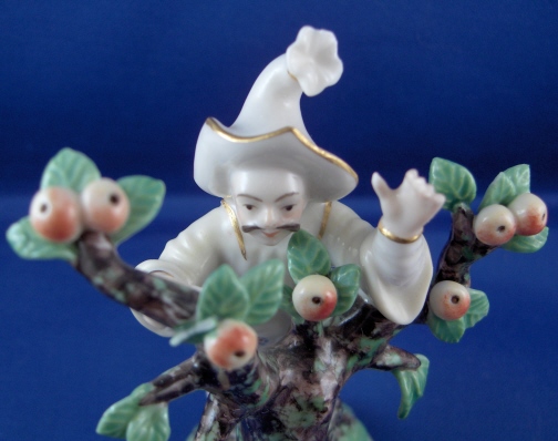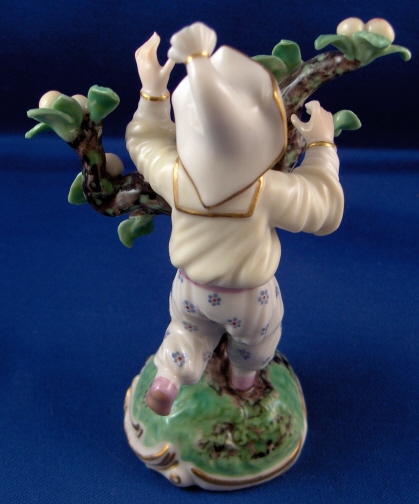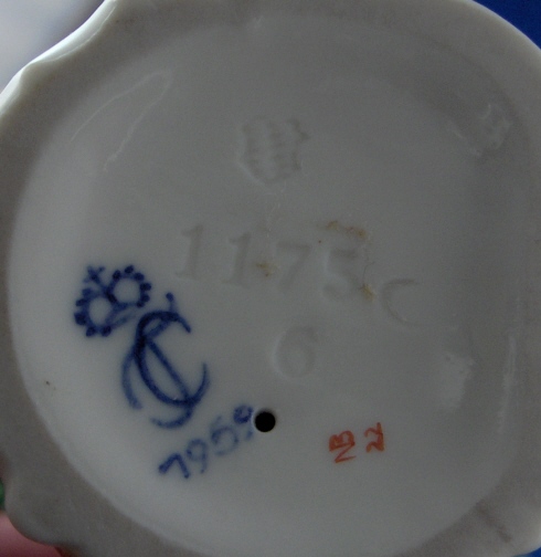 This is a figure of an apple farmer made by Nymphenburg in 1959. It is 4.25 inches tall, 3.25 inches wide and 2 inches deep. Marked with the impressed shield mark, the numbers 1175 over 10, the letter c and the CT monogram under the crown as well as the year mark for 1959. Also in red painters mark NB 22. The figurine is in great condition with one chipped leaf. Please email me for more information or other pictures.