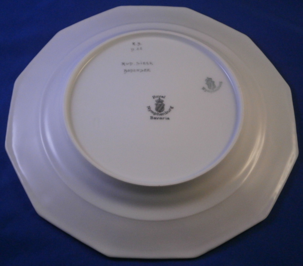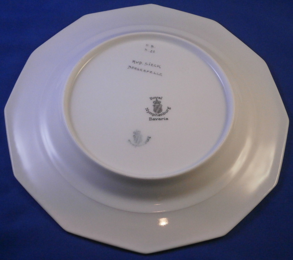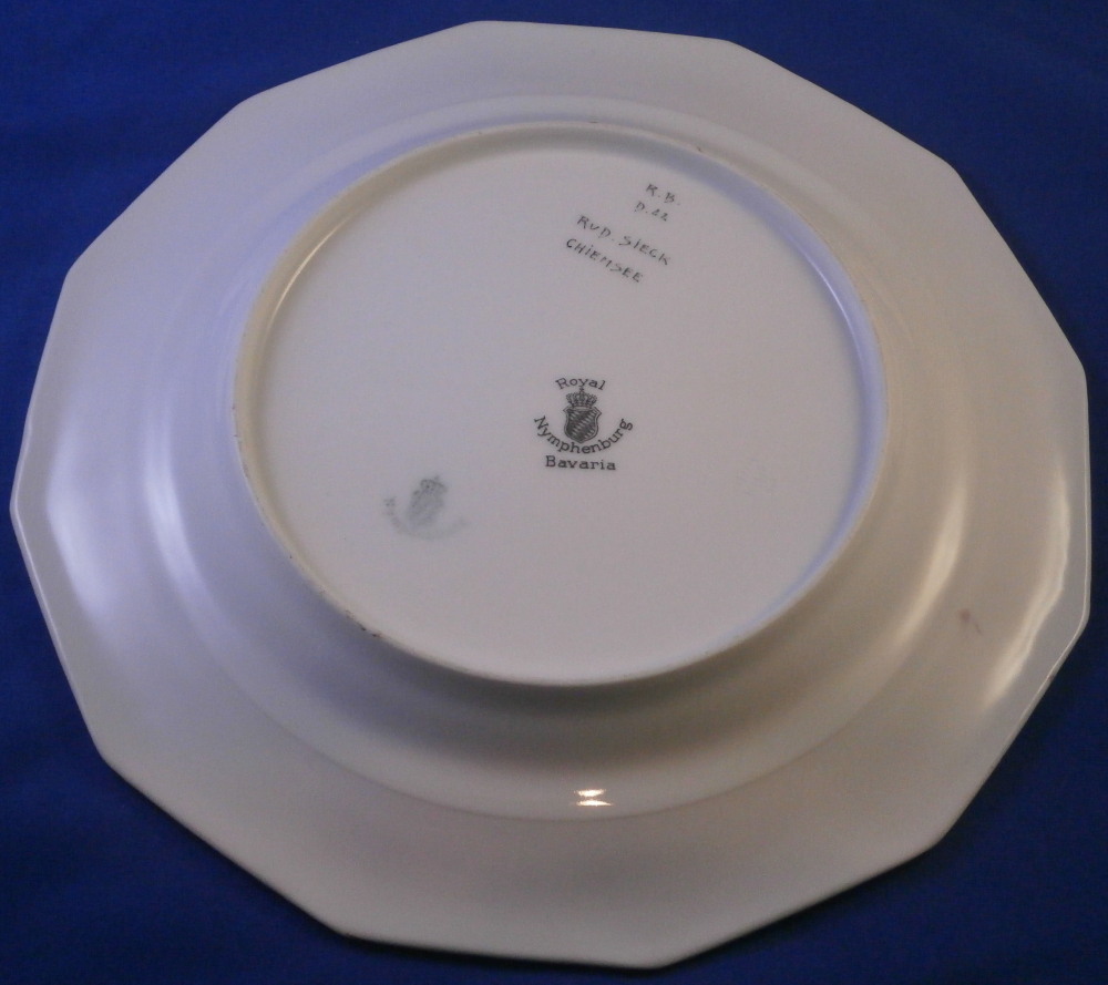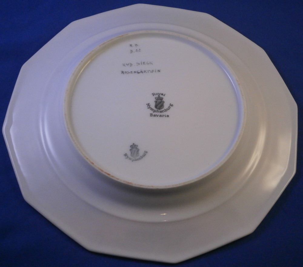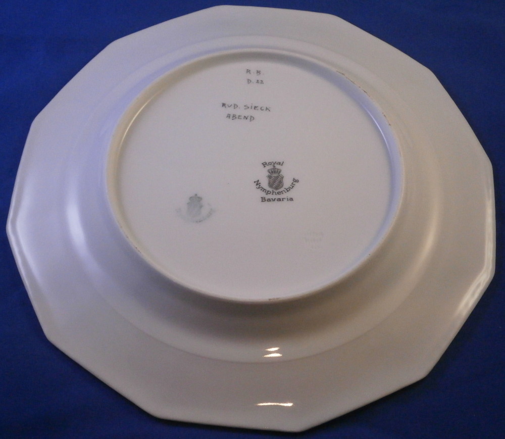 This is a rare set of six dessert plates made by Nymphenburg in the early 20th century. The plate blank design itself is from the Pearl service with those little "pearls" along the edge - it is an old design dating back to the 18th century. The central painting on each however was done by Rudolf Sieck who was a superb painter that did these Art Nouveau scenes for them. He did some amazing work and these plates here are a great example! Each has a different scene and they are titled Rosengaertlein (little rose garden), Einsamer Weiher (lonely pond), Bodensee (Lake Constance), Chiemsee (a lake between Munich and Salzburg), Bergkapelle (mountain chapel) and last but not least Abend (evening). Each is superbly hand painted with lots of details and they definitely have that Art Nouveau / Jugendstil flair to them of this period. Each scene is surrounded by a nice gold trim. The plates are 1 inch tall and 8.5 inches in diameter. Each is well marked with the printed green shield mark with the word Nymphenburg underneath, the impressed shield mark, as well as R. B. over D. 22, RUD. SIECK and the title of the scene under that. They all also have their rare black shield mark with Royal Nymphenburg around a shield and crown with Bavaria under that. One finds that on exported pieces from time to time. Not sure when it was used but definitely in the early 20th century. The set is in suuperb condition without any chips, etc. but one plate has a color smear to the underside as shown. That does not affect the piece when used or on display at all. Please email me for more information or other pictures.