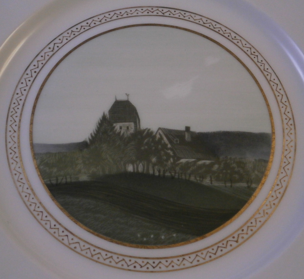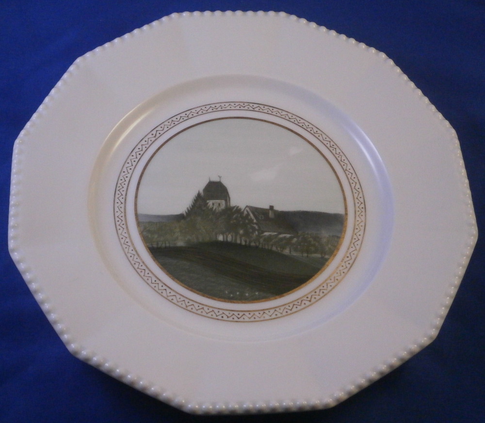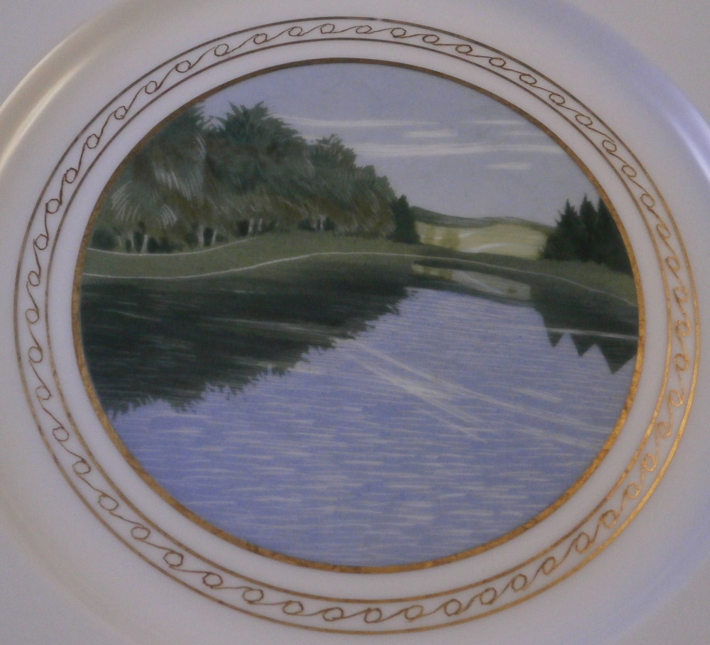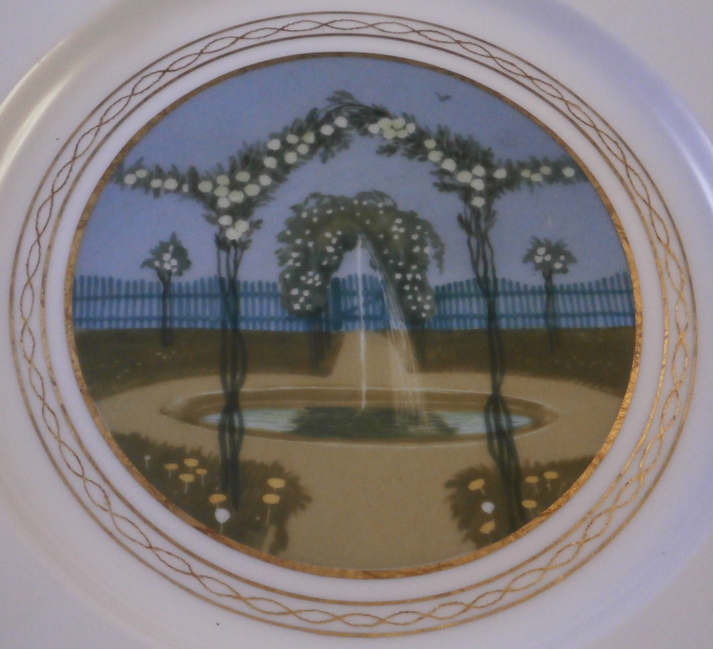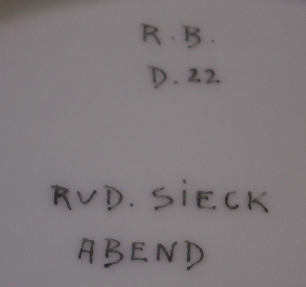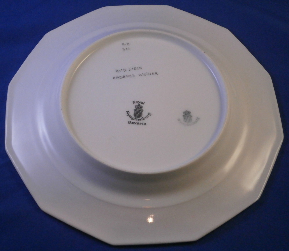 This is a rare set of six dessert plates made by Nymphenburg in the early 20th century. The plate blank design itself is from the Pearl service with those little "pearls" along the edge - it is an old design dating back to the 18th century. The central painting on each however was done by Rudolf Sieck who was a superb painter that did these Art Nouveau scenes for them. He did some amazing work and these plates here are a great example! Each has a different scene and they are titled Rosengaertlein (little rose garden), Einsamer Weiher (lonely pond), Bodensee (Lake Constance), Chiemsee (a lake between Munich and Salzburg), Bergkapelle (mountain chapel) and last but not least Abend (evening). Each is superbly hand painted with lots of details and they definitely have that Art Nouveau / Jugendstil flair to them of this period. Each scene is surrounded by a nice gold trim. The plates are 1 inch tall and 8.5 inches in diameter. Each is well marked with the printed green shield mark with the word Nymphenburg underneath, the impressed shield mark, as well as R. B. over D. 22, RUD. SIECK and the title of the scene under that. They all also have their rare black shield mark with Royal Nymphenburg around a shield and crown with Bavaria under that. One finds that on exported pieces from time to time. Not sure when it was used but definitely in the early 20th century. The set is in suuperb condition without any chips, etc. but one plate has a color smear to the underside as shown. That does not affect the piece when used or on display at all. Please email me for more information or other pictures.
