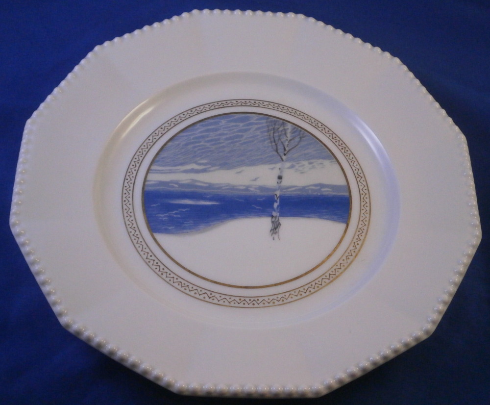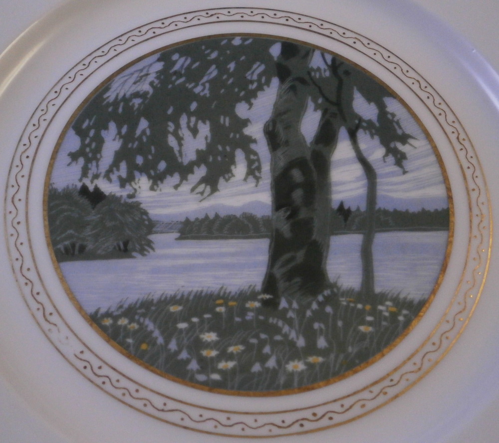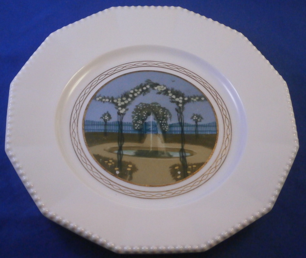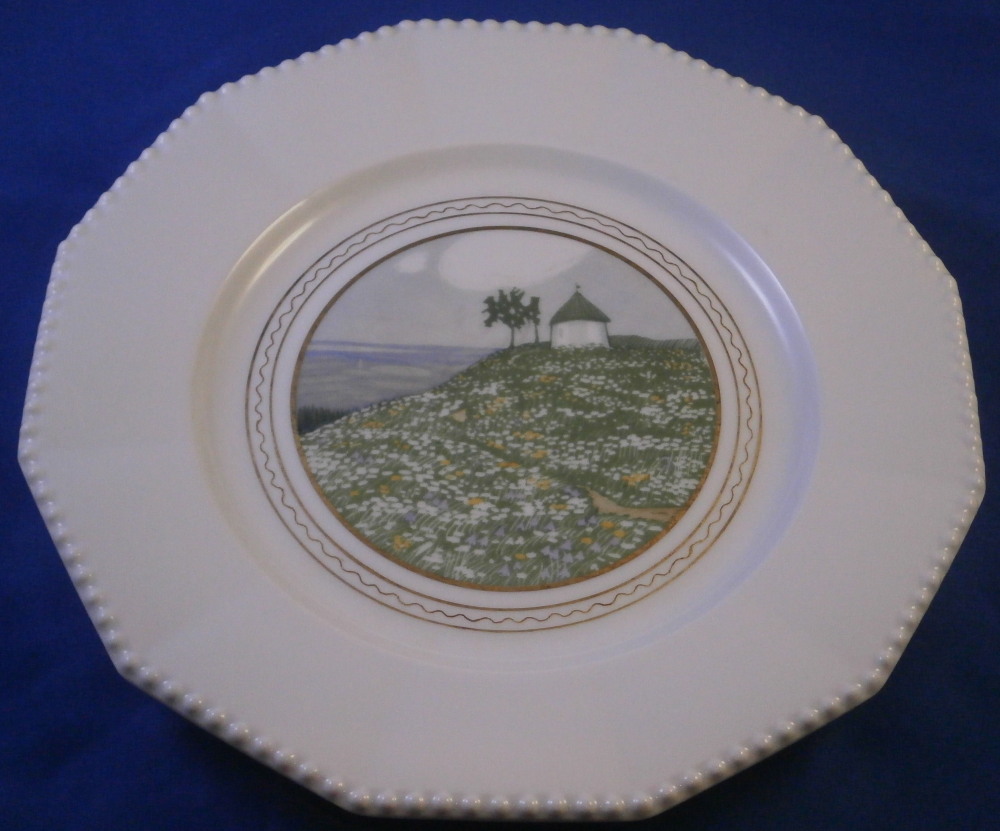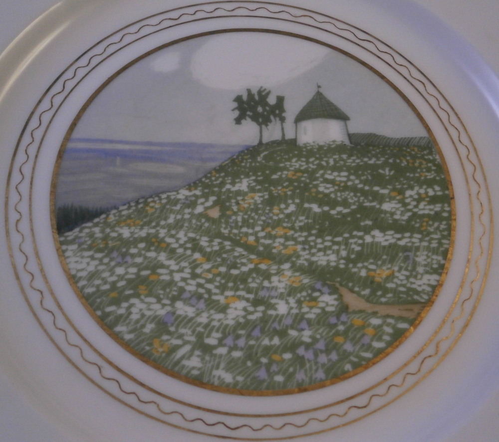 This is a rare set of six dessert plates made by Nymphenburg in the early 20th century. The plate blank design itself is from the Pearl service with those little "pearls" along the edge - it is an old design dating back to the 18th century. The central painting on each however was done by Rudolf Sieck who was a superb painter that did these Art Nouveau scenes for them. He did some amazing work and these plates here are a great example! Each has a different scene and they are titled Rosengaertlein (little rose garden), Einsamer Weiher (lonely pond), Bodensee (Lake Constance), Chiemsee (a lake between Munich and Salzburg), Bergkapelle (mountain chapel) and last but not least Abend (evening). Each is superbly hand painted with lots of details and they definitely have that Art Nouveau / Jugendstil flair to them of this period. Each scene is surrounded by a nice gold trim. The plates are 1 inch tall and 8.5 inches in diameter. Each is well marked with the printed green shield mark with the word Nymphenburg underneath, the impressed shield mark, as well as R. B. over D. 22, RUD. SIECK and the title of the scene under that. They all also have their rare black shield mark with Royal Nymphenburg around a shield and crown with Bavaria under that. One finds that on exported pieces from time to time. Not sure when it was used but definitely in the early 20th century. The set is in suuperb condition without any chips, etc. but one plate has a color smear to the underside as shown. That does not affect the piece when used or on display at all. Please email me for more information or other pictures.