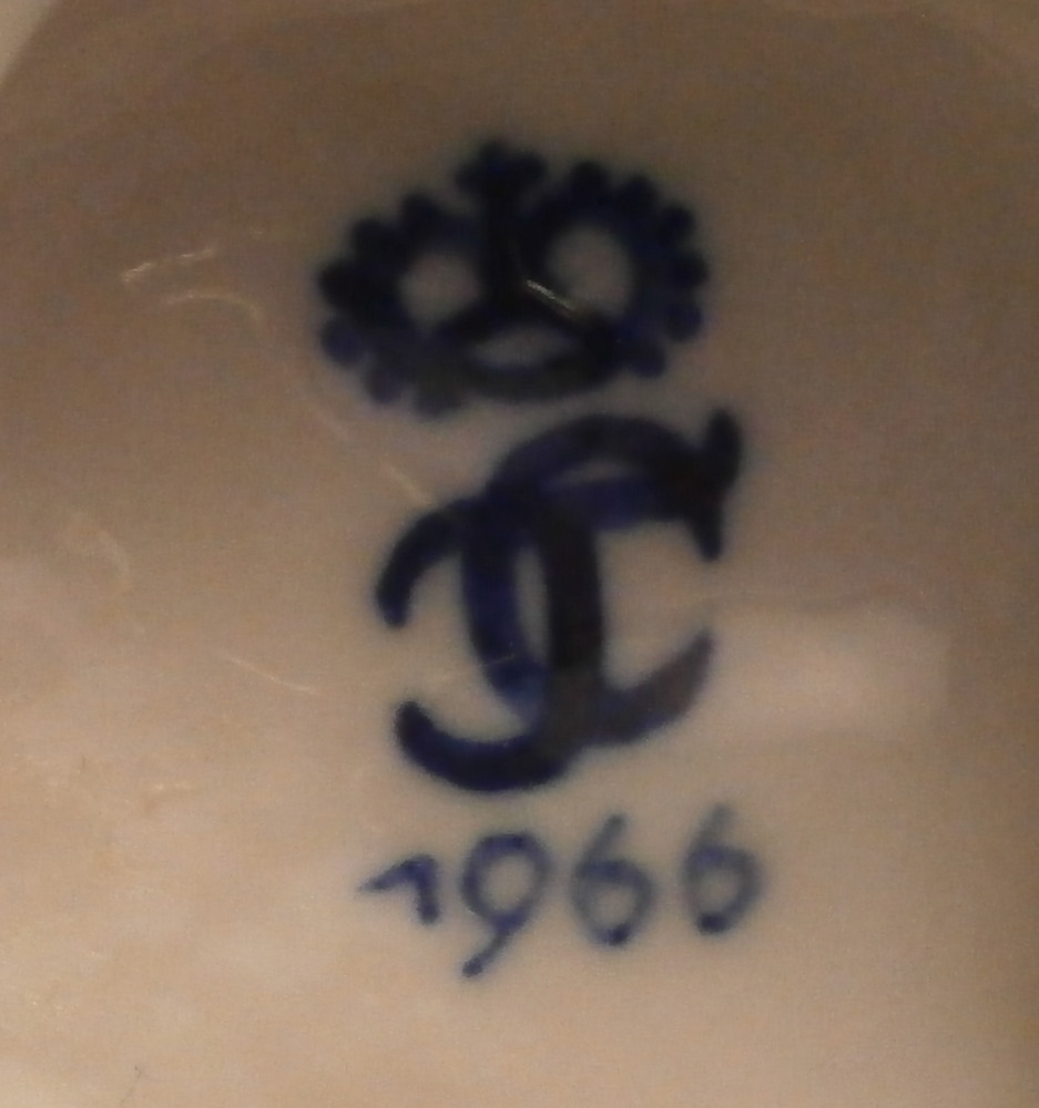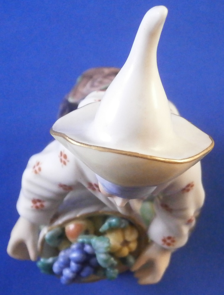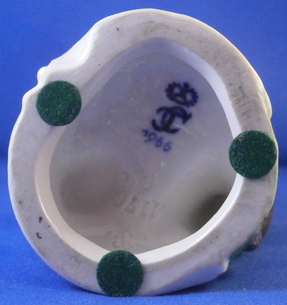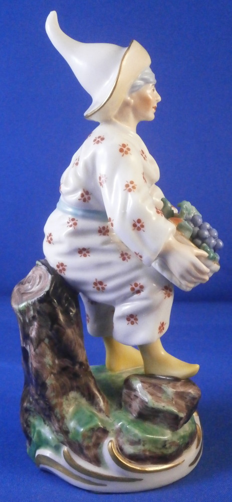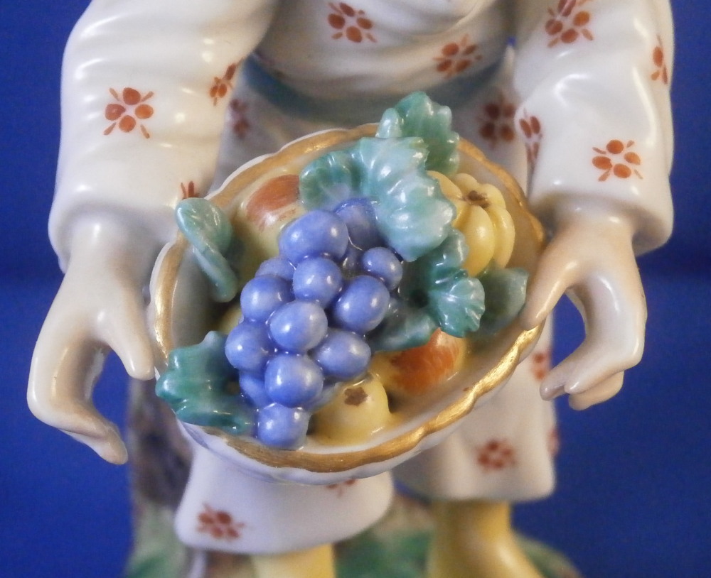This is a figure of a Asian / Oriental gentleman made by Nymphenburg, from a Frankenthal model of the 18th century, in 1966. Nymphenburg made a whole series of these and they are really nice and one does not see them often at all, It is of a gentleman dressed in Oriental clothing holding reticulated basket filled with fruit and their leaves. I easpecially like his pointy hat. He is standing on a nicely done base with some gold scrolls to the edge. Off course based on an 18th century Frankenthal model hence the CT mark as well as the Nymphenburg mark. The figure is 5.25 inches tall, 2.25 inches wide and 2.375 inches deep. Marked with the impressed shield mark to the underside with the numbers 1176 over 6 c I think - a bit hard to make out. Plus the CT monogram under the crown as well as the year mark for 1966 in under glaze blue. The figurine is in perfect condition which is always a nice bonus! Please email me for more information or other pictures.