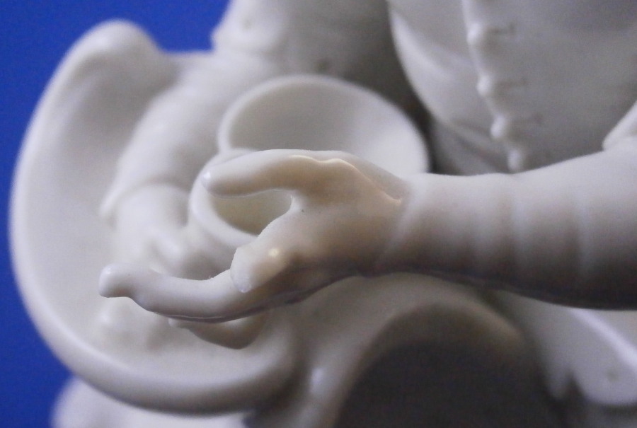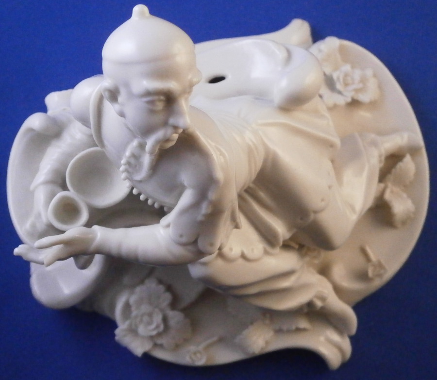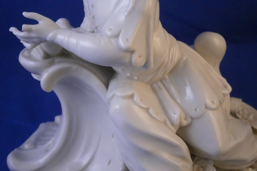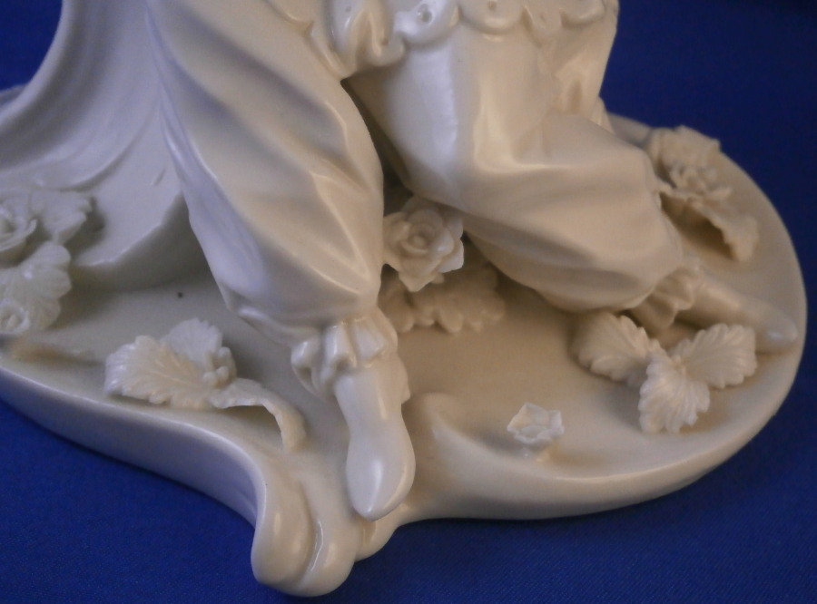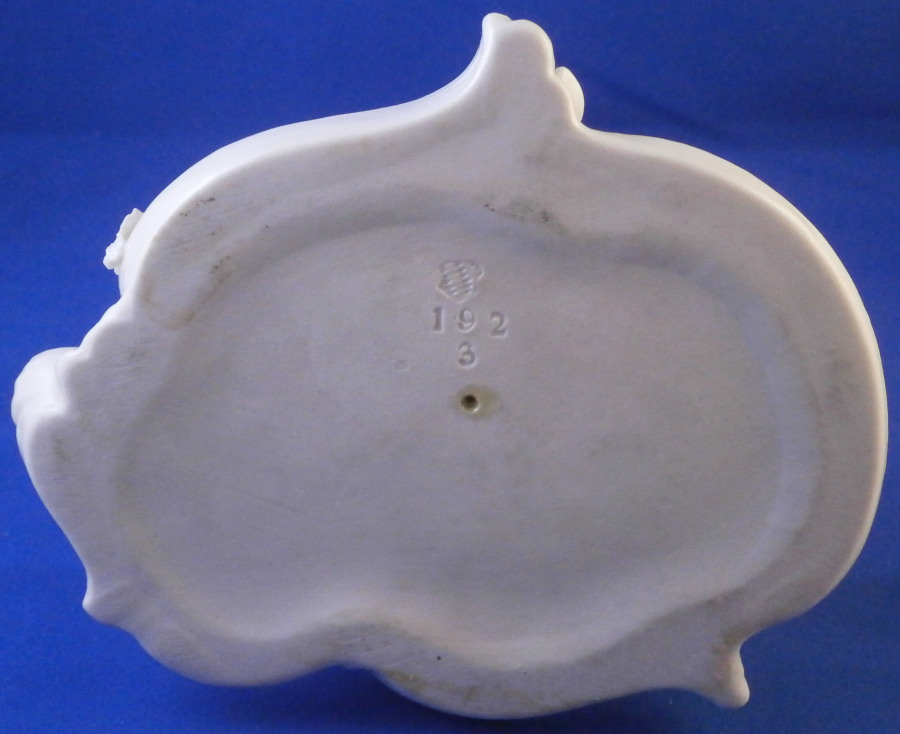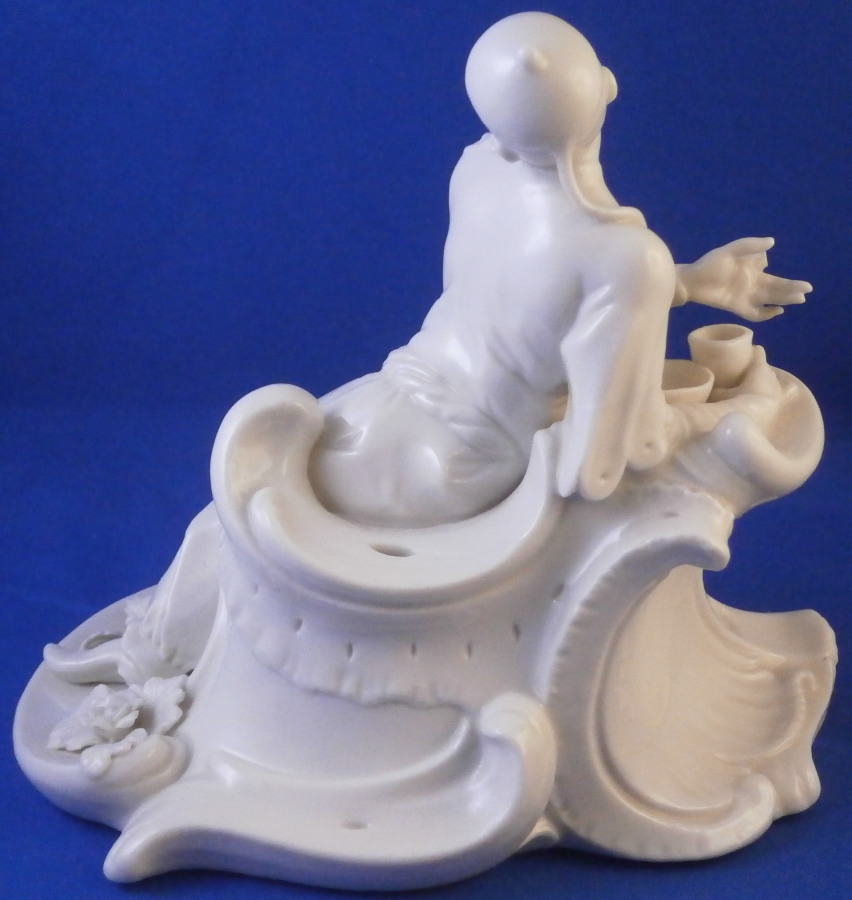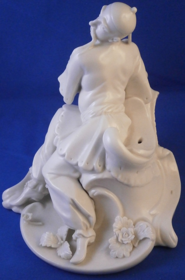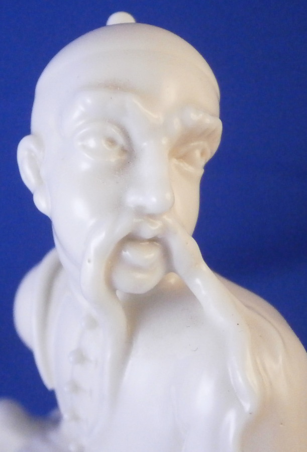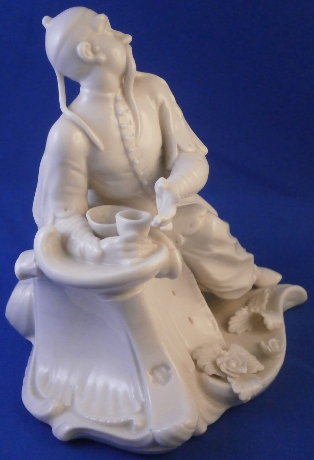 This is a figurine of a Asian gentleman having tea made by Nymphenburg in the early 20th century. He is often described as a Turk and sometimes as an Oriental but with a beard and braid like that I would definitely say he is Asian! The gentleman is relaxing against a rococo ornament on a rococo base with flowers strewn all around. He is wearing a flowing outfit and has a small tea cup in his right hand with a larger teabowl next to it. It's a relaly nicely modeled piece left in the white to show off all that amazing detail. Originally they were off course modelled by Bustelli in the 18th century. This also comes in a painted version though one rarely ever sees it. A really fun piece that is stunning and elegant looking. The figure is 4.75 inches tall, 5.375 inches wide and 4.625 inches deep. It is in great condition with the index finger of his left hand mostly missing and a chip to one of the leaves on the base. It displays nicely! The figurine is marked with the impressed shield mark to the top side of the base under the place where the cups sit and underneath as well as the impressed numbers 192 over 3. Please email me for more information or other pictures.