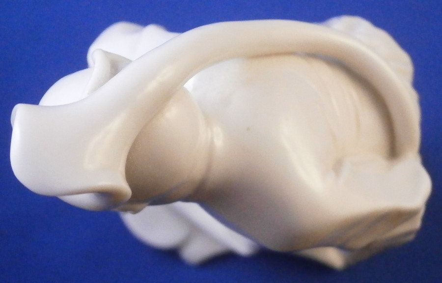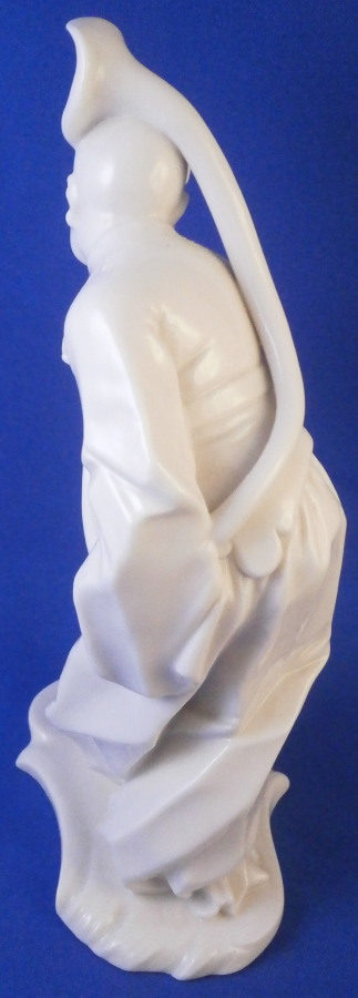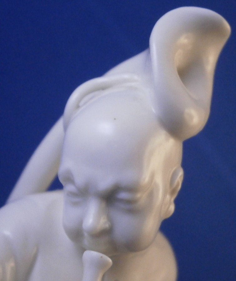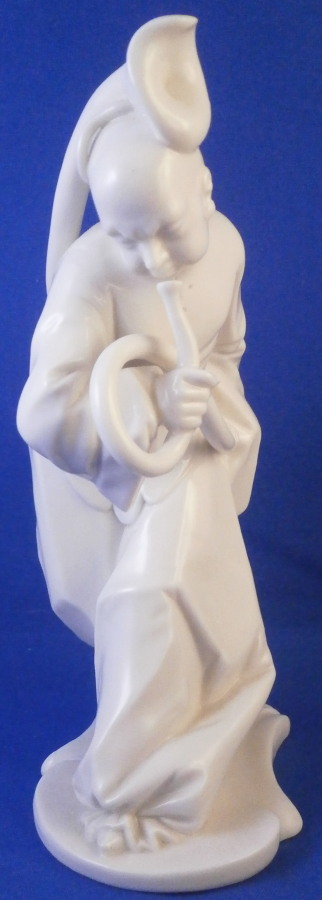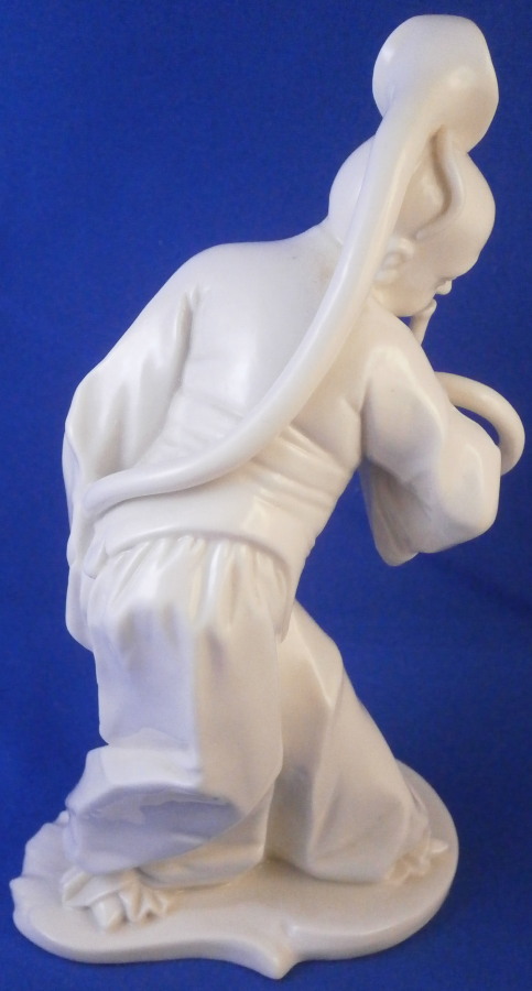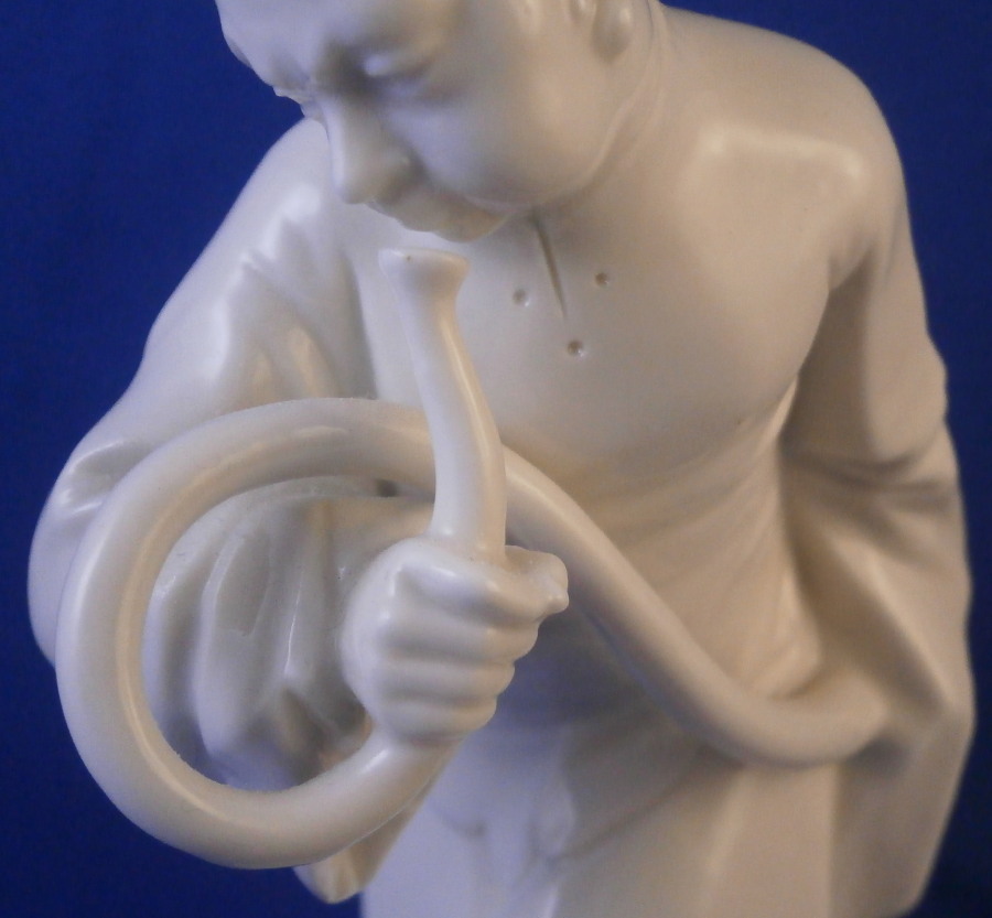 This is a figurine of a musician playing the serpent made by Nymphenburg in the early 20th century. Lavish parties of the Rococo high society were often accompanied by the commanding bass tone of the serpent. The figure comes from a series of 17 or 18 figurines I think - this being one of the harder to find pieces especially in perfect condition. In this case the instrument ends over his head but I ahve the other piece where it goes under his arm as well. I think I ahve 8 of the figures from this set now and it's one of my favorite! They all sit on a shelf in my office :) Originally they were off course modelled by Bustelli in the 18th century. This is the blanc de chine version but this also comes in a painted version though one rarely ever sees it. The figure has the monk looking young gentleman dressed in a flowing top and pants blowing into the instrument while holding it with his right hand and under his left arm to over his head. He is standing on a typical base. A really fun piece that is stunning and elegant looking. This piece is amazingly modeled and one can see why Bustelli is still considered the greatest modeler of all time. The figurine is 5.625 inches tall, 2 inches wide and 3.125 inches deep. It is in perfect condition! The figurine is marked with the impressed shield mark to the top side of the base and underneath as well as the impressed numbers 489 over 3. Please email me for more information or other pictures.