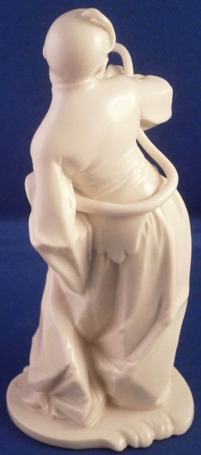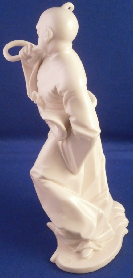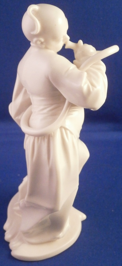 This is a figurine of a musician playing the serpent made by Nymphenburg in the late 20th century. Lavish parties of the Rococo high society were often accompanied by the commanding bass tone of the serpent. The figure comes from a series of 17 or 18 figurines I think - this being one of the harder to find pieces especially in perfect condition. Originally it was off course modelled by Bustelli in the 18th century. This is the blanc de chine version but this also comes in a painted version though one rarely ever sees it. I own a few other pieces from this series as well and they are probably my favorite figures besides the commedia dell'Arte off course. The figure has the monk looking young gentleman dressed in a flowing top and pants with a bow in the front blowing into the instrument while holding it with his right hand and under his left arm. He is standing on a typical base. A really fun piece that is stunning and elegant looking. This piece is amazingly modeled and one can see why Bustelli is still considered the greatest modeler of all time. The figurine is 5.625 inches tall, 2.75 inches wide and 2.125 inches deep. It is in perfect condition! The figurine is marked with the impressed shield mark to the top side of the base and underneath as well as the impressed numbers 490 and an incised 35. Please email me for more information or other pictures.