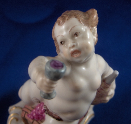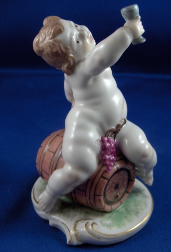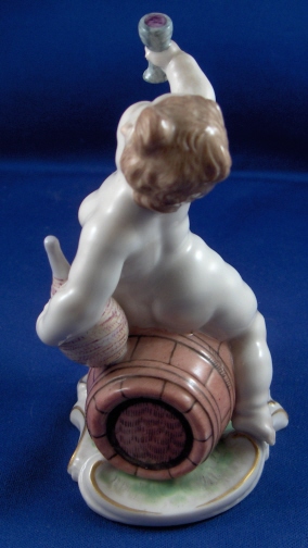 This is a figurine of the wine god Bachus or Bacchus made by Nymphenburg in the beginning of the 20th century. He is in form of a putto sitting on an oak keg or barrel with a wine bottle under his arm and a glass of wine in his hand. Grapes covering his private area. Very detailed and lifelike. The figurine is 4.5 inches tall, 2.5 inches wide and 2.75 inches deep. He is in perfect condition. The piece is marked underneath with the impressed numbers 241 over 3 and the shield mark as well as Germany in green. There is also an impressed shield on the back of the keg as shown in the pictures. Please email me for more information or other pictures.