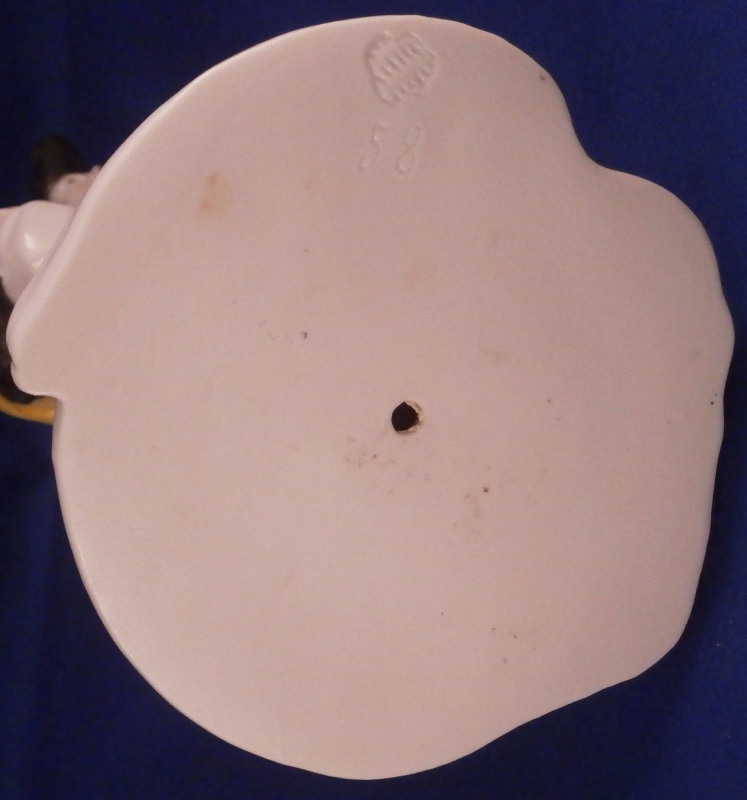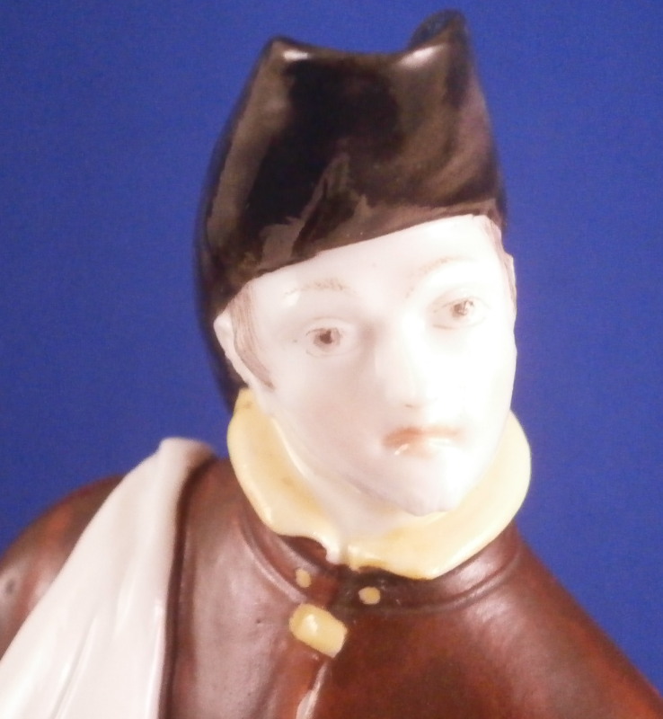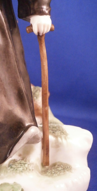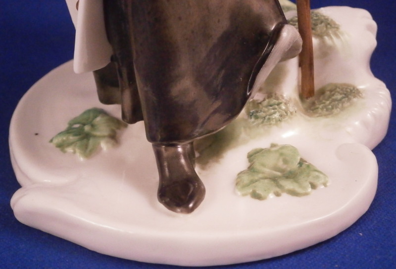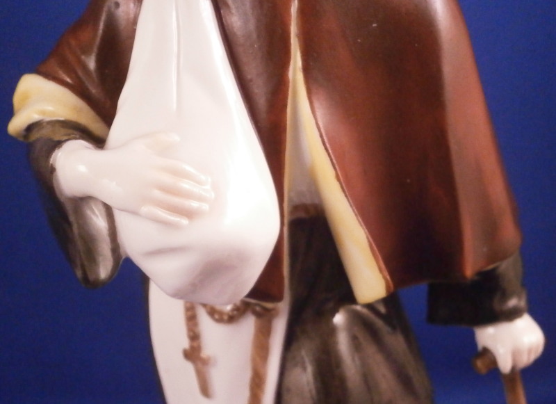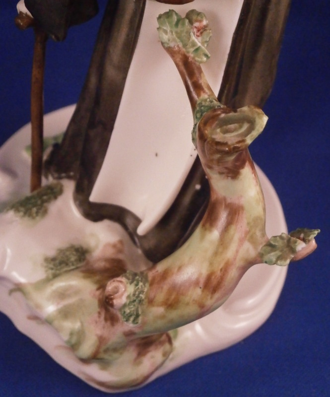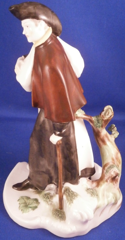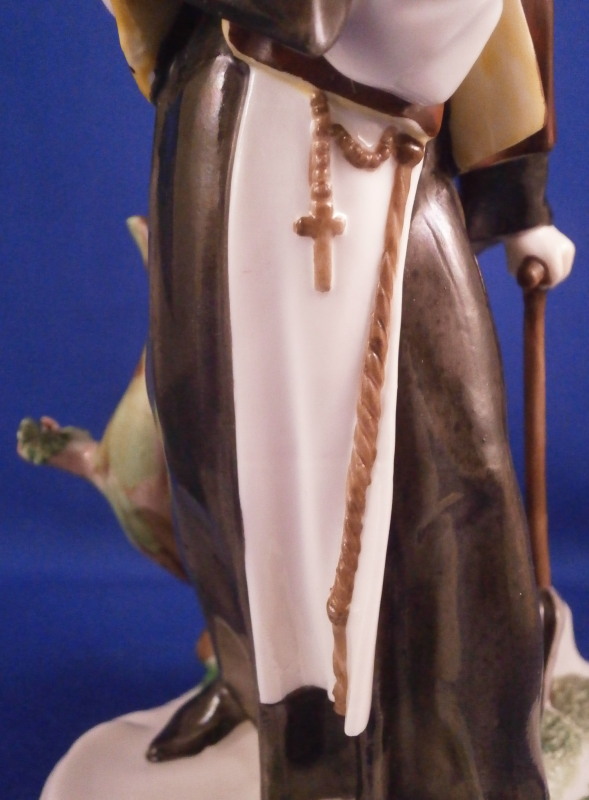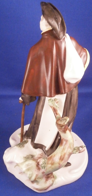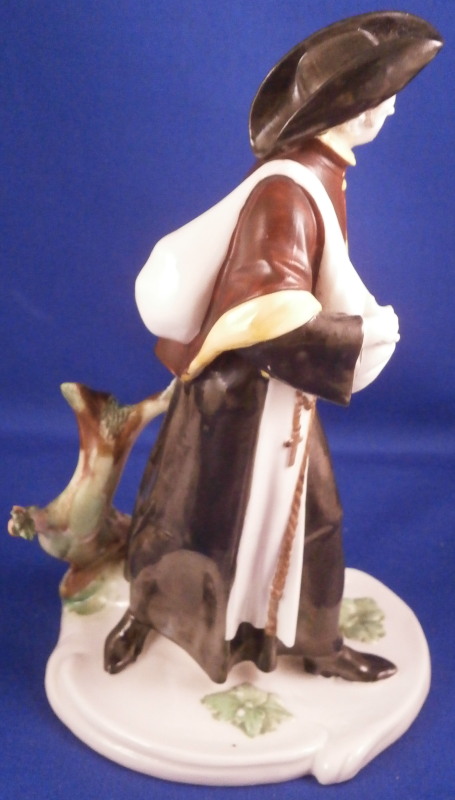 This is a nice figurine of a monk or friar made by Nymphenburg in the early 20th century. He is traveling the road with a bag thrown over his shoulder and a cane in his left hand. Dressed with a long black robe with a brown and yellow top. He is wearing a hat and the cross is hanging of the side. Typical base with the addition of some greenery and a tree growing up the back side. It is a really nice figure that one does not find very often especially the painted version. The piece is in great condition with a chipped leaf to the tree, two spots on the greenery of the base that have a touch of green flaked off and a few minor black firing spots from when it was made. A very early example of these redos after the 18th century originals! The figure is marked with their impressed shield mark on the underside plus the incised model number 58. The figure is 6.5 inches tall, 3.75 inches wide and 4 inches deep. Please email me for more information or other pictures.