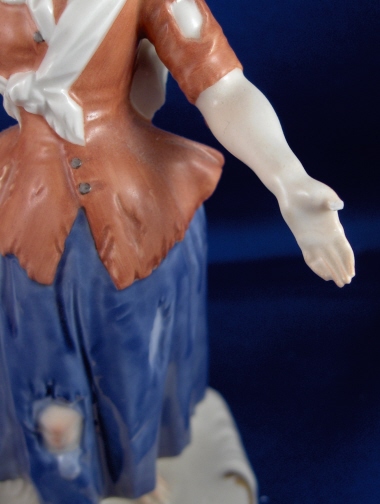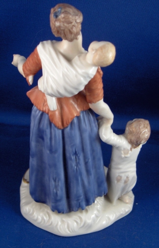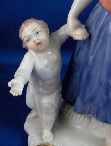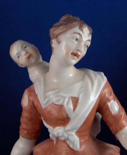 This is a lady beggar made by Nymphenburg in the beginning of the 20th century. Originally designed by Bustelli off course like most of these figurines. An amazing and uncommon piece! Very detailed and lifelike. She has a baby on her back and a young child next to her also begging. The clothes are ripped and one can see the agony in their faces! The figurine is 7 inches tall, 3.875 inches wide and 3.5 inches deep. The piece is in great condition with a the bow on top of her head chipped and the thumb on her left hand missing. The piece is marked underneath with the impressed 818 (hard to make the middle number out!) over 0 and the shield mark is impressed as well. Also Germany in Green. Please email me for more information or other pictures.