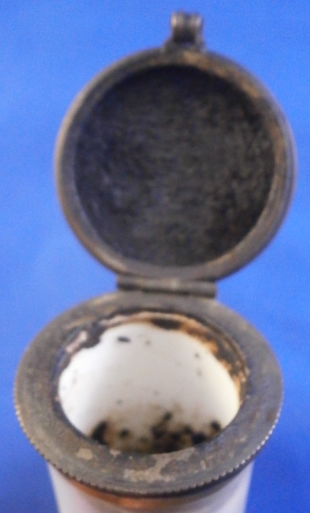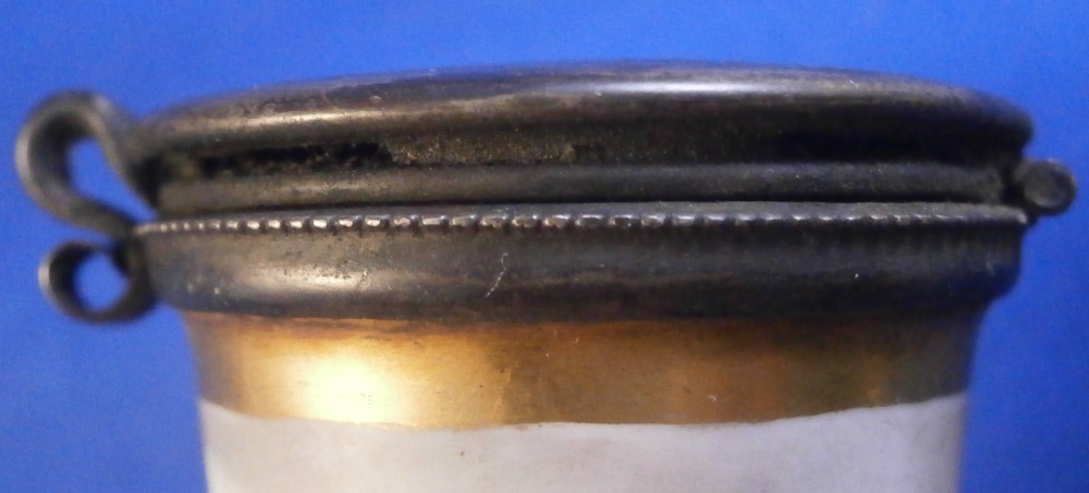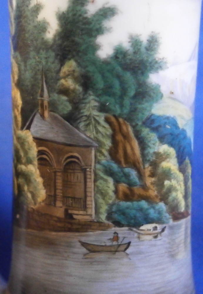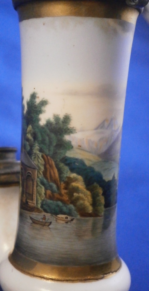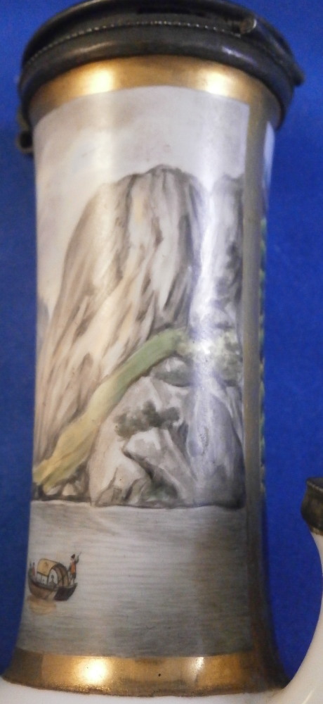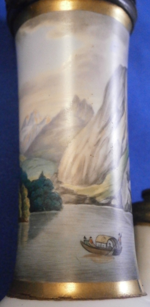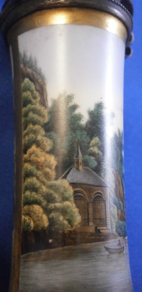 This is a porcelain pipe bowl made by the Nymphenburg factory during the Biedermeier period in about 1820. A known shape by them which looks really nice. It is hand painted with a nice scene including a boat on a river with mountains to one side and a smaller boat by a building with trees on the other side. I am not familiar with this scene but maybe someone out there knows and a quick note would be appreciated! The scene has a thick simple gold trim around it. Metal fitting to the smaller end and a lid to the top opening. The metal parts are tarnished but looks to be made of silver or at least plated. It's a great looking pipe and the scene is of superb quality! The pipe is in superb condition. It has been smoked heavily and the residue is still inside. With a quick cleaning and polishing it would look like new again! It is unmarked which is normal for Nymphenburg pipes but this is a known shape by them and the qulity of the scene fits as well. The piece is about 3.625 inches tall, 2.5 inches deep and 1.375 inches wide. The top opening has a diameter of just under 1 inch on the inside. Please e-mail me for more information or photos.