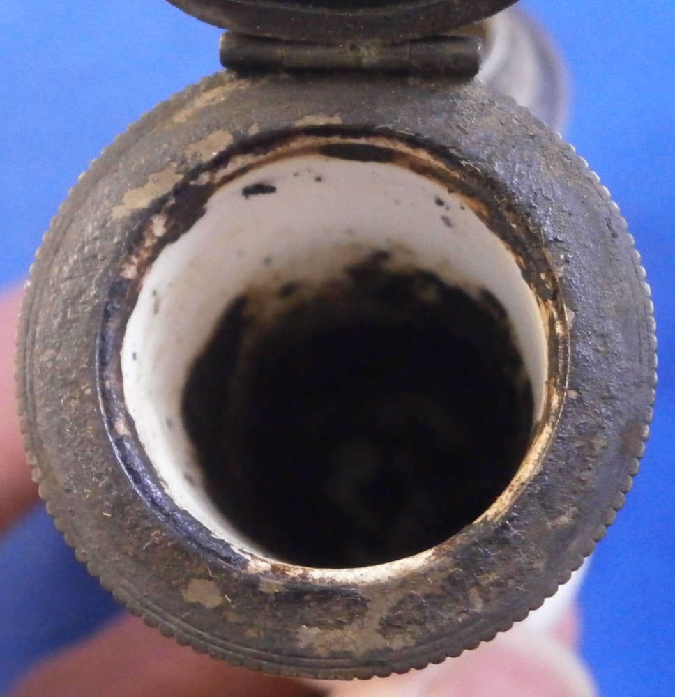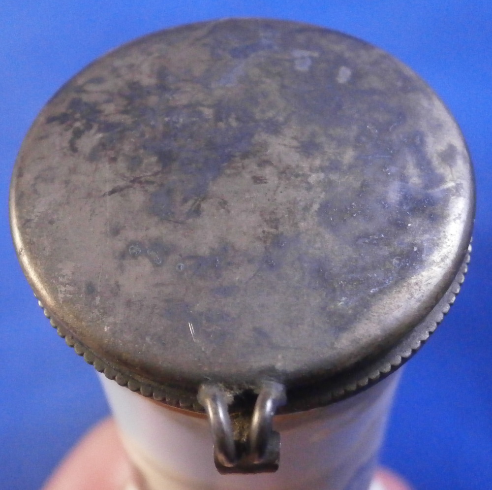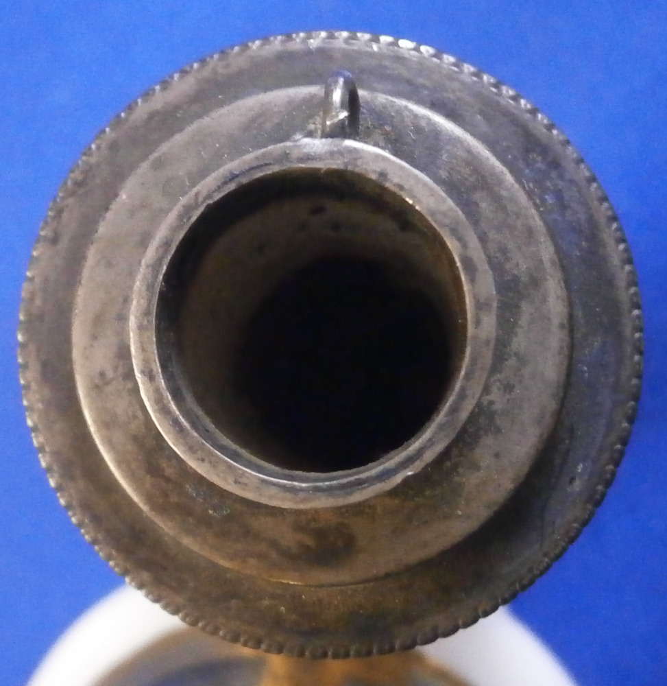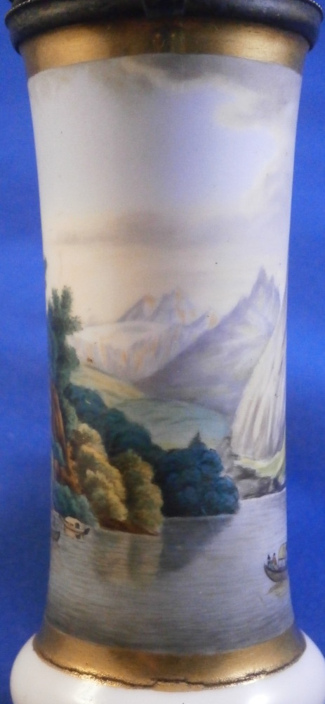 This is a porcelain pipe bowl made by the Nymphenburg factory during the Biedermeier period in about 1820. A known shape by them which looks really nice. It is hand painted with a nice scene including a boat on a river with mountains to one side and a smaller boat by a building with trees on the other side. I am not familiar with this scene but maybe someone out there knows and a quick note would be appreciated! The scene has a thick simple gold trim around it. Metal fitting to the smaller end and a lid to the top opening. The metal parts are tarnished but looks to be made of silver or at least plated. It's a great looking pipe and the scene is of superb quality! The pipe is in superb condition. It has been smoked heavily and the residue is still inside. With a quick cleaning and polishing it would look like new again! It is unmarked which is normal for Nymphenburg pipes but this is a known shape by them and the qulity of the scene fits as well. The piece is about 3.625 inches tall, 2.5 inches deep and 1.375 inches wide. The top opening has a diameter of just under 1 inch on the inside. Please e-mail me for more information or photos.