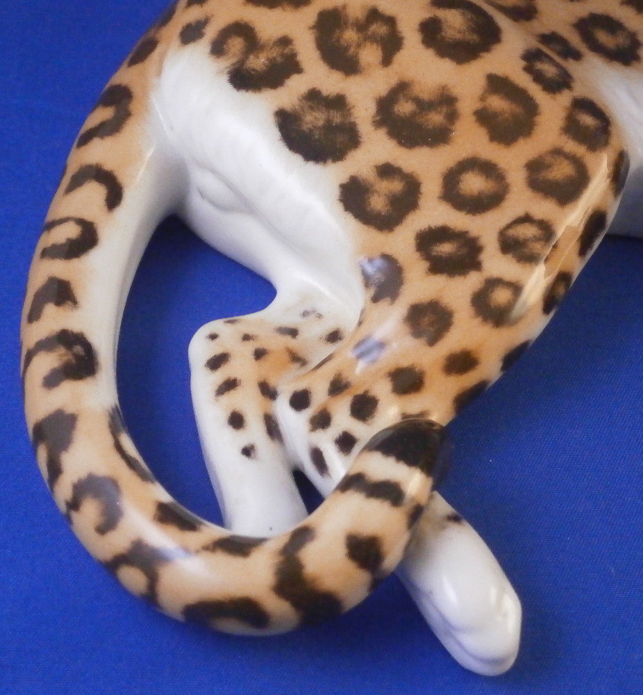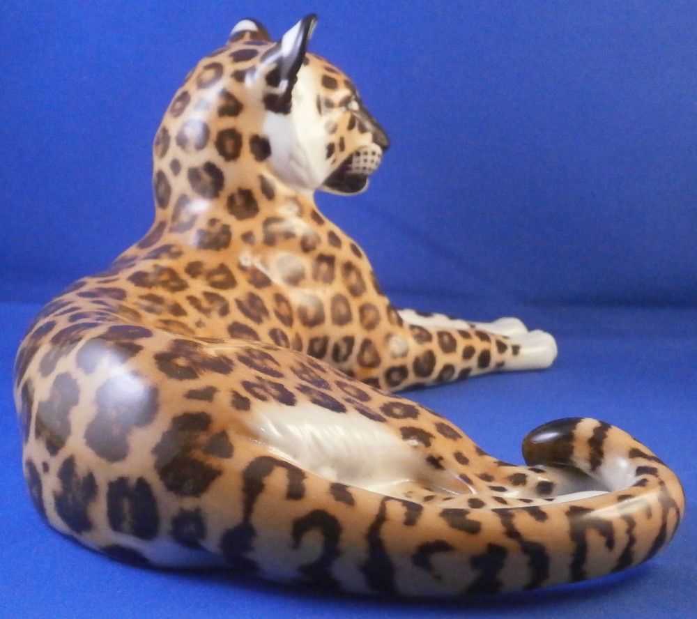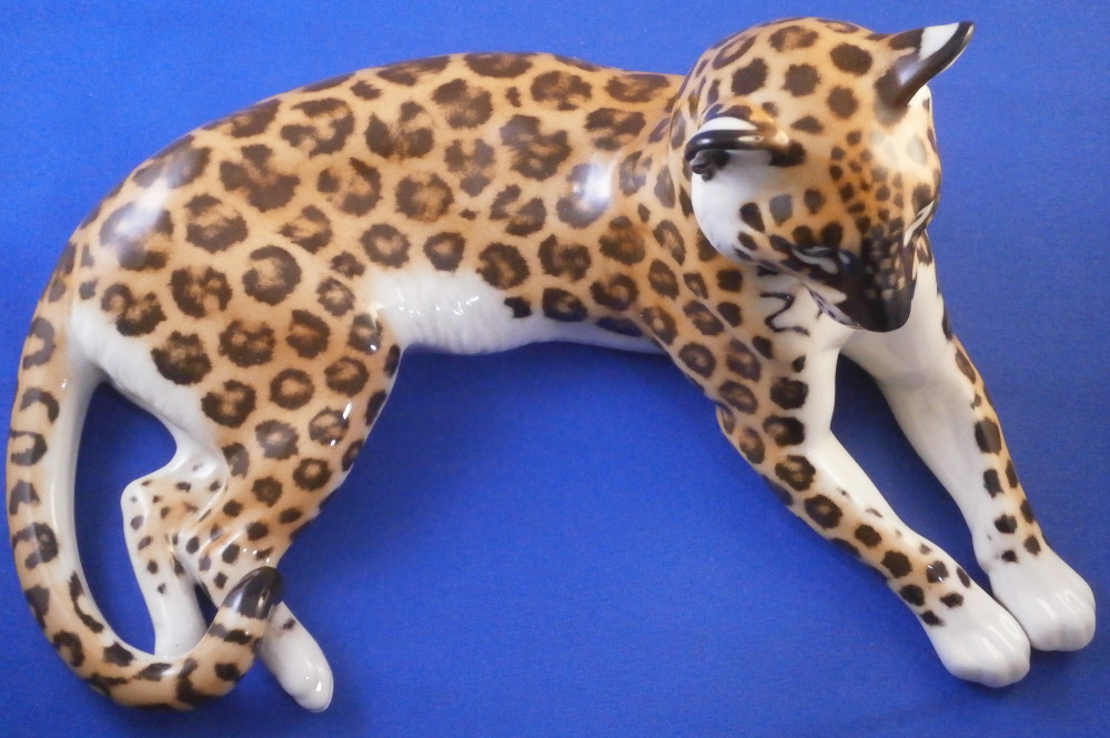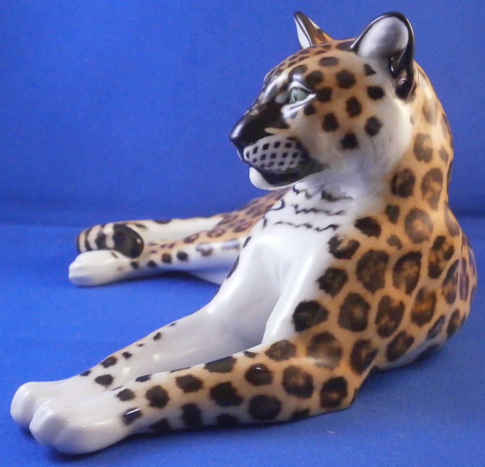This is a superb figurine of a leopard made by Nymphenburg in the mid 20th century right after WWII. It was first designed by Kaerner around 1911 and is one superbly modeled and painted animal figurine! One of my all time favorites! Look at all those spots and the piercing green eyes. Does not get better than this! The big cat is 4.375 inches tall, 6 inches deep and 9.875 inches long. The figure is marked with the impressed shield mark underneath with the model number 153 over 4 as well as the green shield mark with Nymphenburg under it and Western Germany under that. He is in perfect condition and truly an amazing piece! Please email me for more information or other pictures.