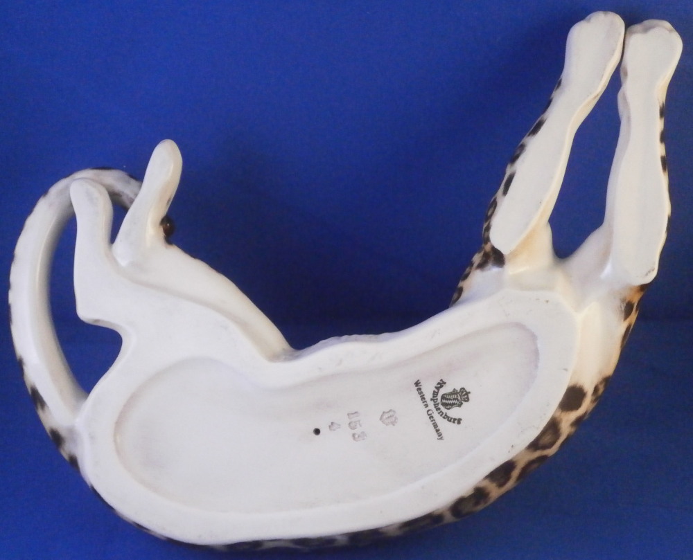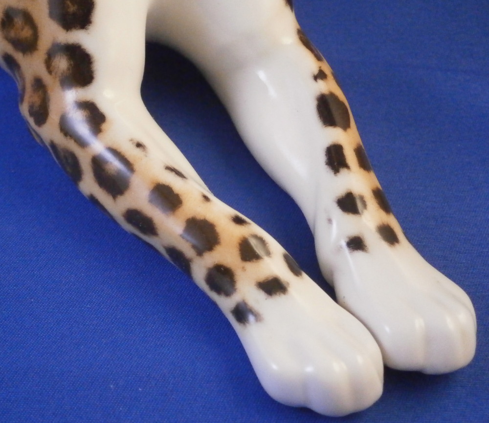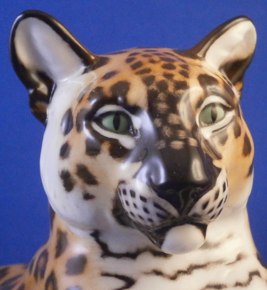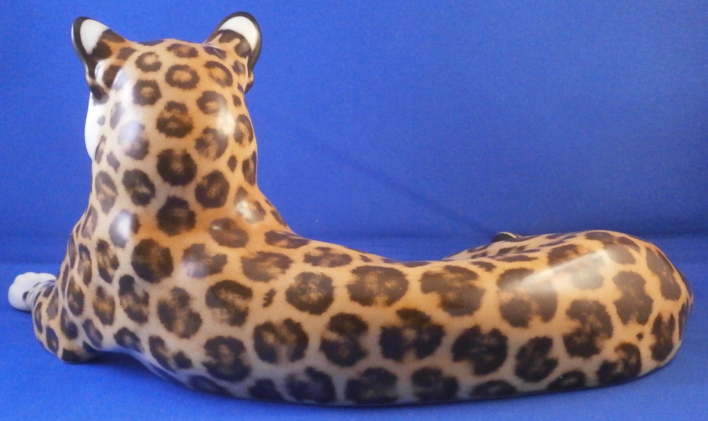 This is a superb figurine of a leopard made by Nymphenburg in the mid 20th century right after WWII. It was first designed by Kaerner around 1911 and is one superbly modeled and painted animal figurine! One of my all time favorites! Look at all those spots and the piercing green eyes. Does not get better than this! The big cat is 4.375 inches tall, 6 inches deep and 9.875 inches long. The figure is marked with the impressed shield mark underneath with the model number 153 over 4 as well as the green shield mark with Nymphenburg under it and Western Germany under that. He is in perfect condition and truly an amazing piece! Please email me for more information or other pictures.