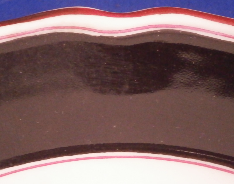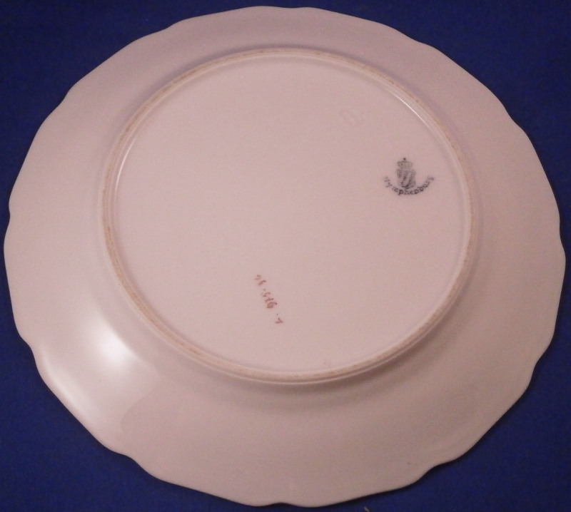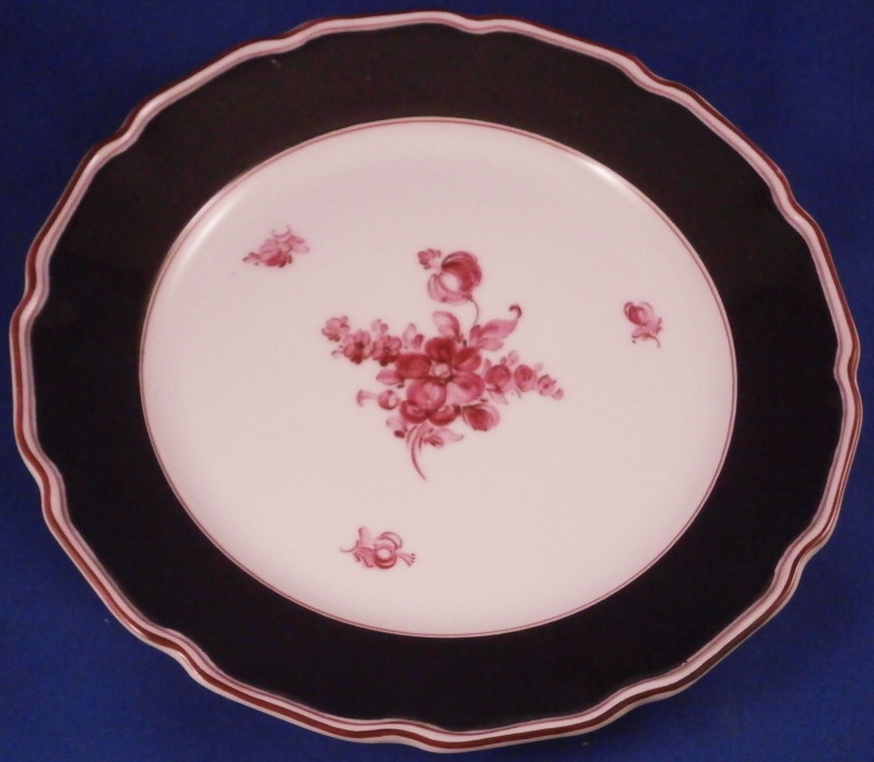This is a pair of little side plate made by Nymphenburg in the 20th century. Each is hand painted with a puce floral arrangement in the center as well as three small single flowers but my favorite part is the black ground color on the rim with the puce trim. It looks stunning! This color combination is one of my favorite that just doesn't get old. One plate is in great condition with just a spot on the black ground where the white is showing while the other plate has a large chip out of the edge as shown. Both are marked with the green shield under the crown with Nymphenburg under it, the impressed shield mark as well as some puce letters and numbers as shown. Each plate is 0.75 inches tall and 6.875 inches in diameter. Please email me for more information or other pictures.