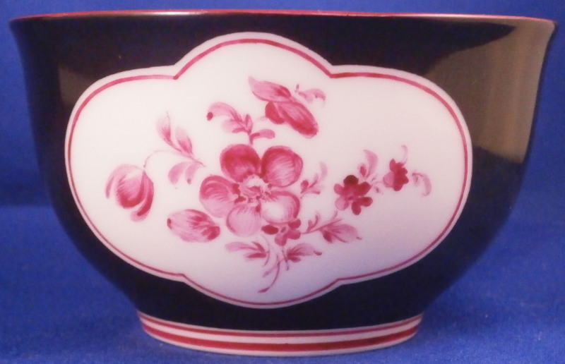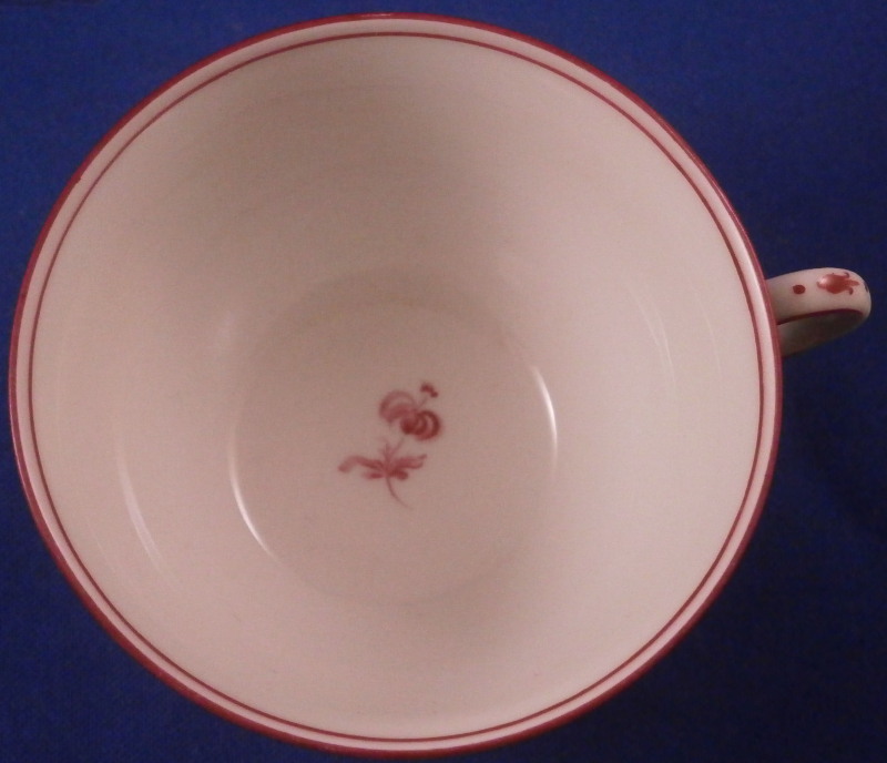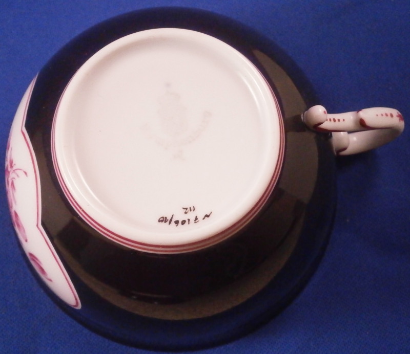 This is a nice cup and saucer made by Nymphenburg in the 20th century. Both pieces are hand painted with a puce floral arrangement with the saucer also having two small single flowers on it but my favorite part is the black ground color around the rest of the cup and underside of the saucer with the puce trim. It looks stunning! This color combination is one of my favorite that just doesn't get old. The set is in perfect condition. The set is marked with the green shield under the crown with Nymphenburg under it and some black letters and numbers on the cup and a partial impressed shield and number under the saucer. The saucer is just over 1 inch tall and 5.375 inches in diameter. The cup is 2 inches tall with a diameter of just under 3.5 inches. Please email me for more information or other pictures.