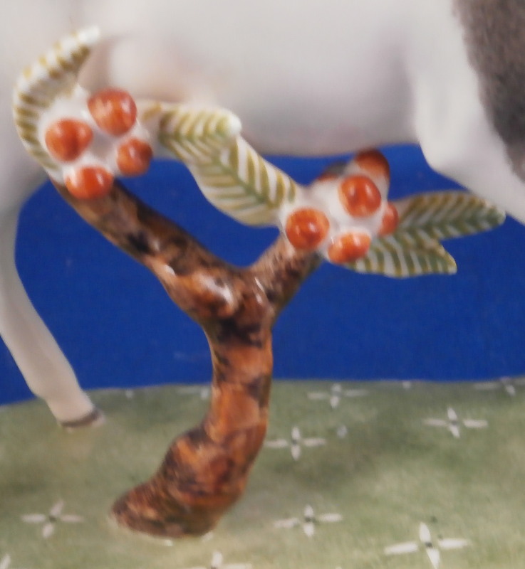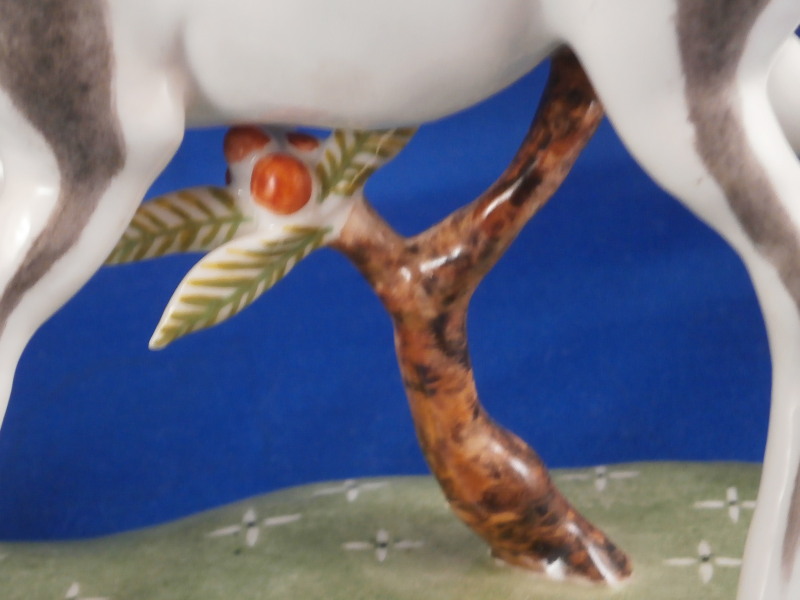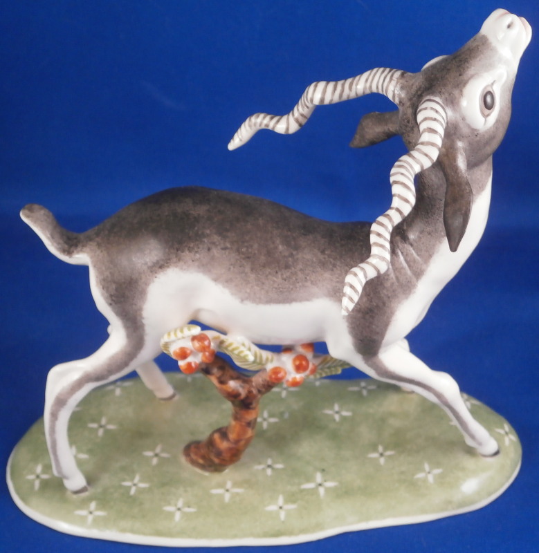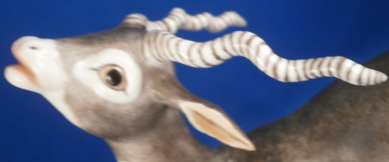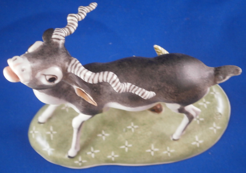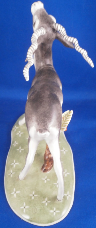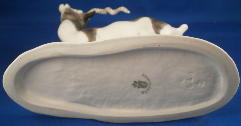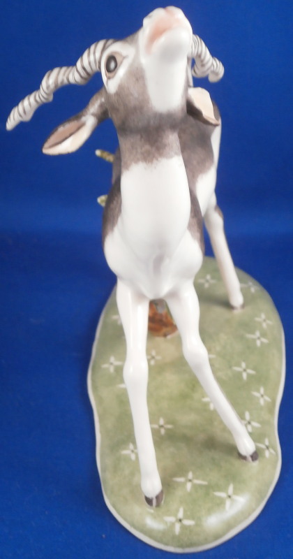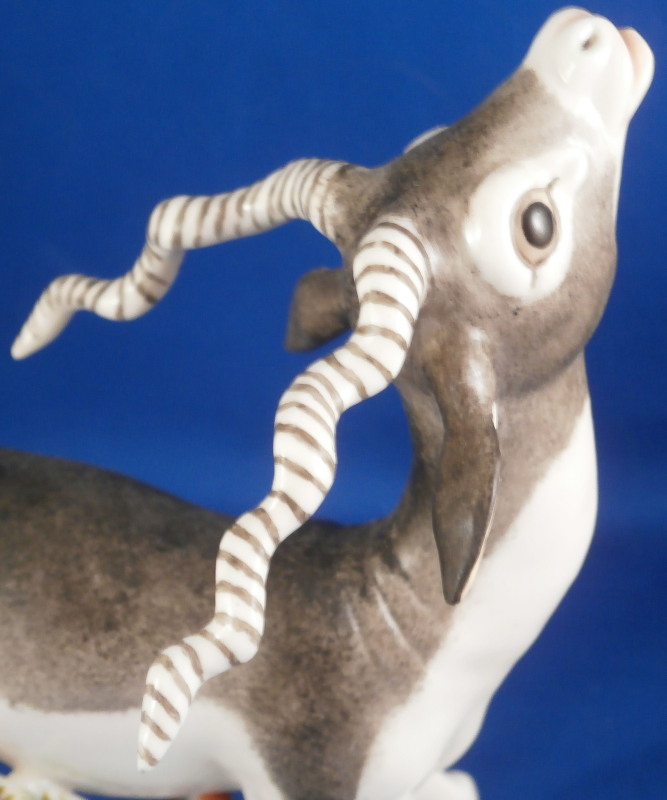 This is a figurine of a male blackbuck antelope made by Nymphenburg during the mid 20th century. I also own the female counterpart which is also on the site. The piece is quite cute with a flowery green base with the little tree underneath and the large eyes of the antelope as well as the long black and white horns - it reminds me of the pieces designed by Terletzki-Scherf but I am not sure if she made this one here as well. The piece is superbly modeled and hand painted and really has lots of superb detail! A stunning and fun figure to look at! The piece is 5.5 inches tall, 2.625 inches wide and 5.875 inches long. It is marked with the impressed shield mark on top of the base in the back though it is hard to see since it is painted over. Also an impressed shield mark underneath with the number 679 over 9 as well as the green shield mark with the word Nymphenburg underneath. The piece is in perfect condition. Please email me for more information or other pictures.