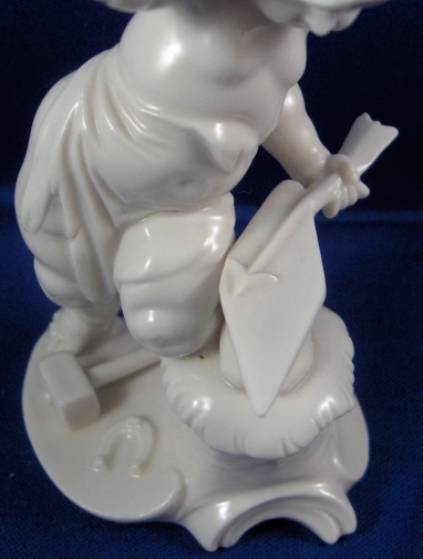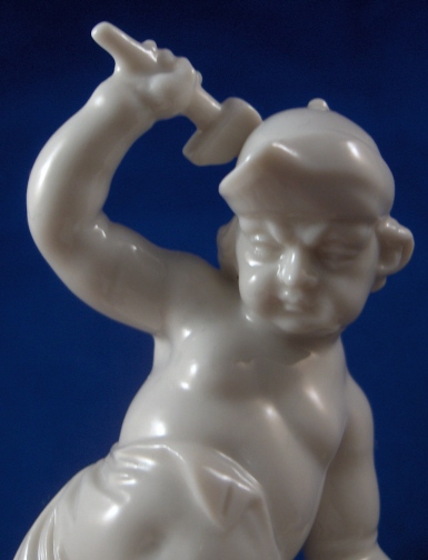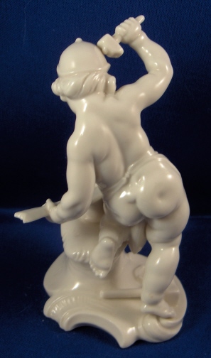 This is a figurine made by Nymphenburg around 1900. It is a putto as a blacksmith and quite detailed. Probably is supposed to be the god Vulcan. One sees this figurine once in a blue moon but I have never seen one in perfect condition before as usually the end of the arrow he is forging is missing or other parts. The figurine is marked underneath with the impressed shield mark as well as numbers 254 over 3 and another shield mark on the side of the base. The piece is in perfect condition. It is 4.375 inches tall, 2.75 inches wide and 2.25 inches deep. Please email me for more information or other pictures.
