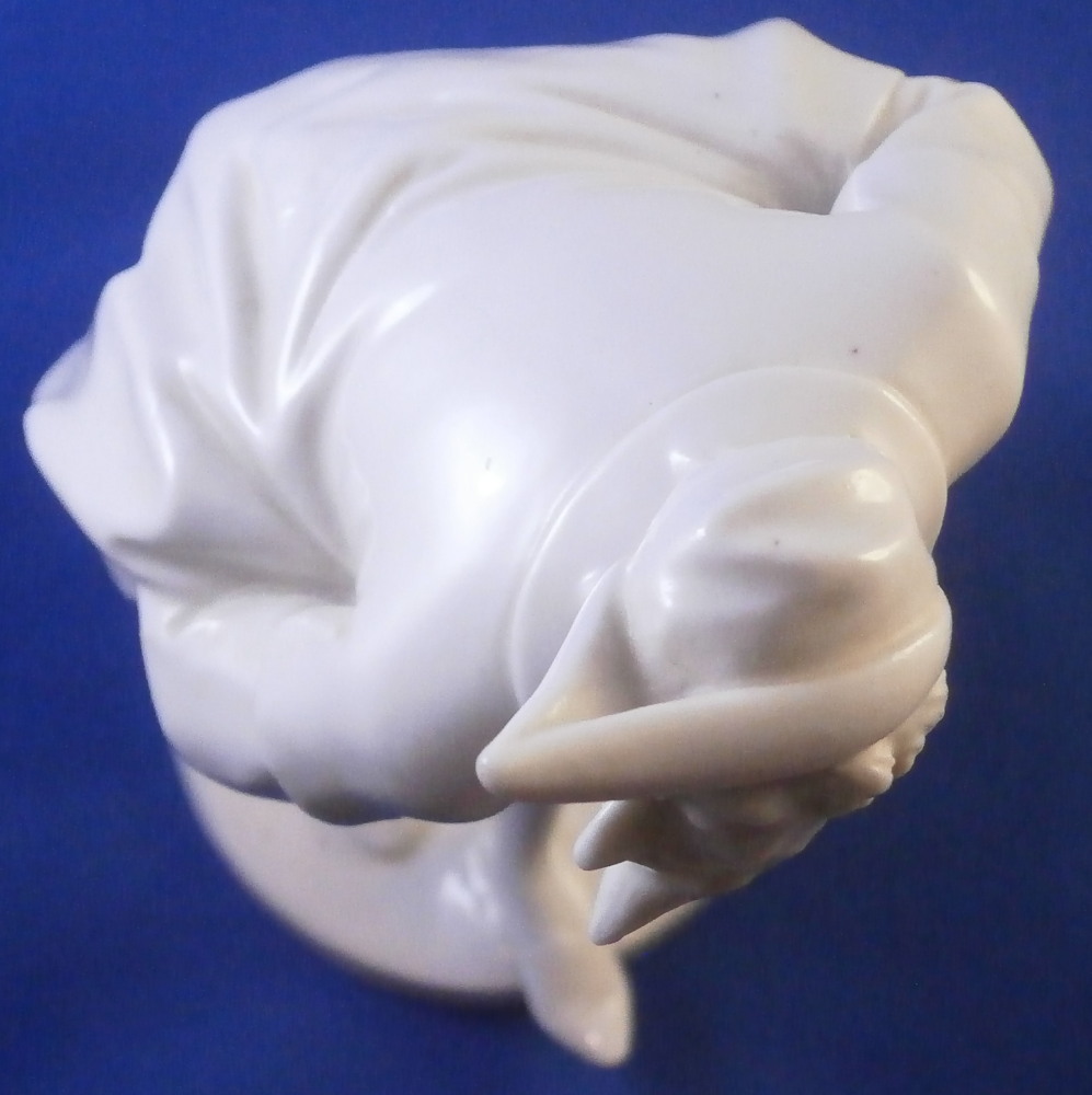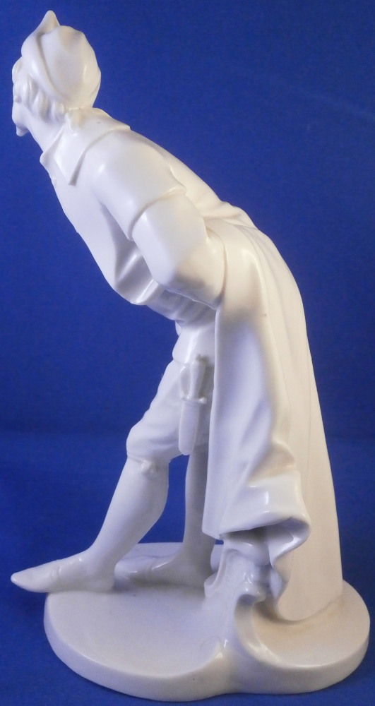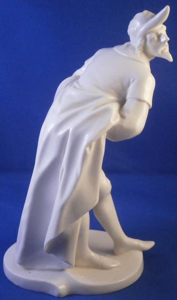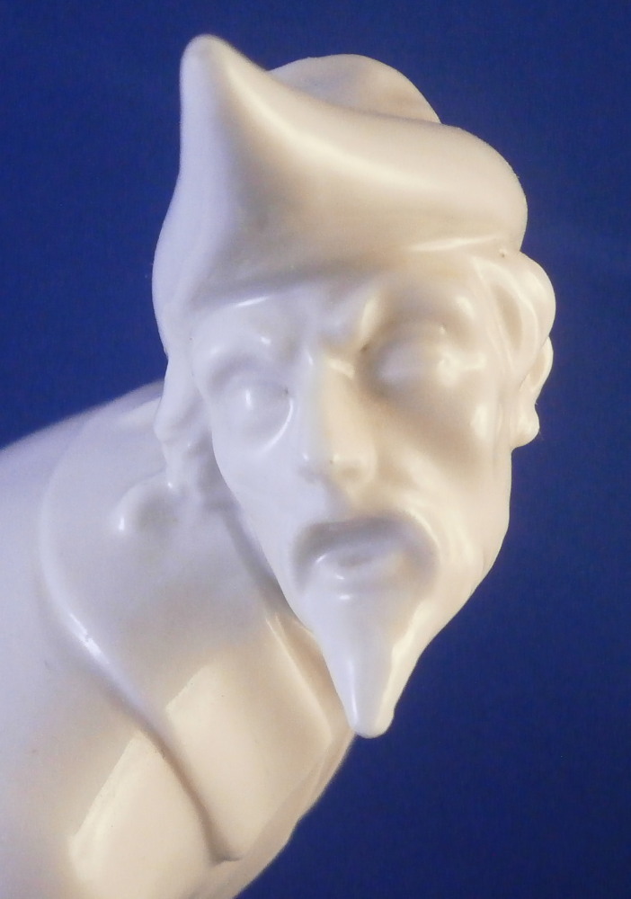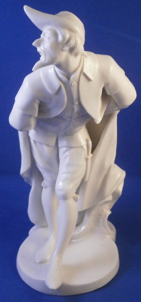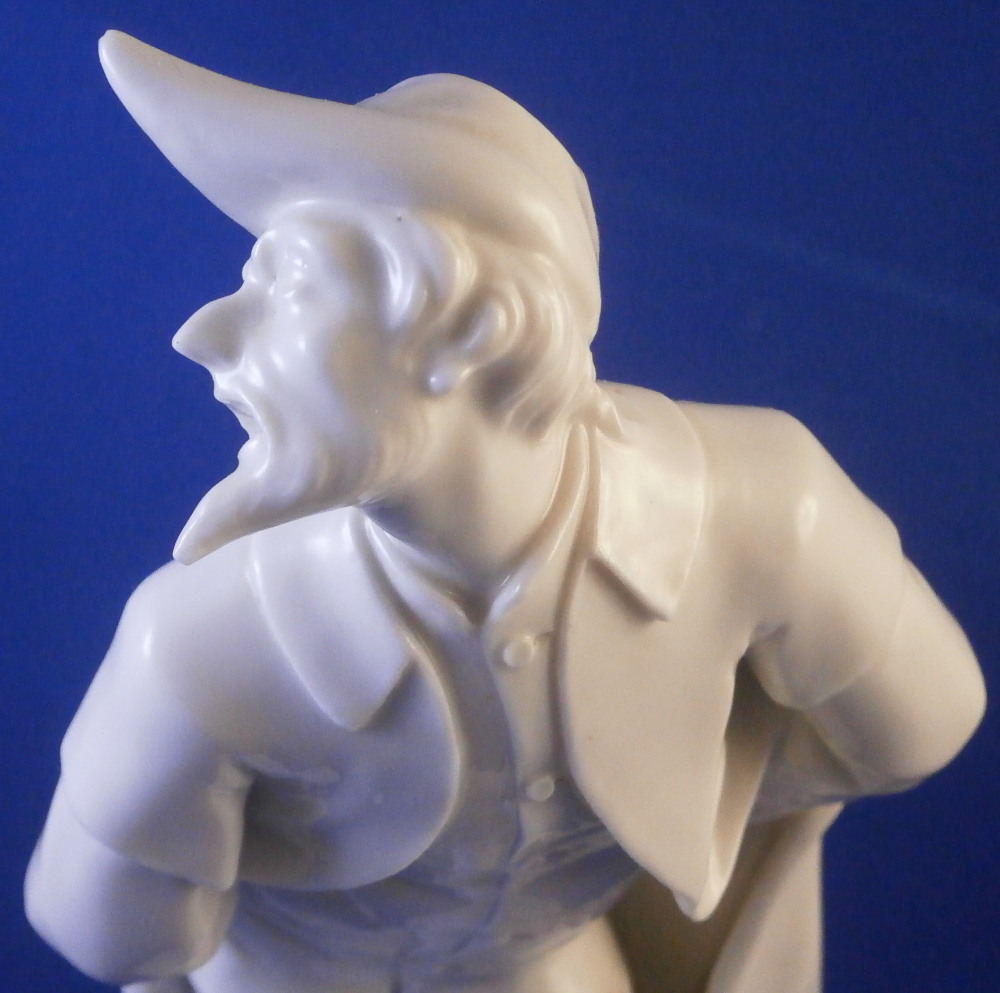 This is a superb figurine from the Commedia dell'arte aka the Italian Comedy made by Nymphenburg in the early 20th century. This figure is of Pantalone ( Pantaloon ) and is one of the most important principal characters found in commedia dell'arte. With his exceptional greed and high in society he is the "money" in the commedia world. His full name, including family name, is Pantalon de' Bisognosi , Italian for 'Pantalone of the Needy'. The figurine is superbly modeled and left in the white to show off all that nice detail. First designed by the best porcelain modeler of the 18th century - the famous Franz Anton Bustelli - it is just one elegant and fun piece to look at. The figure is 7 inches tall, 2.5 inches wide and 4.375 inches deep. The piece is marked with the impressed shield mark underneath and incised numbers 57 over II. I think this is one of the early redos after the molds got destroyed. The figurine is in great condition with a few tiny black spots and the tip of his hat feels rough so there must be the tiniest of nibbles. He displays perfectly! Please email me for more information or other pictures.