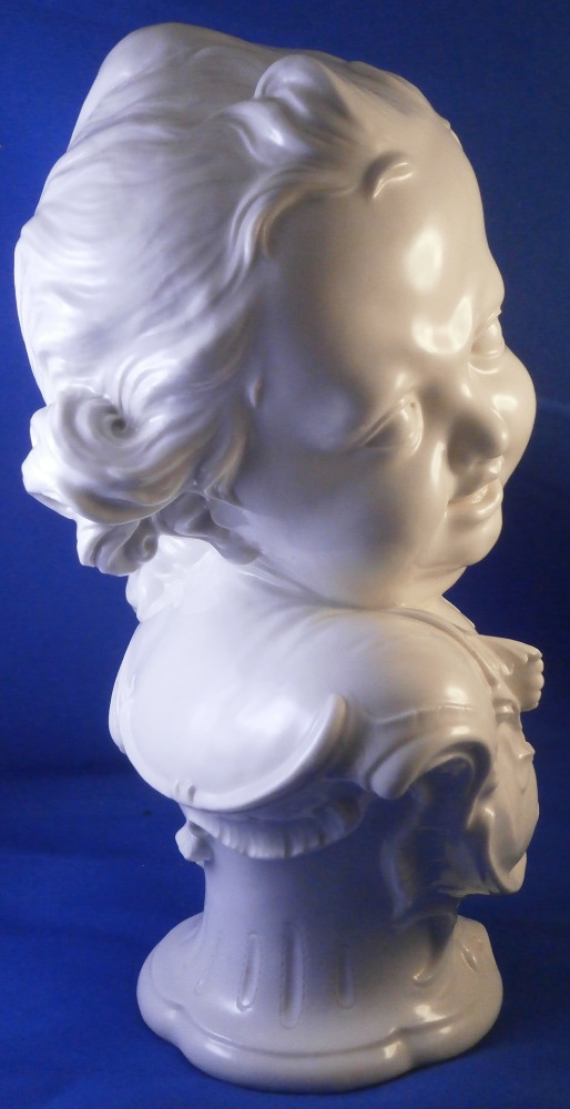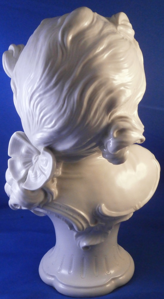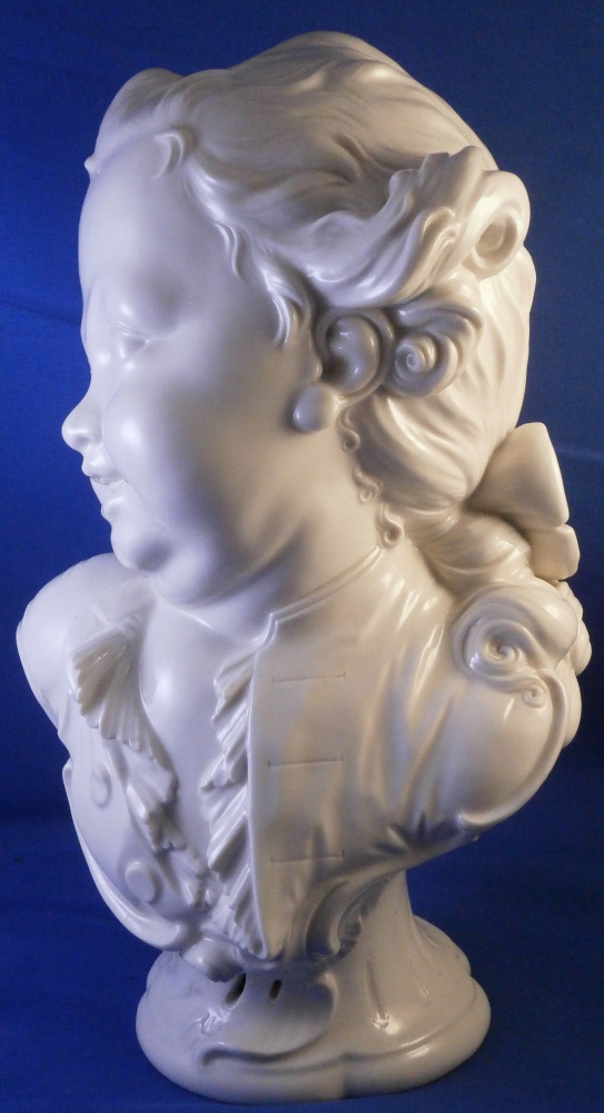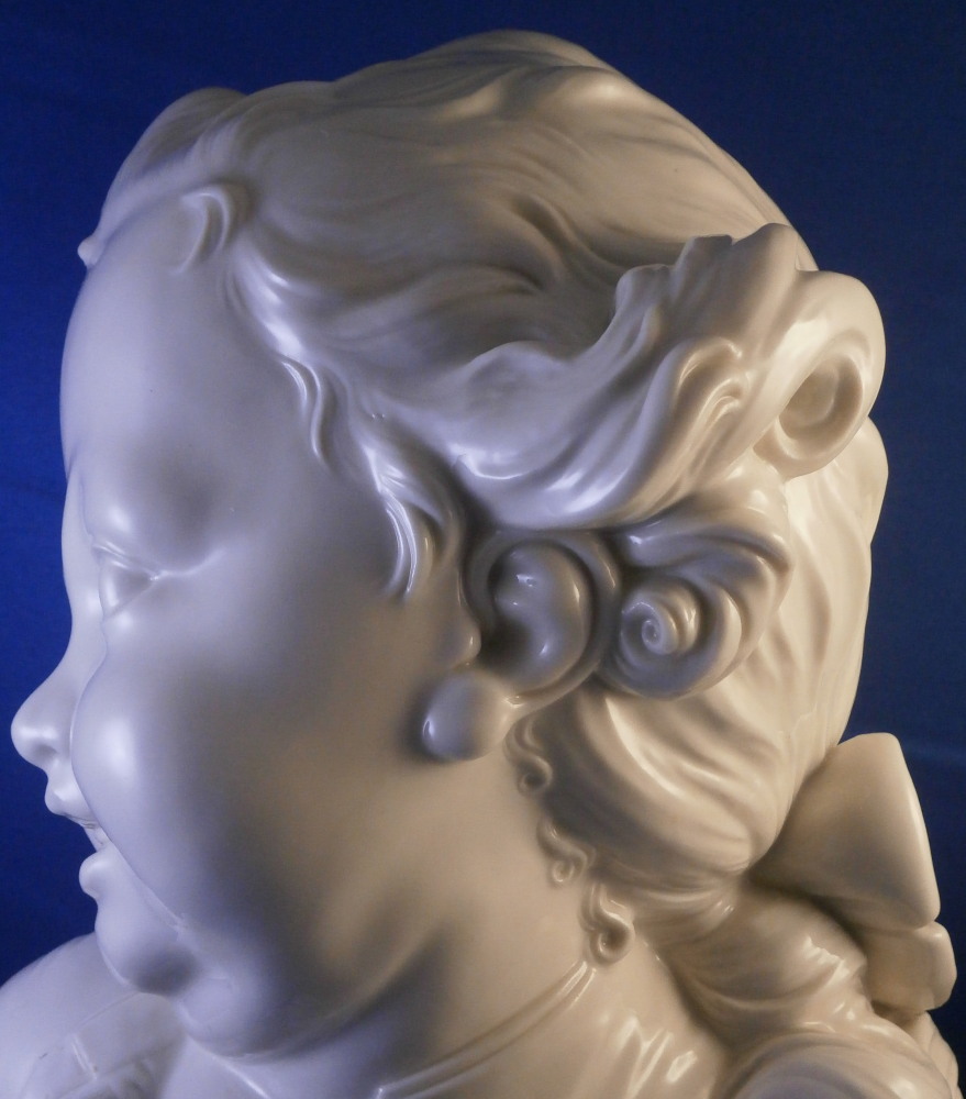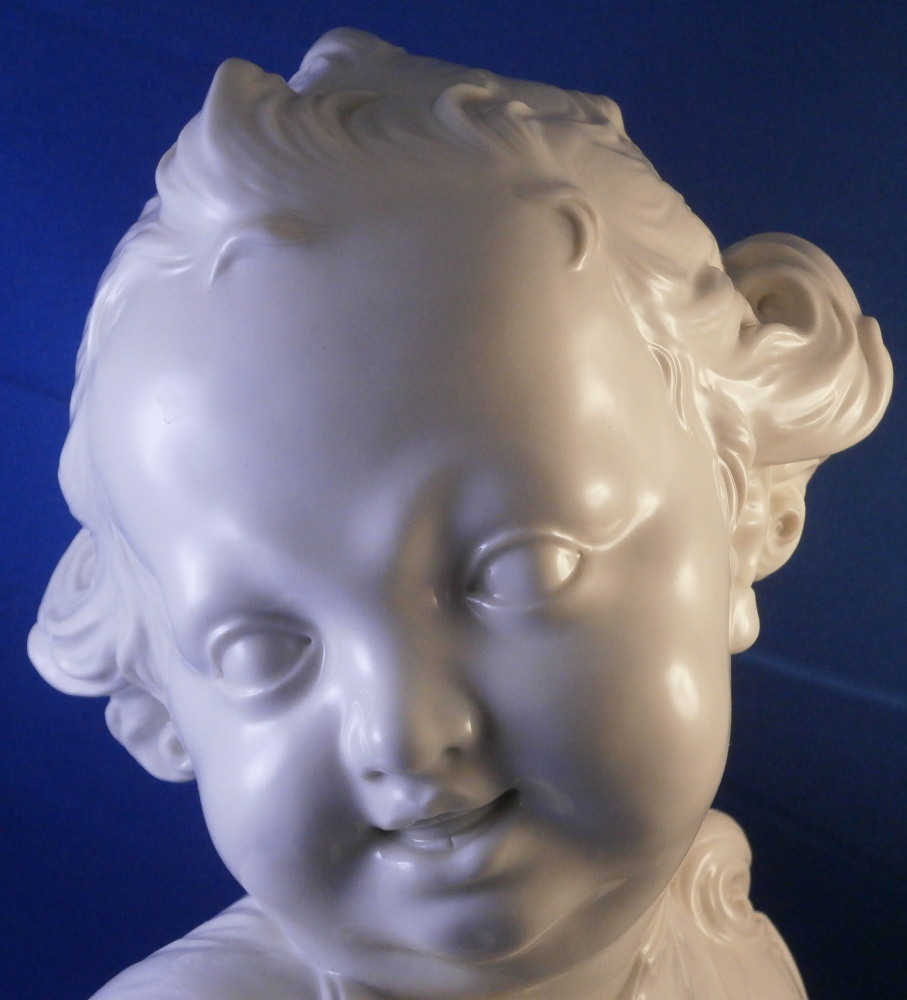 This is a superb blanc de chine bust of a child (believed to be a bust of Friedrich August der Starke aka Frederick the Strong as a child) originally modelled by Franz Anton Bustelli in the 18th century and made by Nymphenburg in the mid 20th century. It is marked in the center front of the base with the impressed shield mark as well as underneath with another impressed shield mark and the number 928 as shown. A superb figurine that is superbly modeled by one of the top masters of the craft with lots of nice detail and it is good size for display! Plus I ahve his amtching sister bust that would make an amazing pair for display! The figure is 10.25 inches tall, 6 inches wide and 4.75 inches deep. The piece is in the same condition as the day it was made. The front of the base has three cut out holes. It is a nice touch! Also marked udnerneath with the green shield mark with Nymphenburg under that aas well as Western Germany under that. Please email me for more information or other pictures.