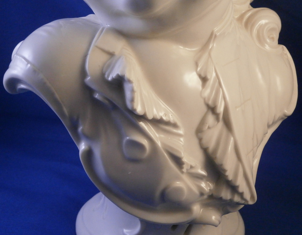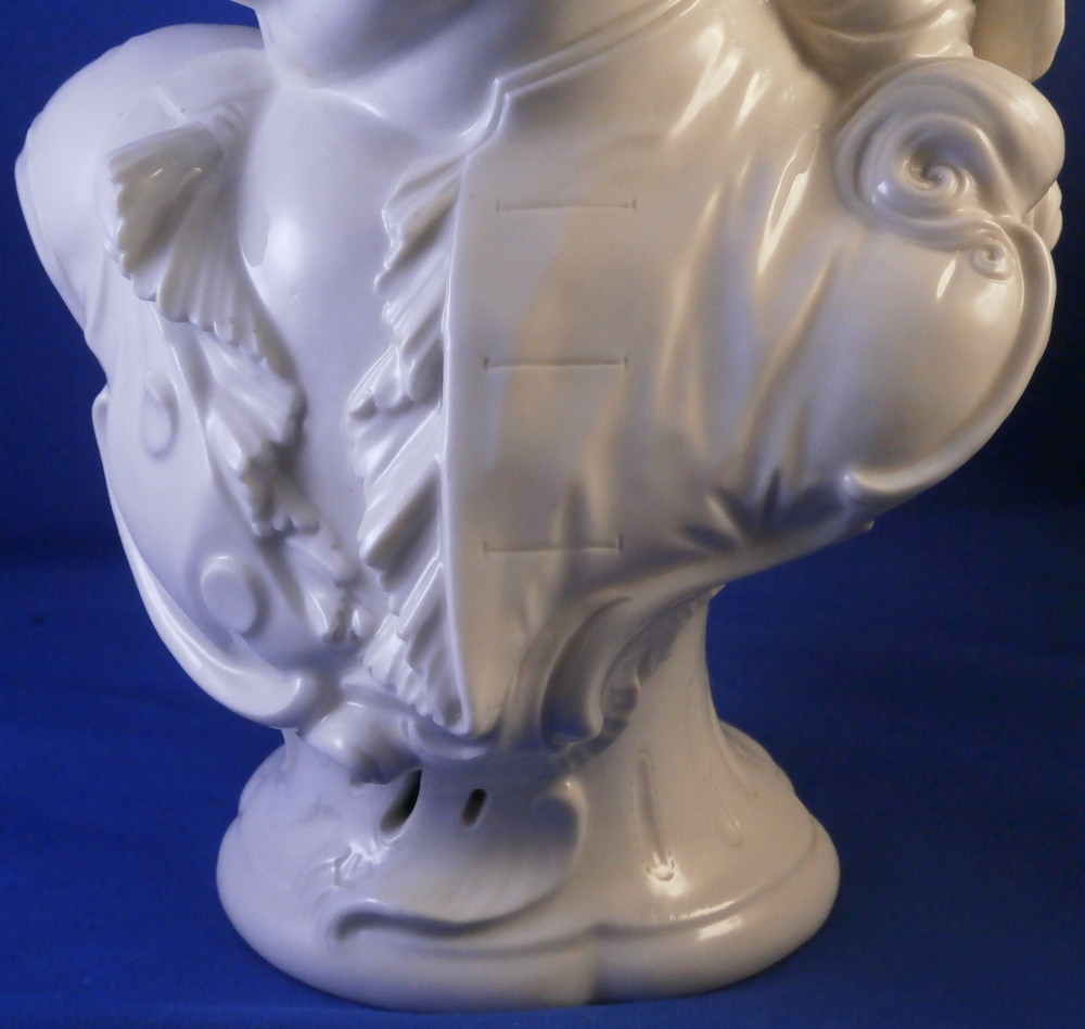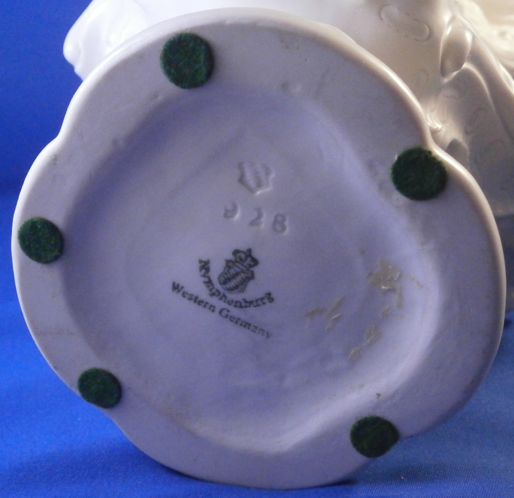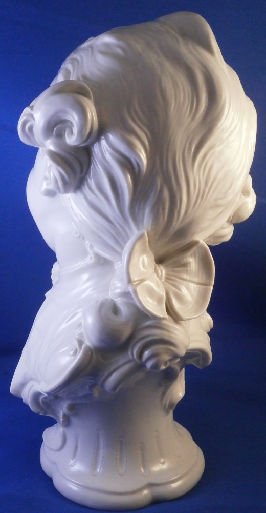 This is a superb blanc de chine bust of a child (believed to be a bust of Friedrich August der Starke aka Frederick the Strong as a child) originally modelled by Franz Anton Bustelli in the 18th century and made by Nymphenburg in the mid 20th century. It is marked in the center front of the base with the impressed shield mark as well as underneath with another impressed shield mark and the number 928 as shown. A superb figurine that is superbly modeled by one of the top masters of the craft with lots of nice detail and it is good size for display! Plus I ahve his amtching sister bust that would make an amazing pair for display! The figure is 10.25 inches tall, 6 inches wide and 4.75 inches deep. The piece is in the same condition as the day it was made. The front of the base has three cut out holes. It is a nice touch! Also marked udnerneath with the green shield mark with Nymphenburg under that aas well as Western Germany under that. Please email me for more information or other pictures.