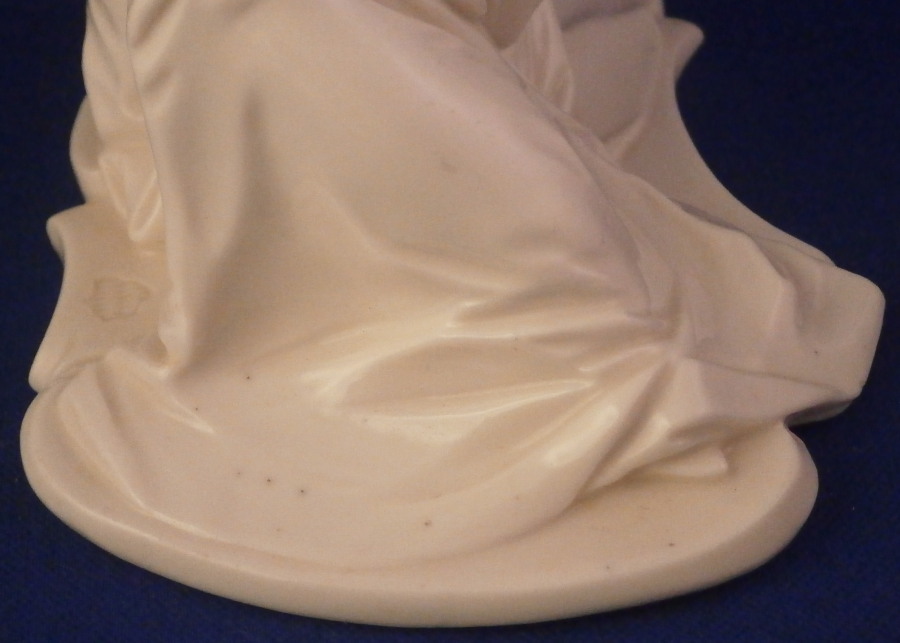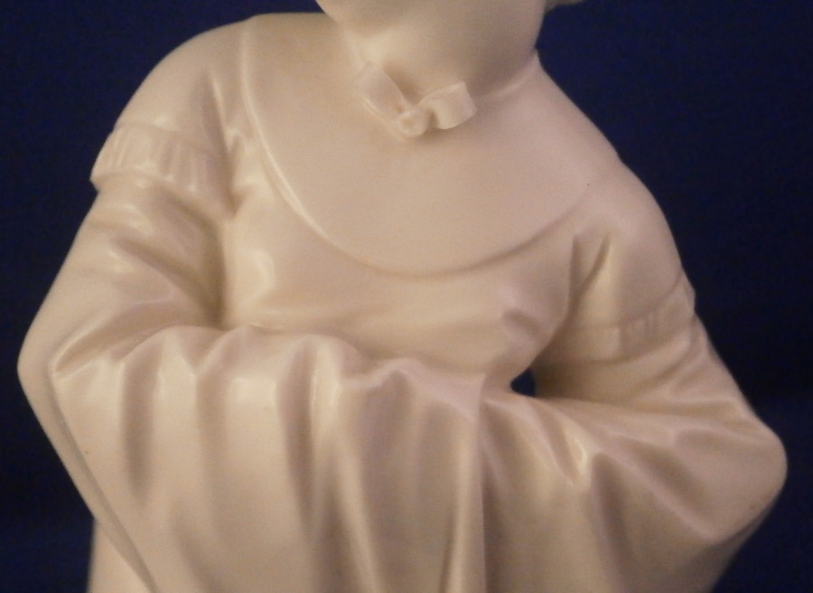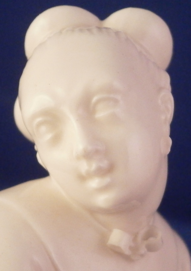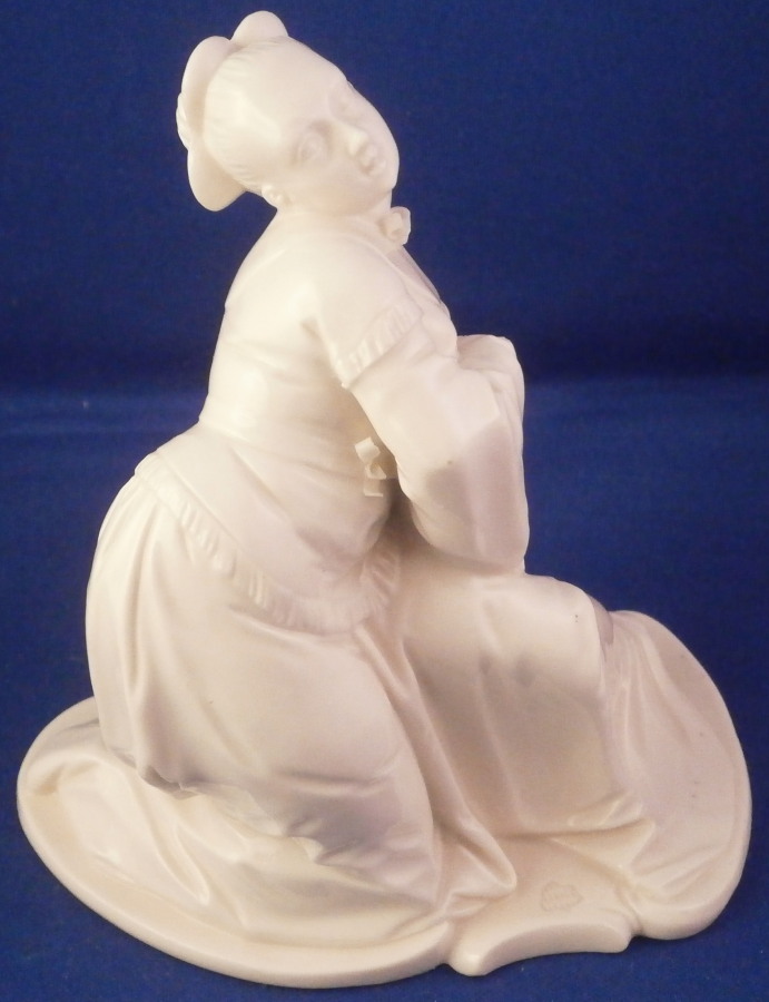 This is a figurine of a Chiense lady - likely a servant - made by Nymphenburg in the early 20th century. Part of the series of figures I have on the site including the bigwig and priests. The figure comes from a series of 17 or 18 figurines I think - this being one of the harder to find pieces. Originally it was off course modelled by Bustelli in the 18th century. This is the blanc de chine version but this also comes in a painted version though I ahve not seen this one in color before. I own a few other pieces from this series as well and they are probably my favorite figures besides the commedia dell'Arte off course. The figurine is of a lady that is likely one of the servants to the bigwig or possibly a lady asking for an audience with the bigwig on his pedestal. She is dressed nicely in a flowing dress with a bow around her neck and another mostly hidden under her arm on the side. She is wearing some sort of hair decoration as well. Lots of little details and all these folds look so realistic which is why Bustelli is still so famous among porcelain nuts like me :) A superb piece that is stunning and elegant looking. The figure is 4.75 inches tall, 3.25 inches wide and 4.5 inches long. It is in great condition with the only flaw being that the hidden bow under her arm has one loop damaged. It does not affect the piece at all when on display. The figurine is marked with the impressed shield mark to the top of the base as well as the impressed numbers 380 and over 0. Please email me for more information or other pictures.