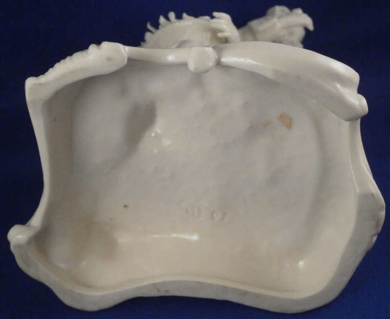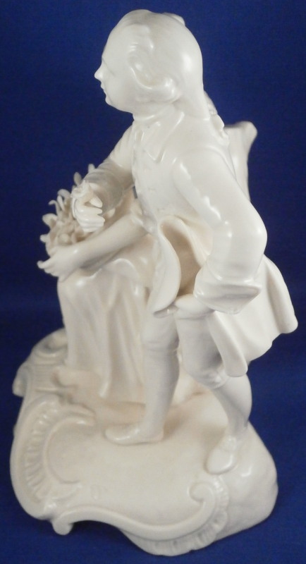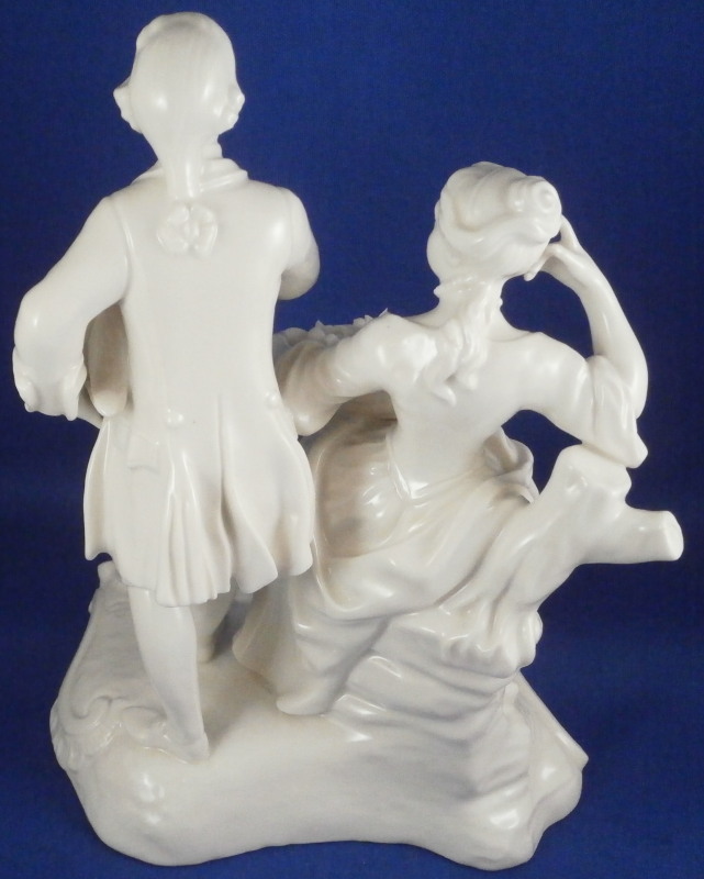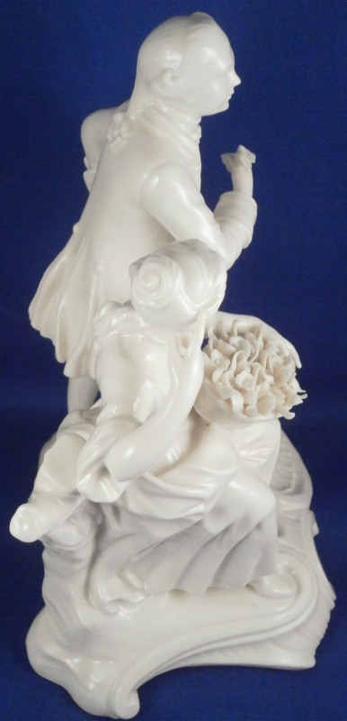 This is a blanc de chine figure of a couple made by Nymphenburg in the 20th century. It is of a lady holding a basket of flowers in her lap while sitting on a tree stump with her suitor next to her who is holding his hat in his left hand and some flowers in his right hand. Nice base with some scroll work to it. Left in the white to show off all that superb modeling of these stunning Nymphenburg figurines. The figurine is 7.25 inches tall, 5.25 inches wide and 4.125 inches deep. Marked with the impressed shield mark to the dge of the side of the base as well as on the underside and impressed numbers 45 over 7. The figurine is in perfect condition which is always nice and quite amazing given the fragile nature of this piece. Please email me for more information or other pictures.