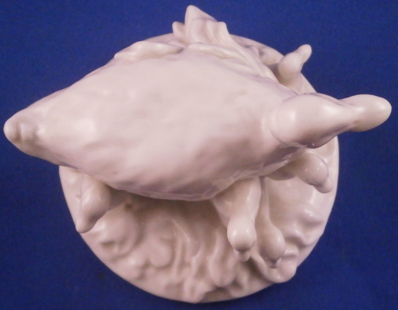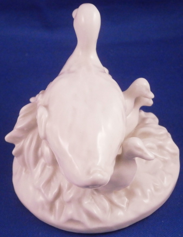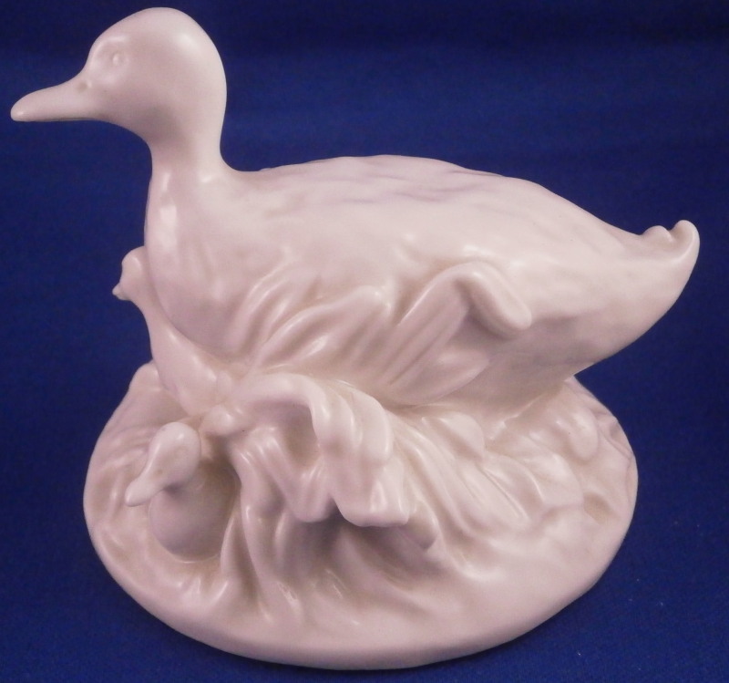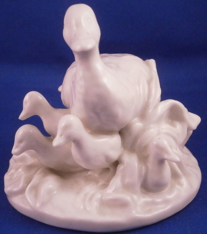 This is a cute figurine of a duck family made by Nymphenburg in the early 20th century. Nicely modeled with the mother duck in the middle, some grasses all around and 5 little ducklings peaking out from udnerneath. Left in the white to show off all that nice modelling detail! The figure is 3 inches tall, 3.125 inches wide and 3.375 inches long. Marked with the impressed shield mark on the underside as well as the incised number 409. A nice early piece before they used the impressed numbers. The piece is in perfect condition. Please email me for more information or other pictures.