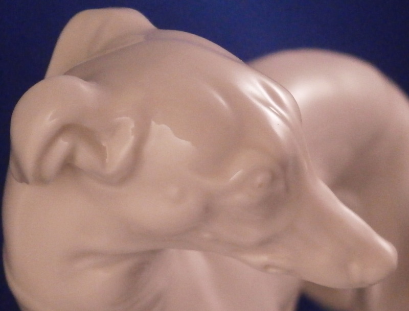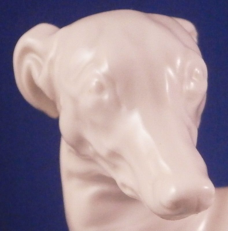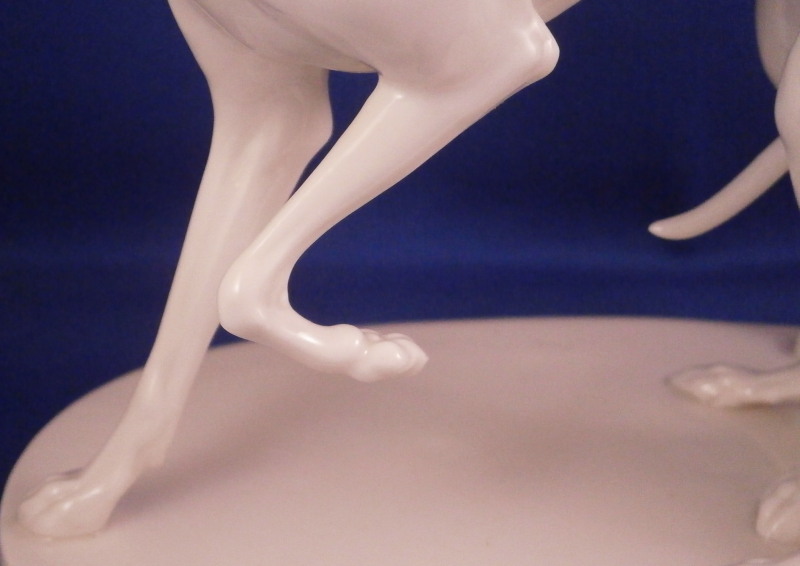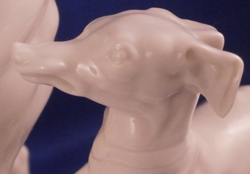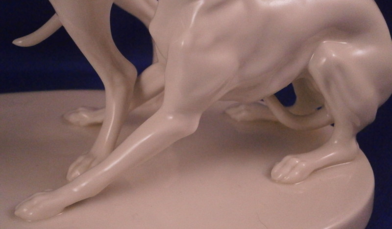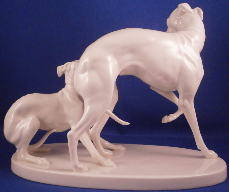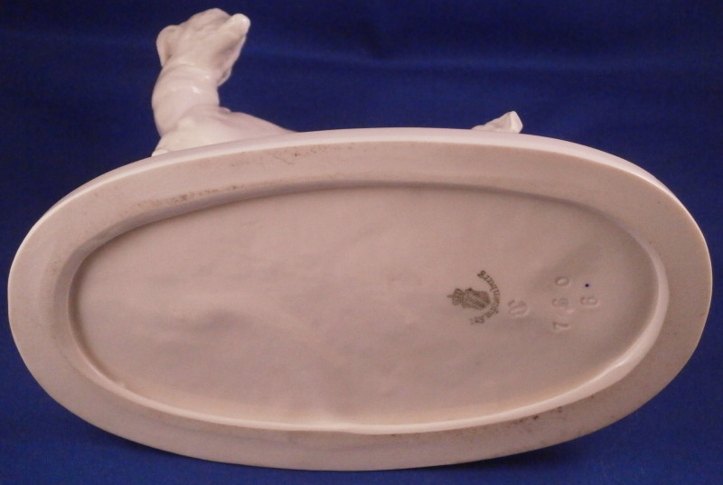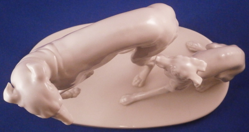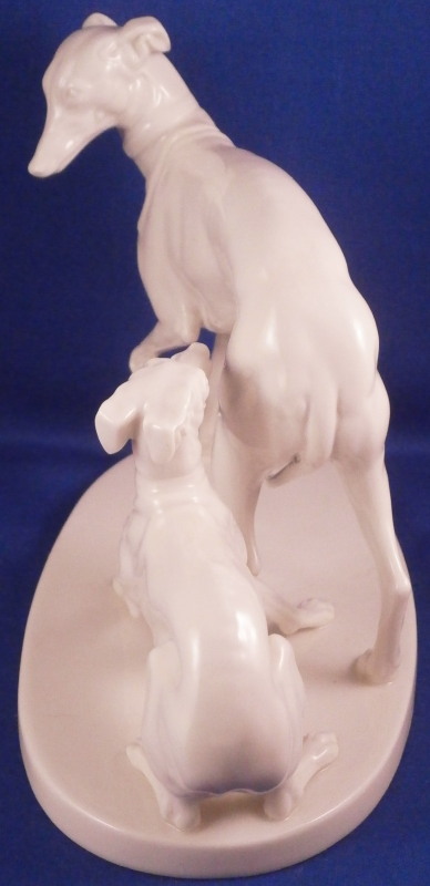 This is a nice figurine of two whippet or greyhound dogs made by Nymphenburg in the early to mid 20th century. You see the single dogs from time to time but this piece is quite hard to find! It is of a mother dog with is young perhaps and was superbly modeled likely after P.J. ( Pierre Jules ) Mene. A very well modeled figurine and in perfect condition which always adds to a piece like this. The figure is 5.25 inches tall, 3.625 inches wide and 6.75 inches long. It is marked with the impressed shield mark on the front side of the base as well as underneath with the model number 760 over 6 impressed. There is also the green shield mark under a crown with the word Nymphenburg underneath that. Please email me for more information or other pictures.