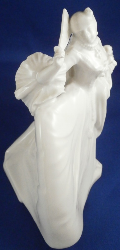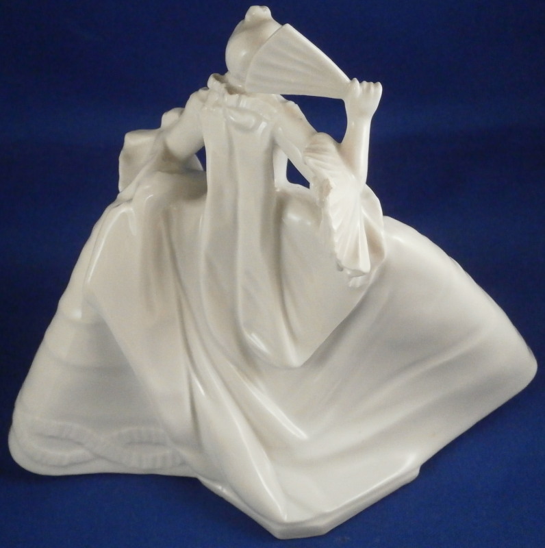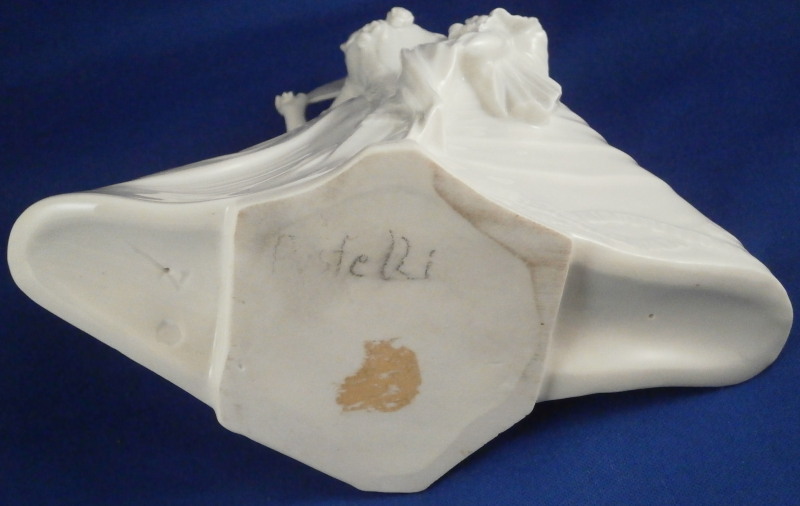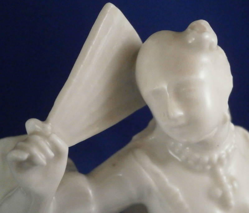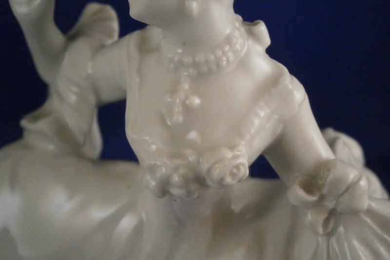This is a superb figurine of a lady made by Nymphenburg in the 19th century. The piece was made from the mold of the original figurines from the 18th century and is thus smaller than the original figurines since porcelain shrinks during the firing process. This was before Baeuml had the pieces remodeled so they'd be the same size as the original pieces. The figure is of a lady wearing a fancy skirt for a ball and holding a fan in her right hand. The figurine was off course originally modeled by Bustelli and was left in the white to show off all that nice modeling detail! She is marked with the impressed shield mark from around the mid to later 19th century - often found with a star above the mark but not here. No impressed numbers were used then but he does have an incised 2 or 7 depending on how you look at it. She is 5.25 inches tall, 6.25 inches wide and 3 inches deep. The figure is in perfect condition and came with her matching gentleman that I have on the site as well if anyone is interested in a pair. Please email me for more information or other pictures.
